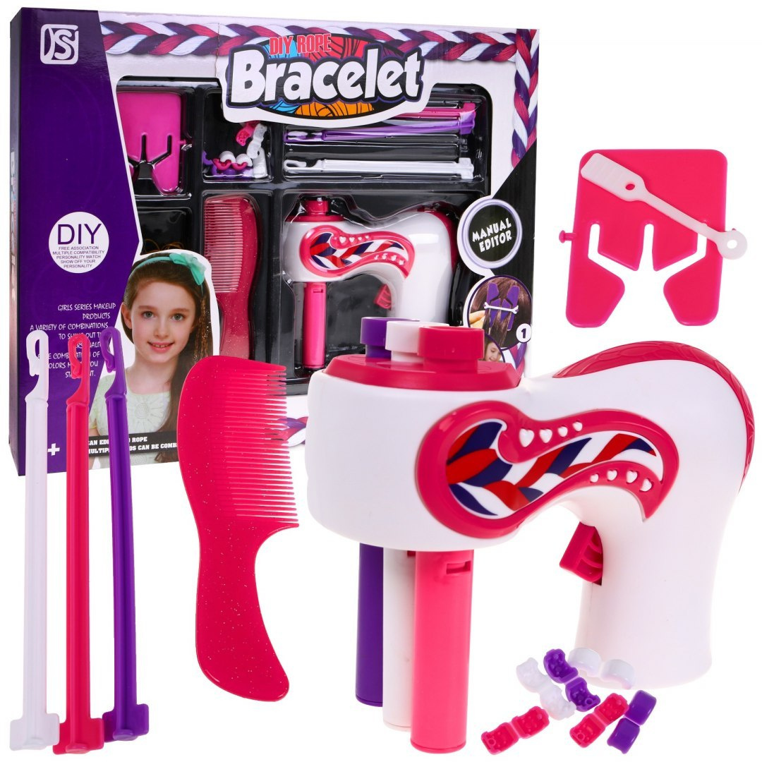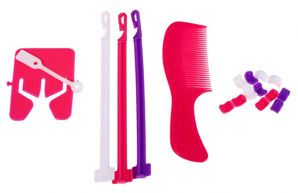 | - pletací strojek, - hřeben, - 6 x ozdoby do vlasů, - oddělovač vlasů, - 3 háčky na pletení, - 20 gumiček do vlasů. | |