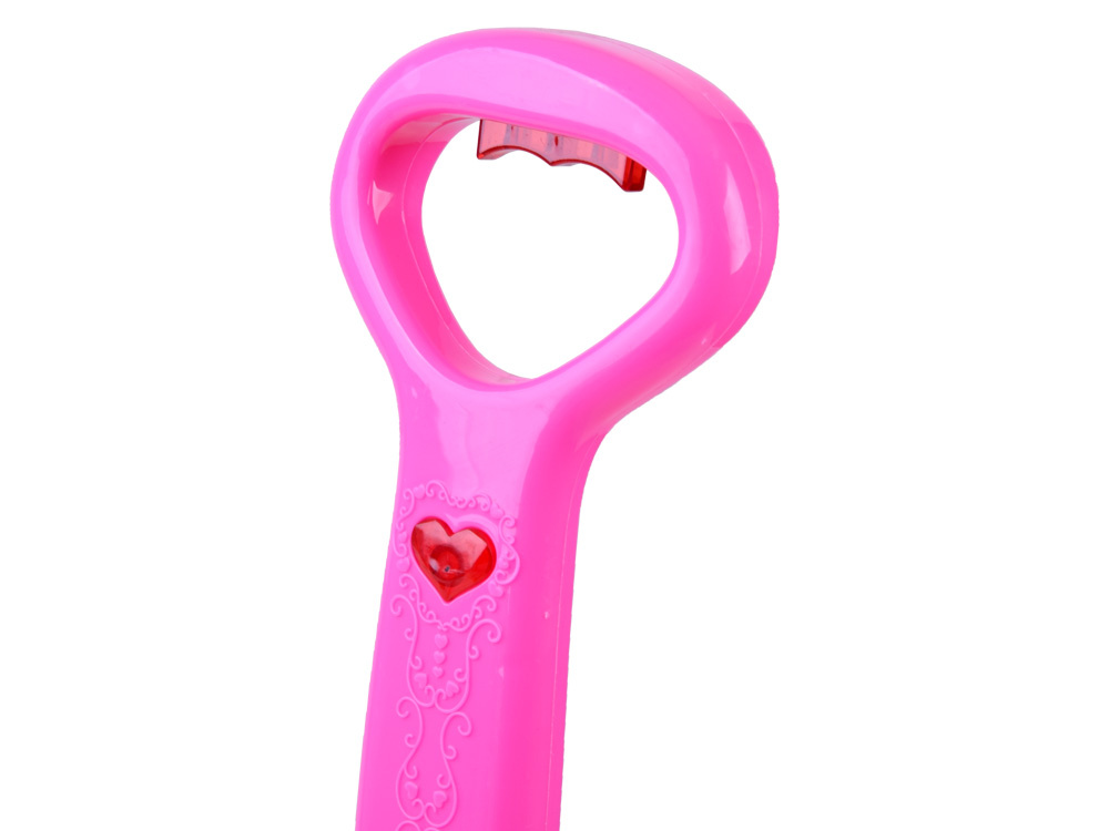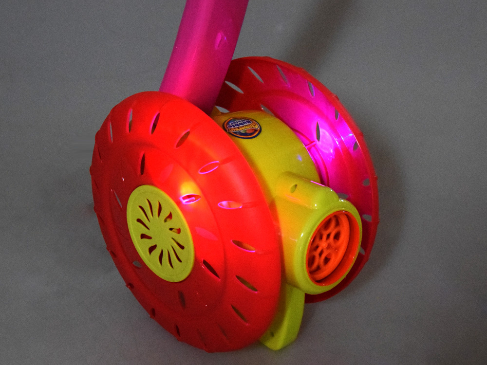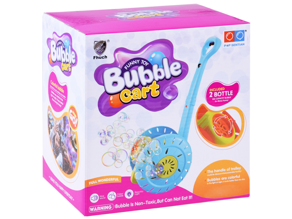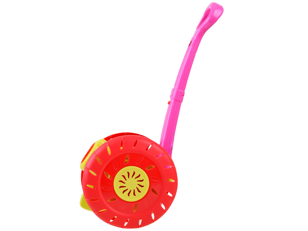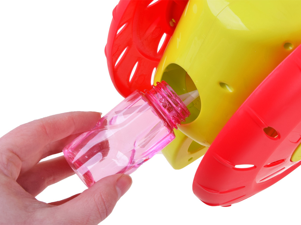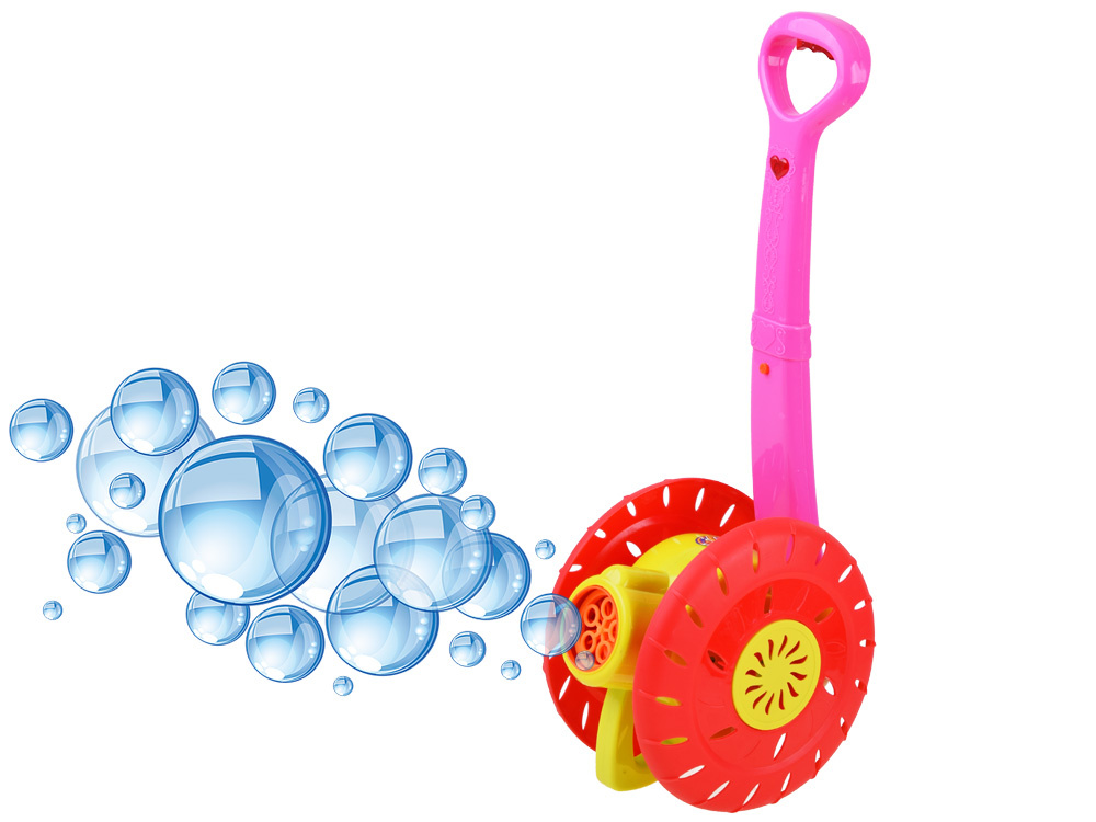 Mýdlové bubliny jsou oblíbenou zábavou malých i velkých dětí.Senzační výrobník mýdlových bublin ve tvaru pěchovadla, naviják , jistě poskytne spoustu zábavy každému dítěti.Hračka umožňuje vypouštět barevné bubliny z automatu. Stačí našroubovat láhev s tekutinou na dno bubnu, zapnout tlačítko na rukojeti tlačného mlýna, čímž se aktivuje větrný mlýn a otáčení disku, který při otáčení uvolňuje kouzelné duhové bubliny. To ale není vše, zatímco hraje veselá melodie a blikají barevná světla.