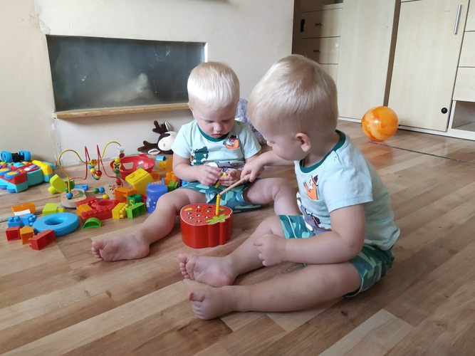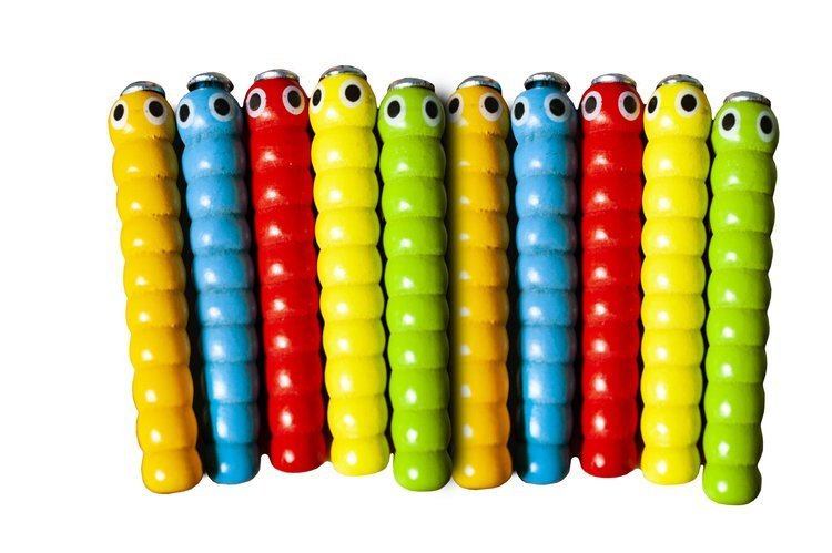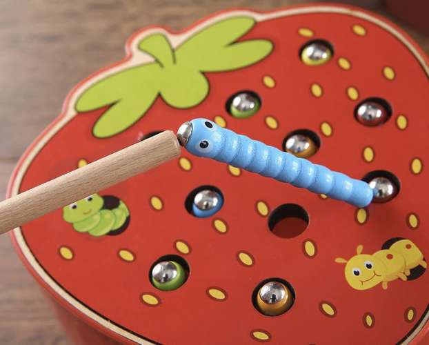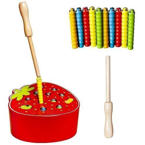 V této magnetické hře děti soutěží, kdo naloví pomocí magnetků připevněných na udičkách více červíků.