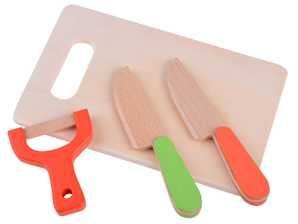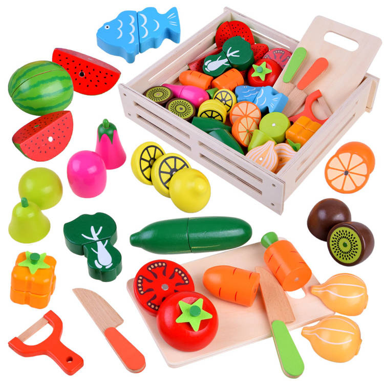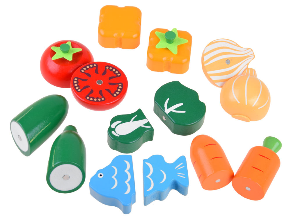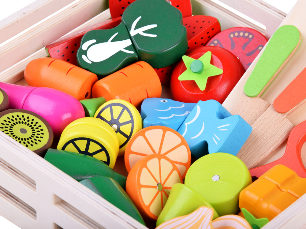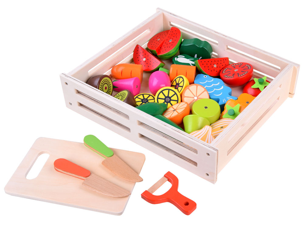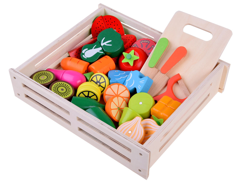 Dřevěná zelenina a ovoce ke krájení v přírodním boxu s prkénkem a bezpečnostními noži. Soubor přirozeně rozmnožených druhů zeleniny, ovoce a ryb přinese kulinářské revoluce. Děti rády napodobují dospělé a jejich každodenní činnosti, taková sada je pro ně výzvou. Zelenina, ovoce v půlkách mají připevněné magnety, takže se dají snadno rozdělit a dítě si může procvičit ruce tím, že je rozkrojí na půlky a meloun dokonce na čtvrtky. Skvělý způsob, jak povzbudit malé kuchaře ke hře.