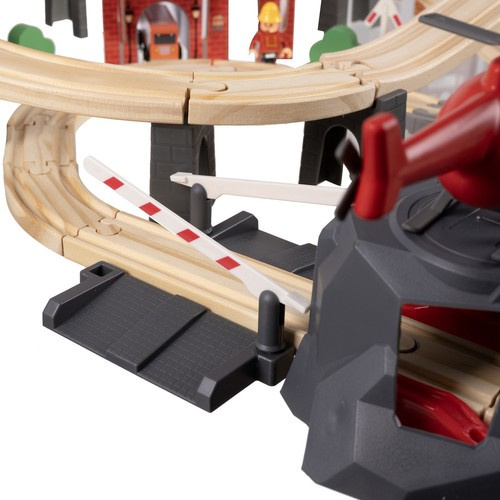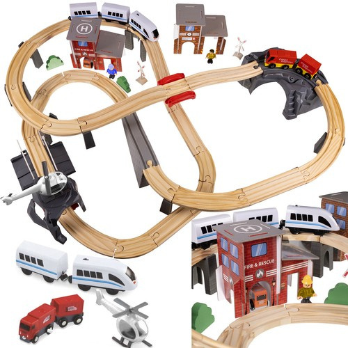 - dominantní materiál: dřevo, ostatní: PP + ABS + železo + magnet + papír) - sada obsahuje 44 kolejových prvků, 2 stromy, 2 značky, 2 budovy, 2 závory, 2 figurky, 1 osobní vlak, 1 vrtulník, 1 hasičský sbor , 1 nákladní automobil s návěsem