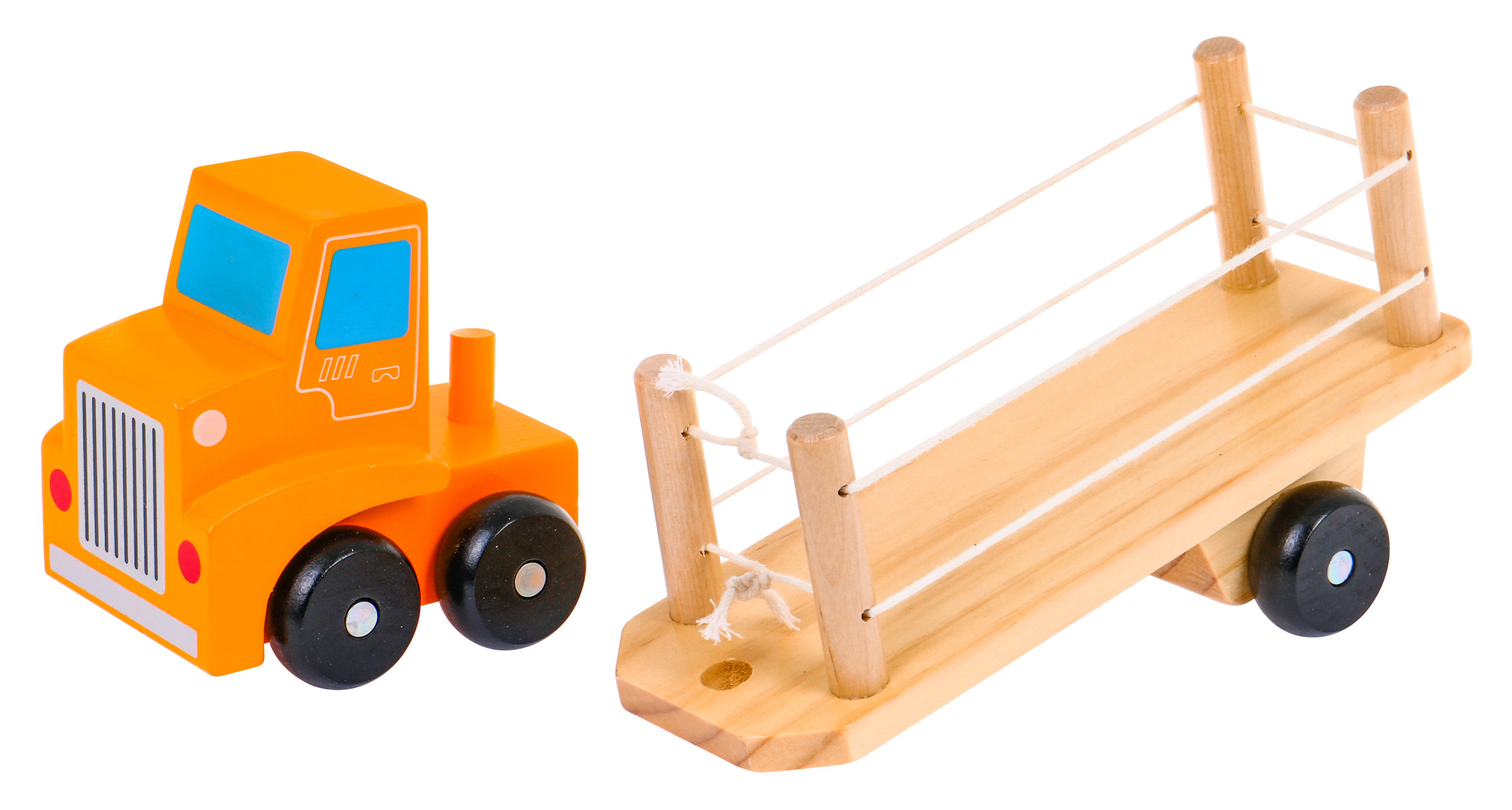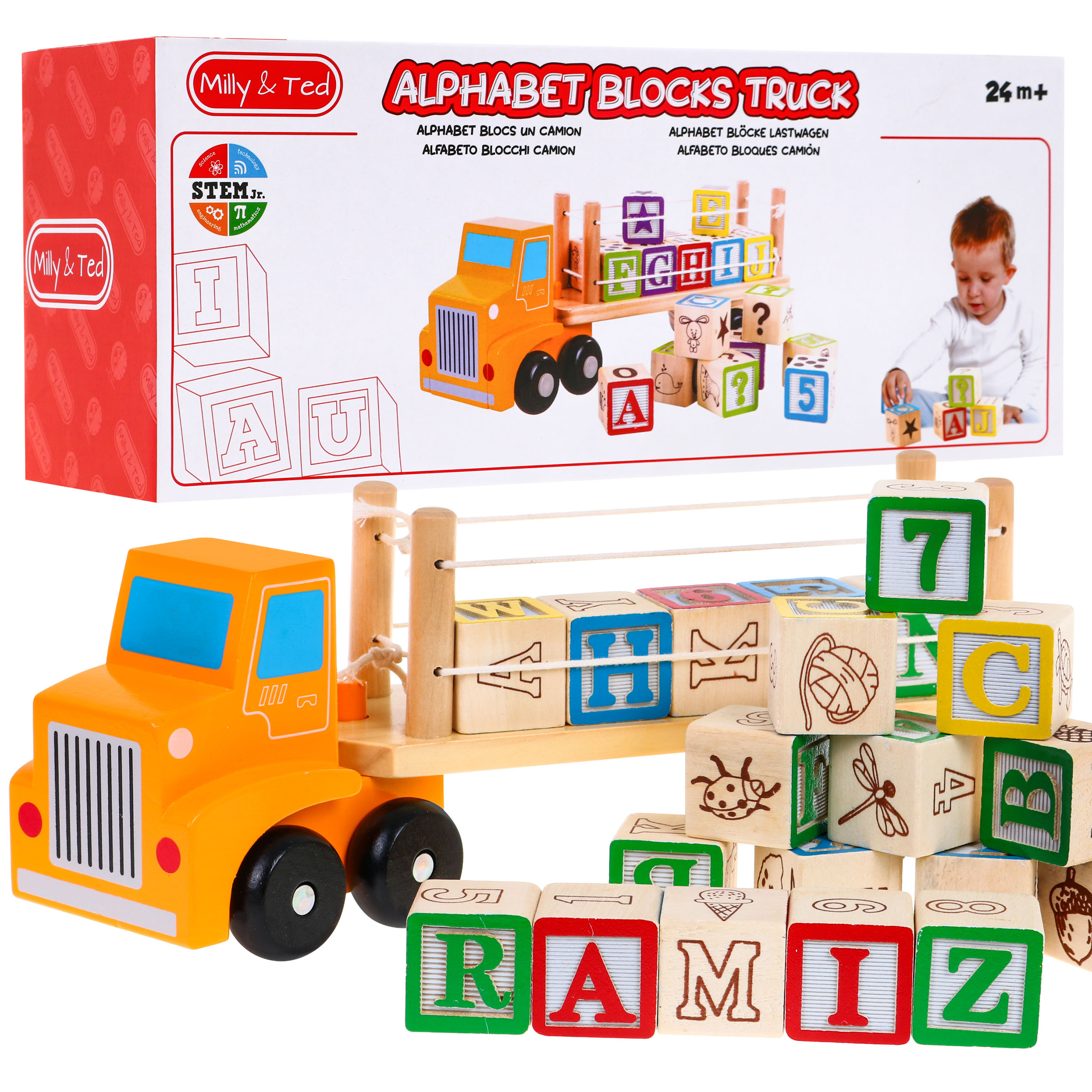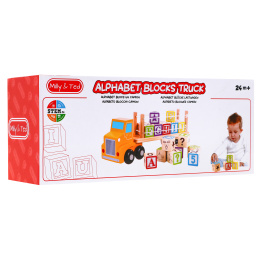 Dřevěný náklaďák s kostkami je bezpečná hračka pro batolata již od 2 let. Tato sada je kombinací učení a zábavy. Rozvíjí motoriku, manuální zručnost a koordinaci oko-ruka. Sada obsahuje 20 dřevěných kostek s písmeny abecedy a kresbami. Po skončení hry lze všechny cihly naskládat na přívěs nákladního auta.