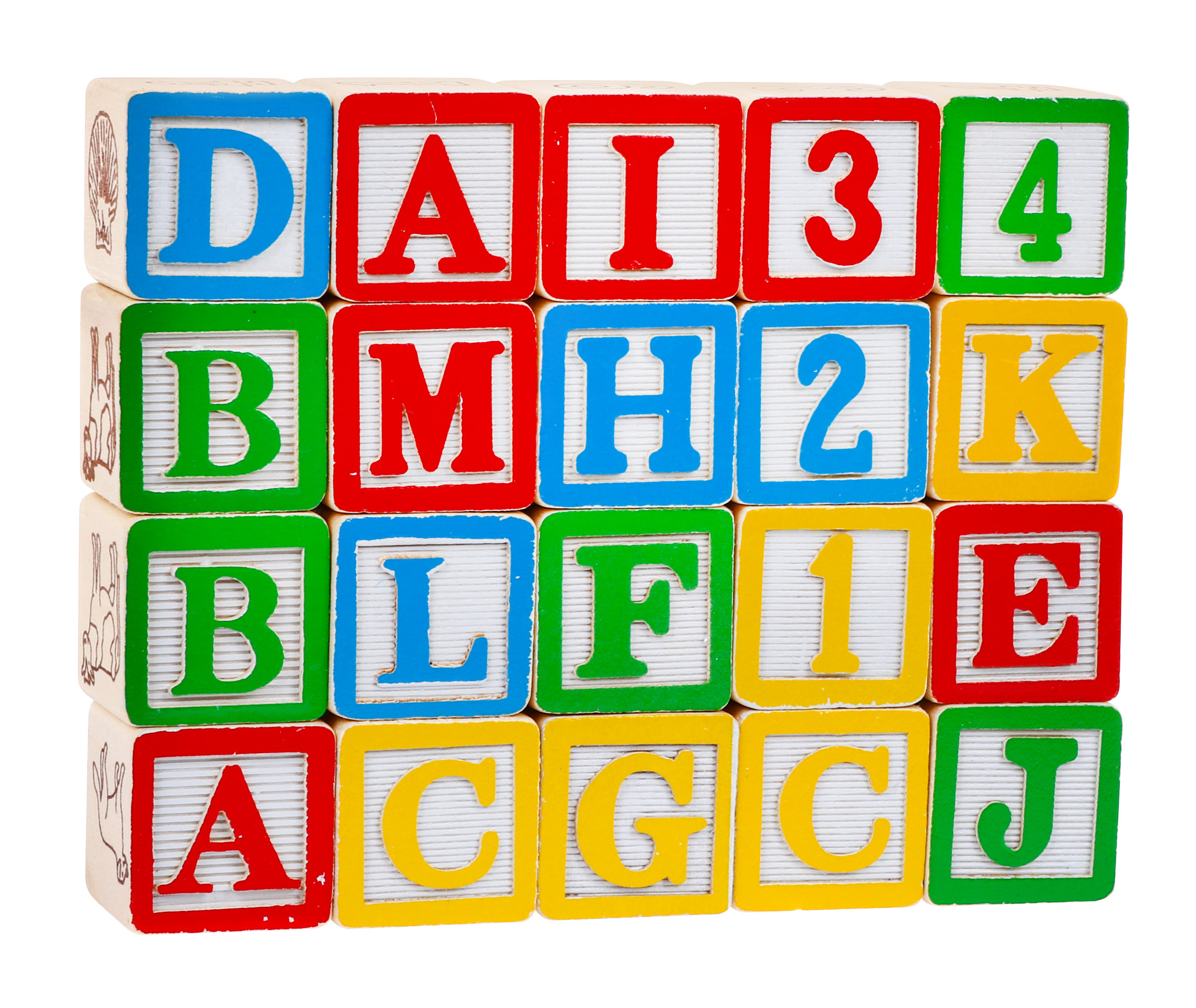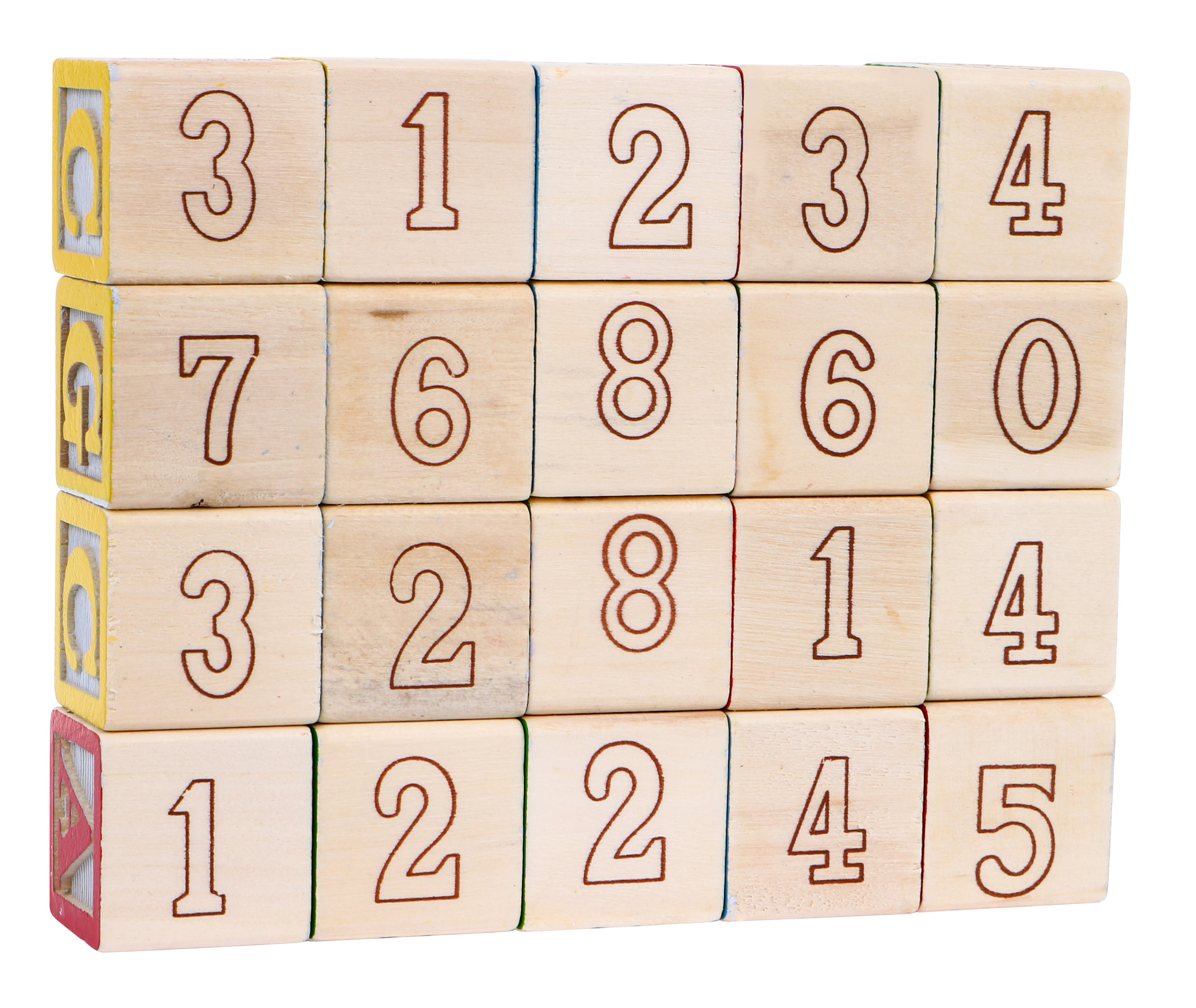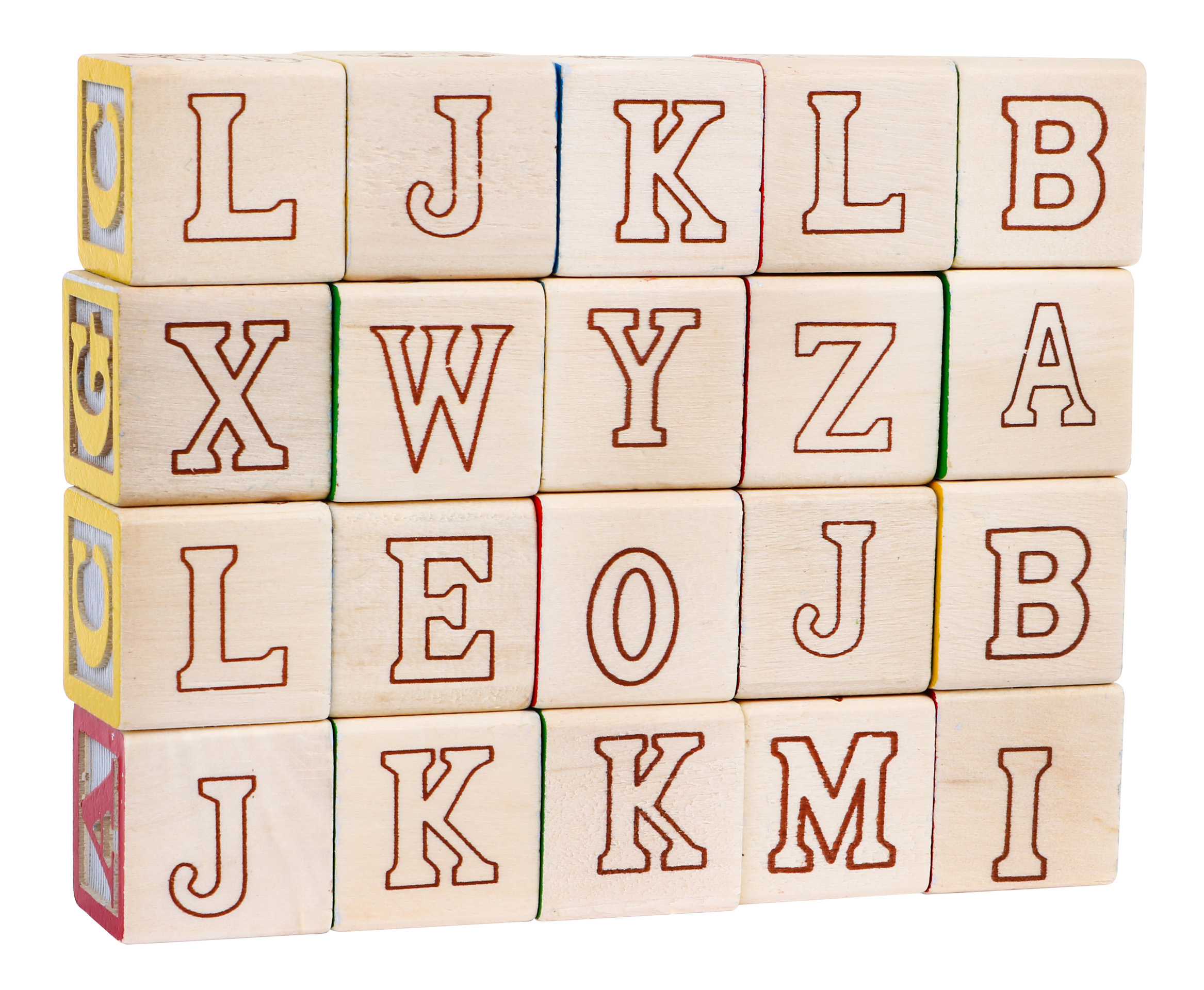 - 20 dřevěných kostek s kresbami a písmeny abecedy.