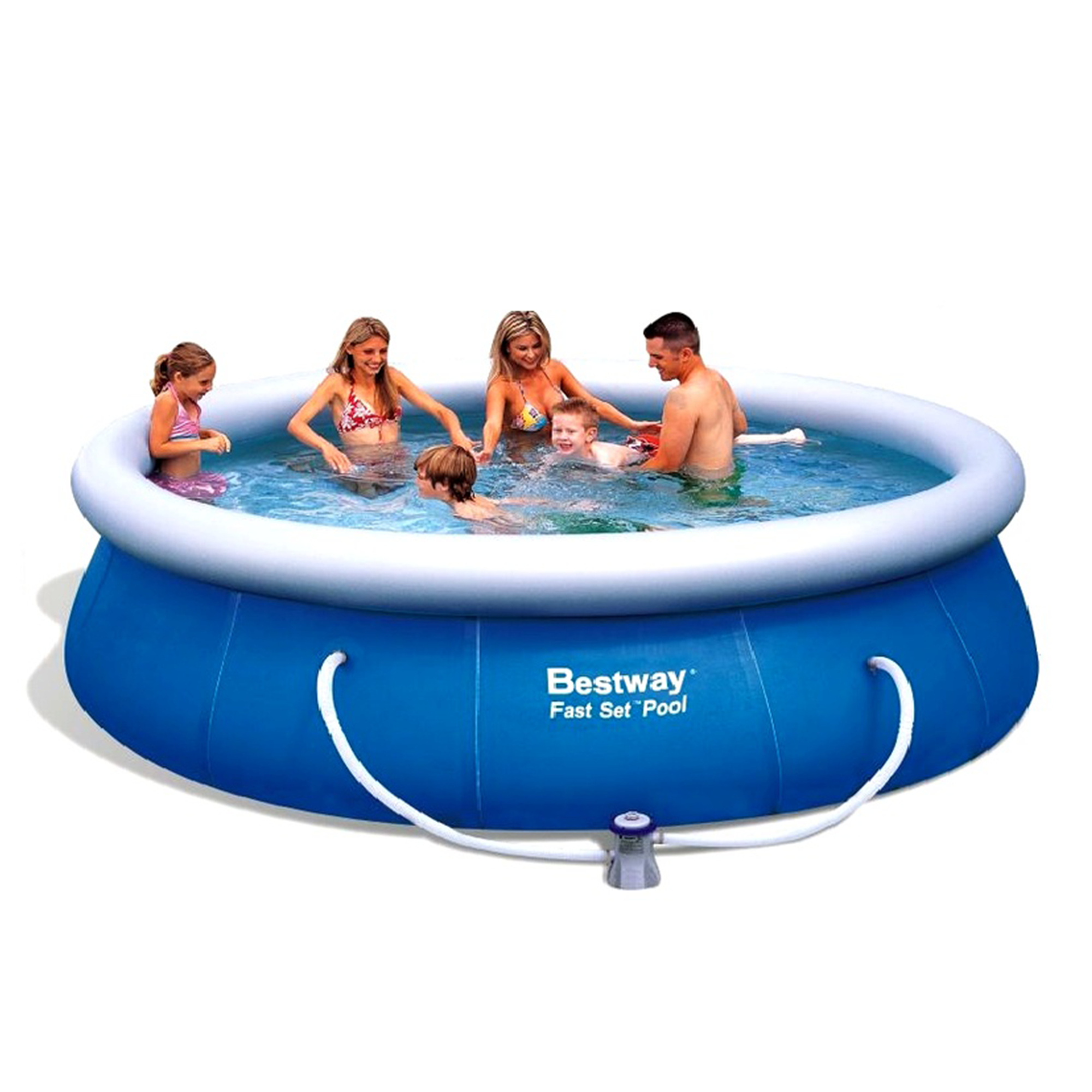 Nadzemní kruhový rodinný zahradní bazén, od italské firmy Bestway. Bazén je samonosný, stačí pouze nafouknout horní prstenec a bazén napustit vodou. Stoupající sloupec vody bazén sám postaví.