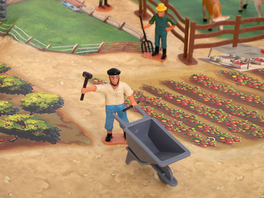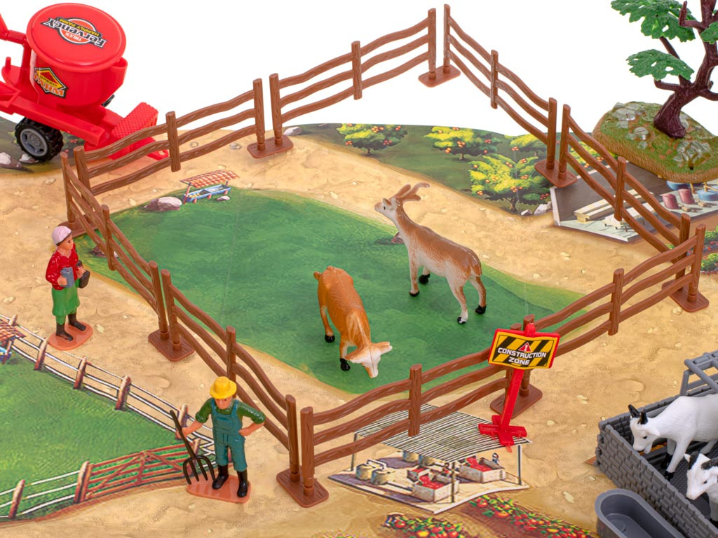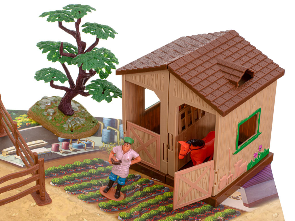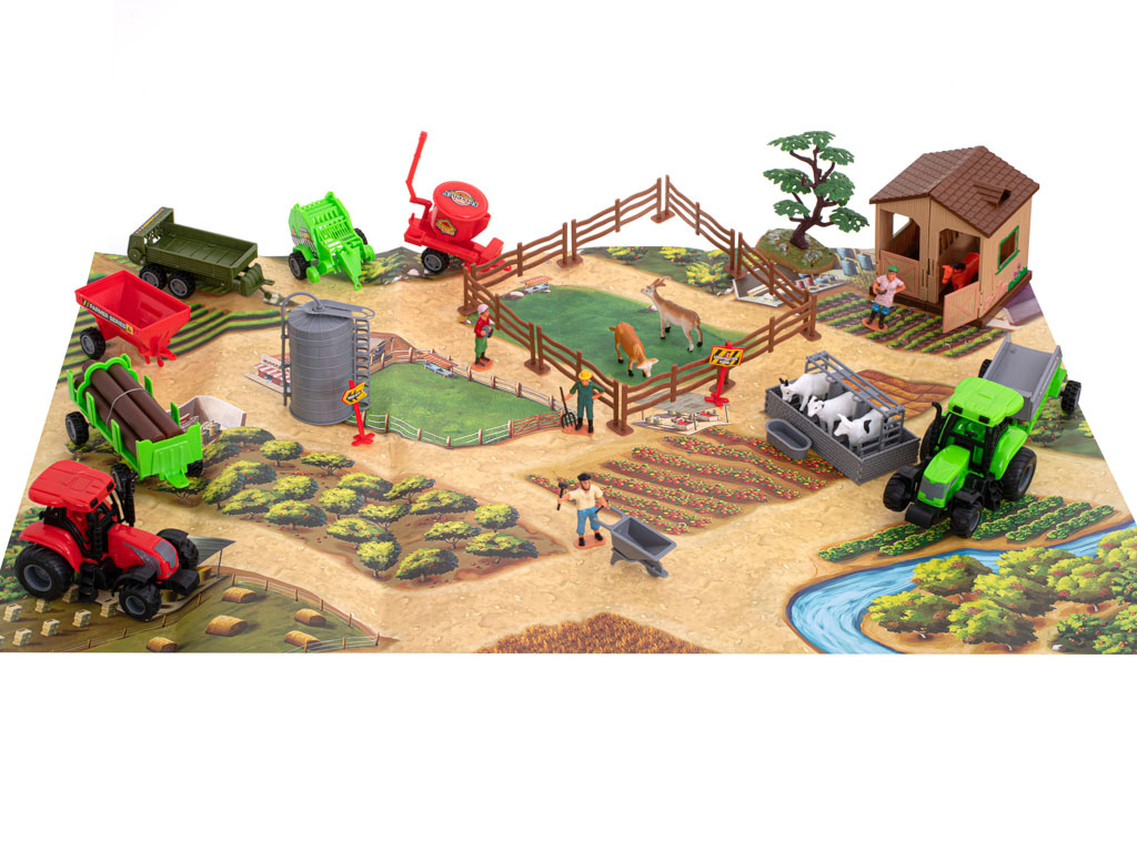 Super farma se zvířaty a stroji. Dítě se tak seznámí s realitou života na venkově. Sada rozvíjí představivost a kreativní myšlení. Sada obsahuje 49 prvků, m.in.: traktor, silo, trakař, strom. Rozměry. traktor: 16x10x10cm.Celý popis