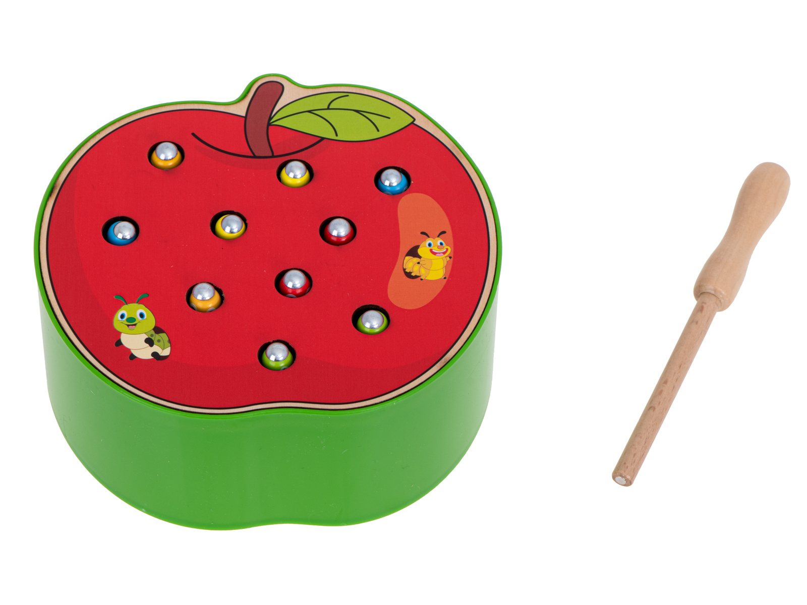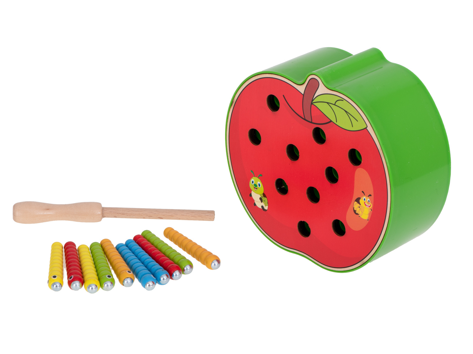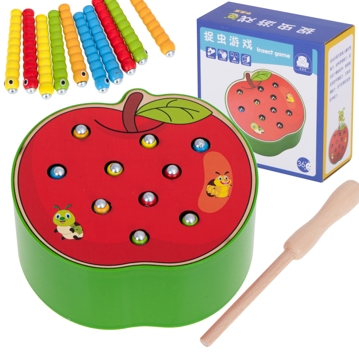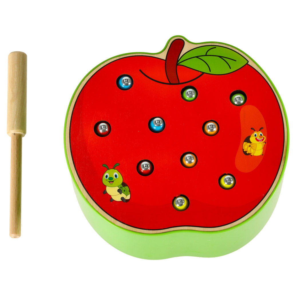 Hra je vyrobena ze dřeva, okraj základny je navíc vyztužen plastem. Součástí je základna ve tvaru jahody, která ukrývá 10 barevných housenek ze dřeva a kovu, dřevěnou hůlku s magnetem na konci. Úkolem dítěte je "chytit" housenky na magnet a odstranit je z podstavce. Obtížnější verze spočívá v umístění červů zpět do základny.