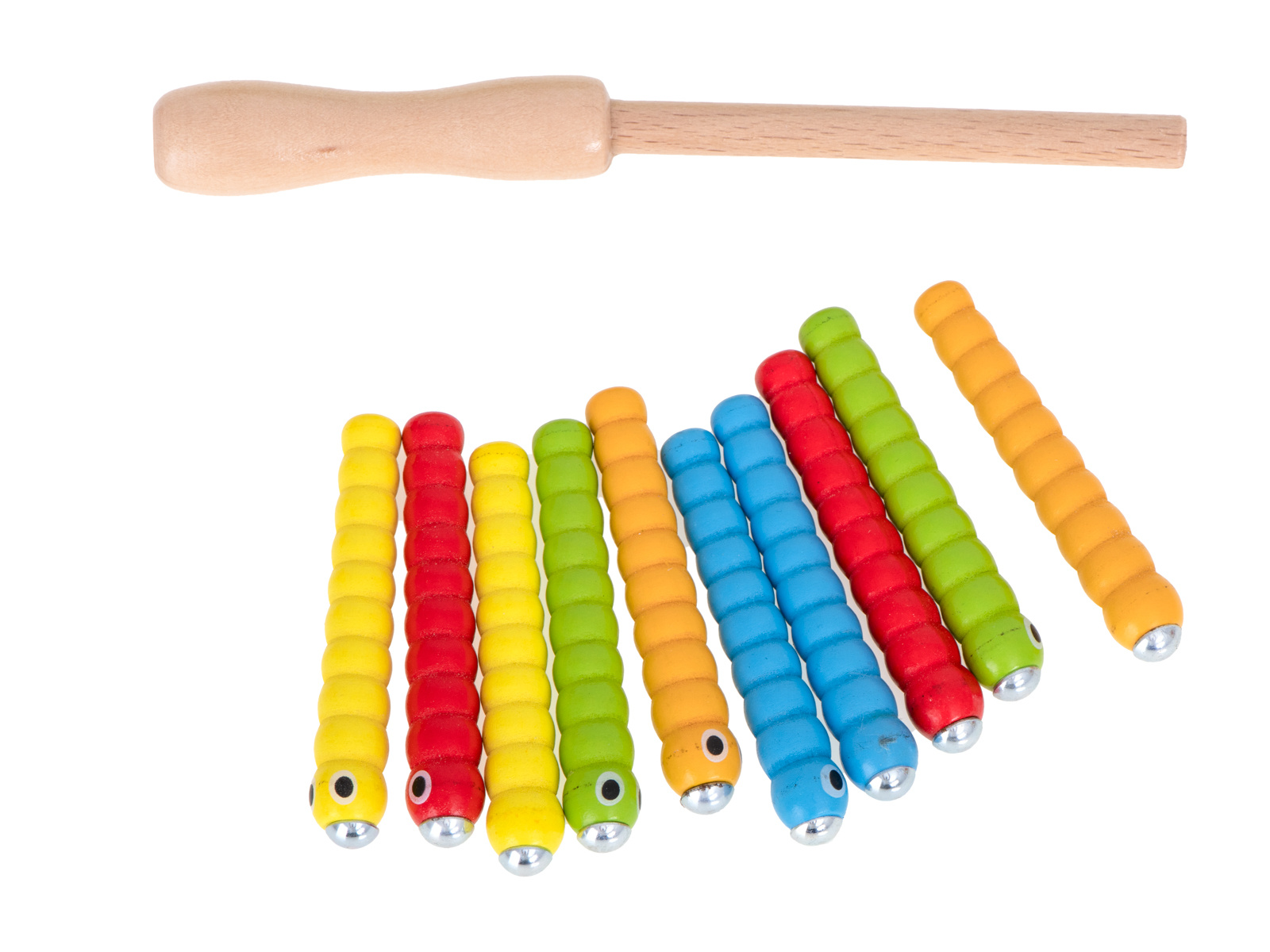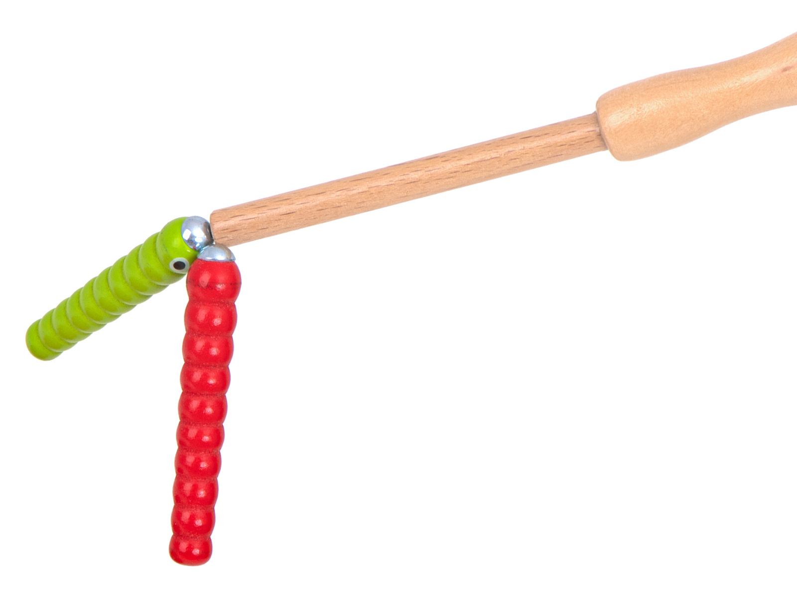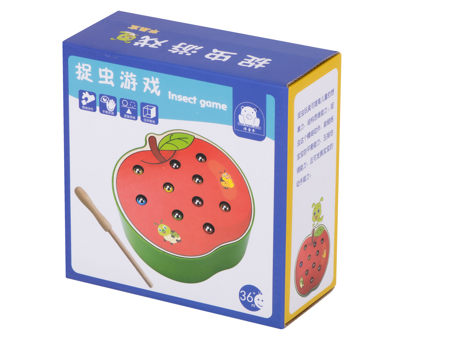 Hra je vyrobena ze dřeva, okraj základny je navíc vyztužen plastem. Součástí je základna ve tvaru jahody, která ukrývá 10 barevných housenek ze dřeva a kovu, dřevěnou hůlku s magnetem na konci. Úkolem dítěte je "chytit" housenky na magnet a odstranit je z podstavce. Obtížnější verze spočívá v umístění červů zpět do základny.