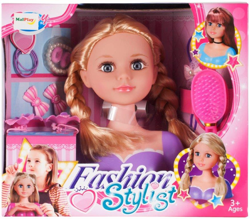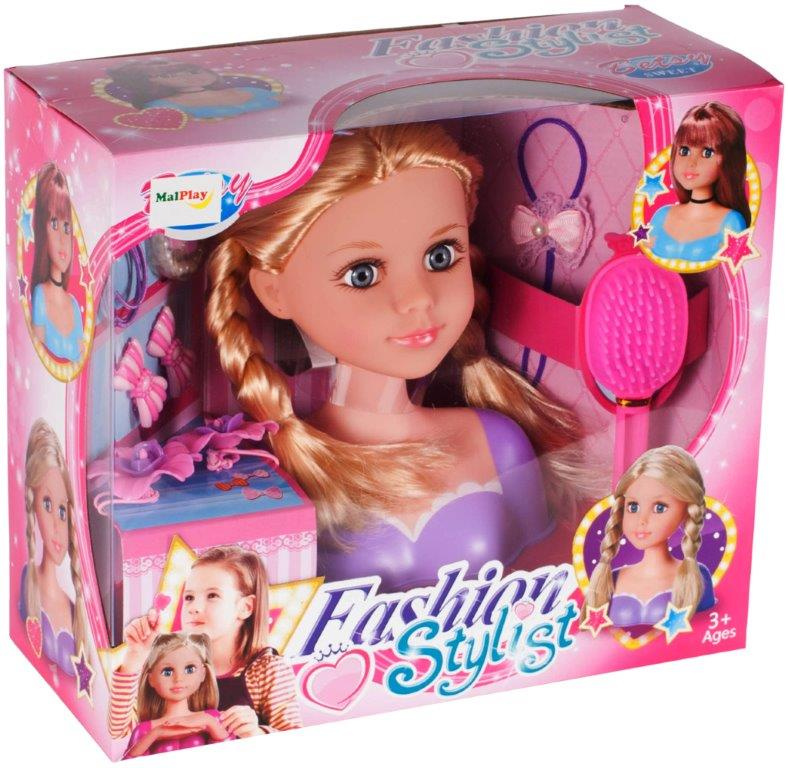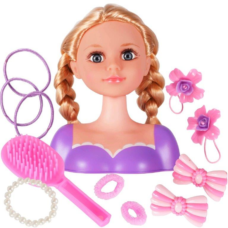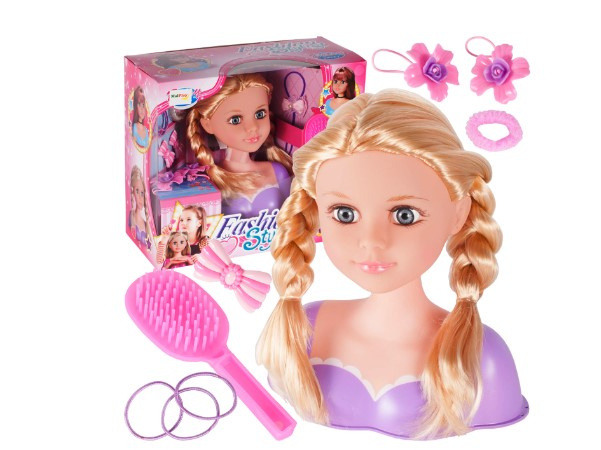 Super hlava pro styling a česání. Všem dívkám se bude líbit. Díky rozmanitosti doplňků může každý malý stylista vytvořit velké množství účesů. Obsahuje: poprsí panenky, gumičky, kartáč, náramek, sponky. Rozměry. panenky: 20x17,5x9cm.