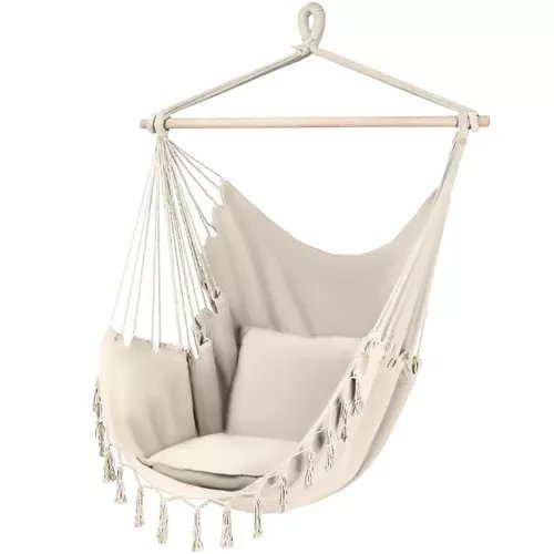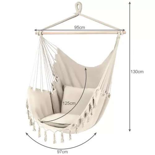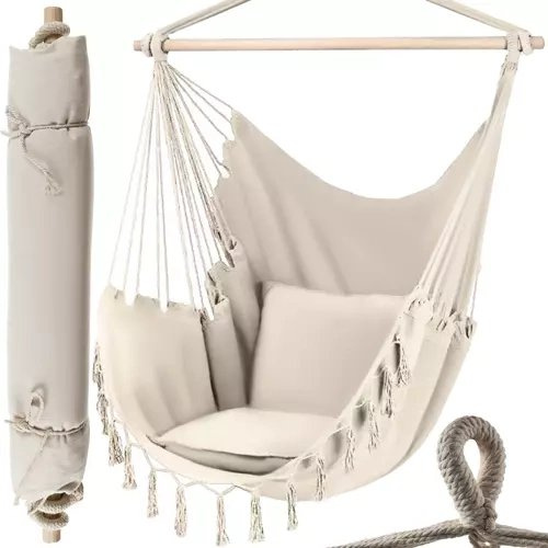 ODOLNÝ MATERIÁL - 65% bavlna zajišťuje správnou ventilaci , což ovlivňuje komfort používání závěsného křesla i v horkých dnech . Za pevnost sedáku je zodpovědná 35% příměs polyesteru. Pevný montážní kolo je připojeno k odolná lana , rovnoměrně rozmístěná po stranách houpací sítě přes dřevěnou příčku. Tato konstrukce tvoří celek snadno se zavěsí a houpací síť je dobře vyvážená a stabilní .