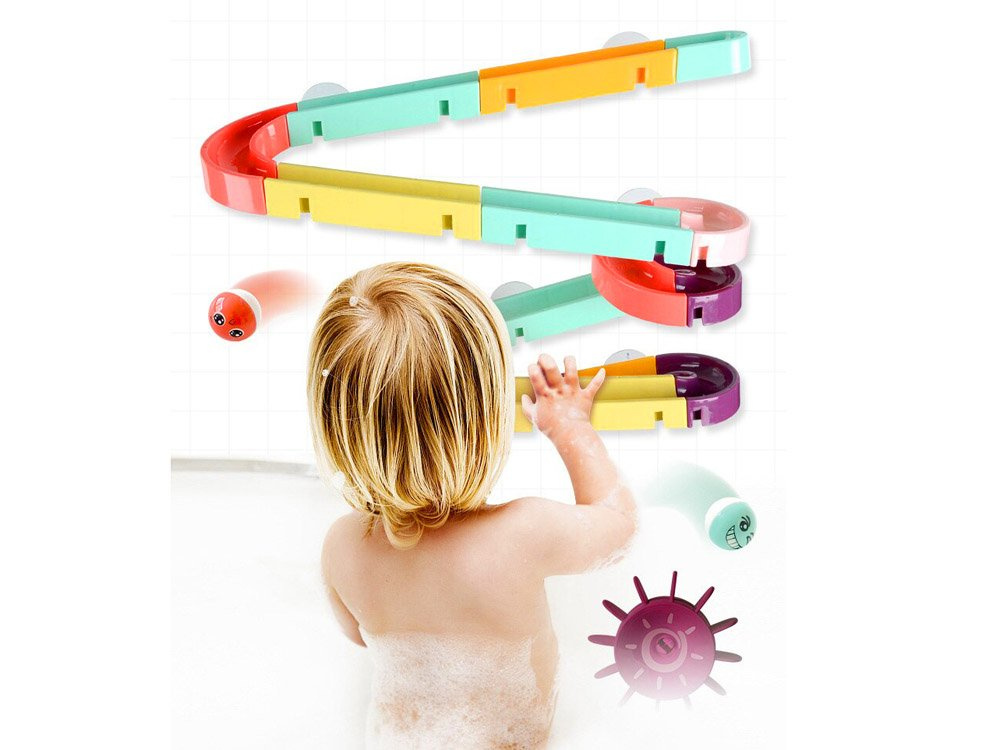 Sada je vyrobena z plastu a má silikonové přísavky, takže dráhu lze připevnit k obkladům v koupelně. Součástí balení jsou barevné dílky k sestavení točité dráhy, gumové kachničky, míčky, fazole a sítko. Při koupání může dítě vymýšlet fantastické hry s prchající kachničkou, honícím míčkem a válci, které lze přilepit vedle sebe, aby dítě mohlo točit oběma najednou. Sada se skládá ze 44 dílků, ze kterých si můžete postavit skluzavku.