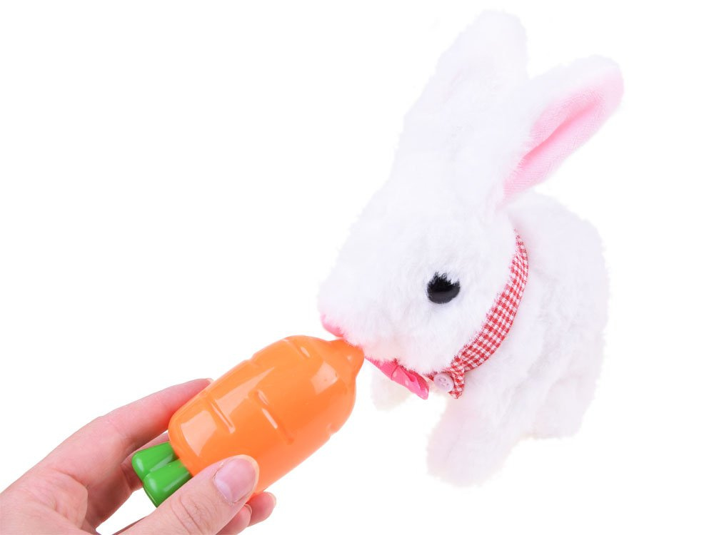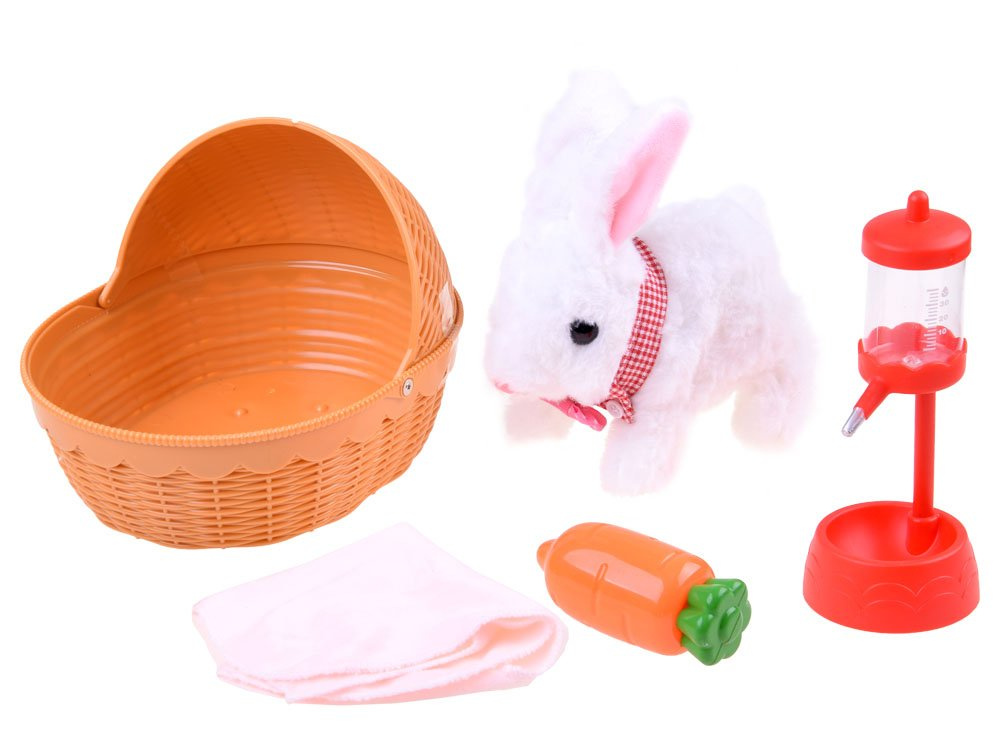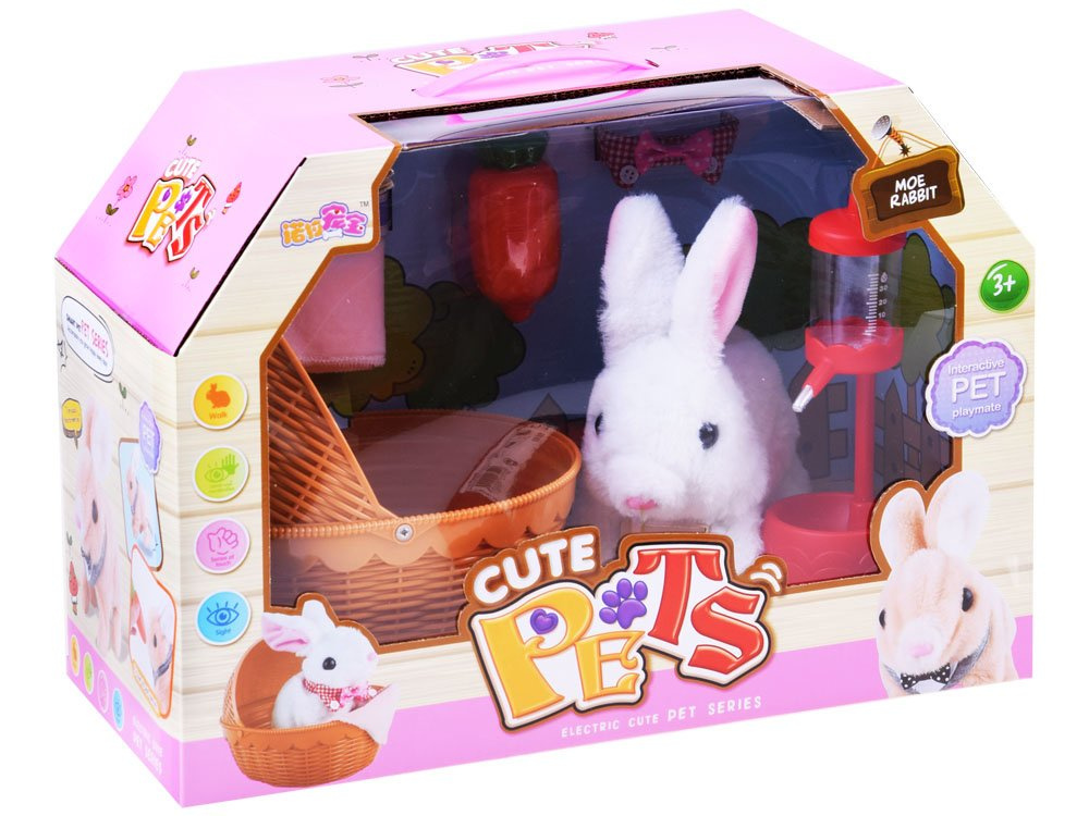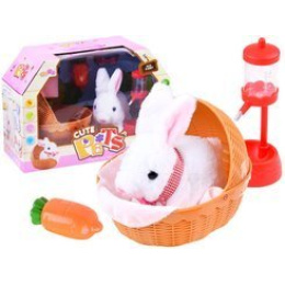 Interaktivní plyšový králík s doplňky si pravděpodobně získá srdce nejednoho dítěte. Rozkošné bílé koťátko s růžovýma ušima po vložení baterií poskakuje dopředu, legračně pohybuje čumáčkem a vydává zvuky králíčka. Králík je vybaven košíkem, ve kterém může pohodlně spát přikrytý dekou. Hračka poskytne každému dítěti spoustu pečující zábavy.