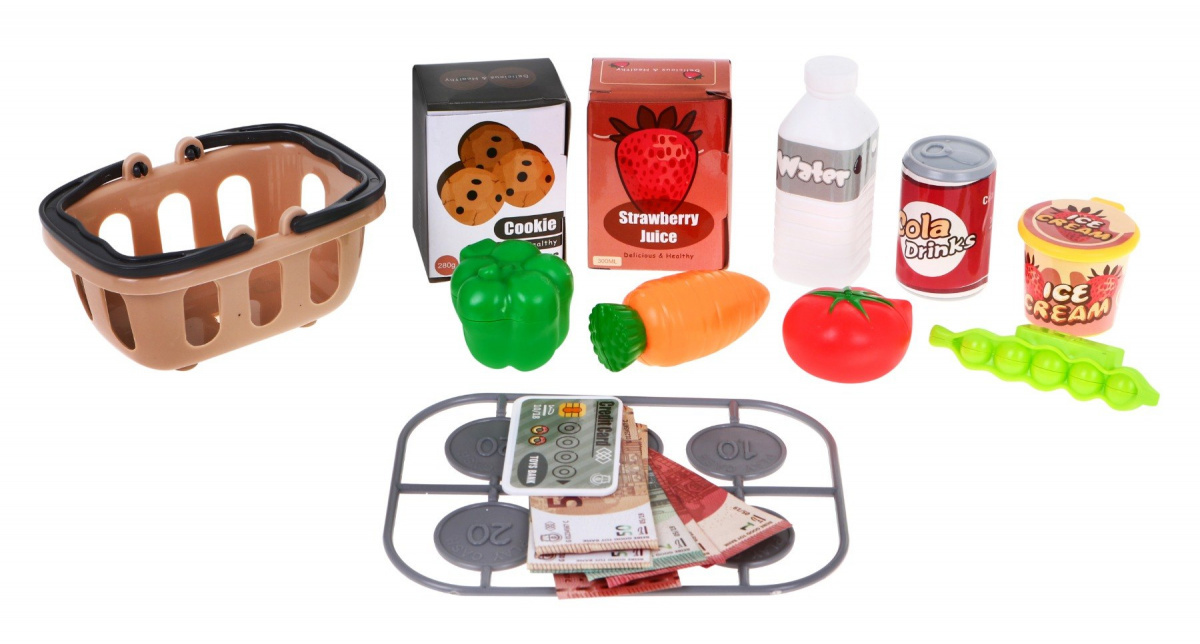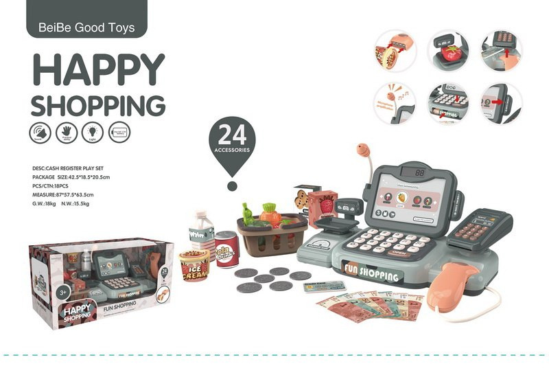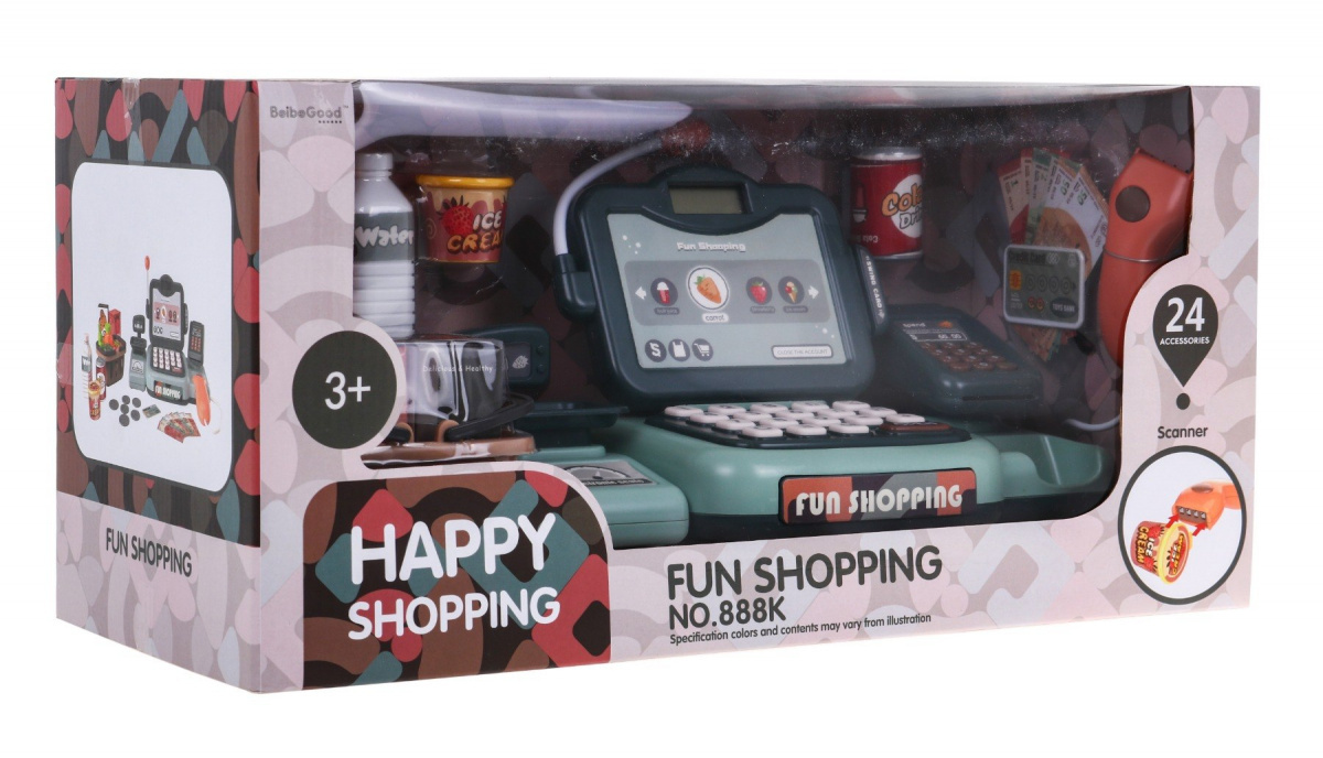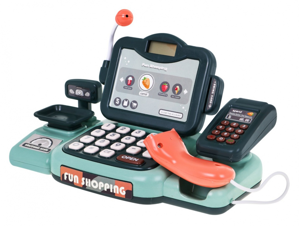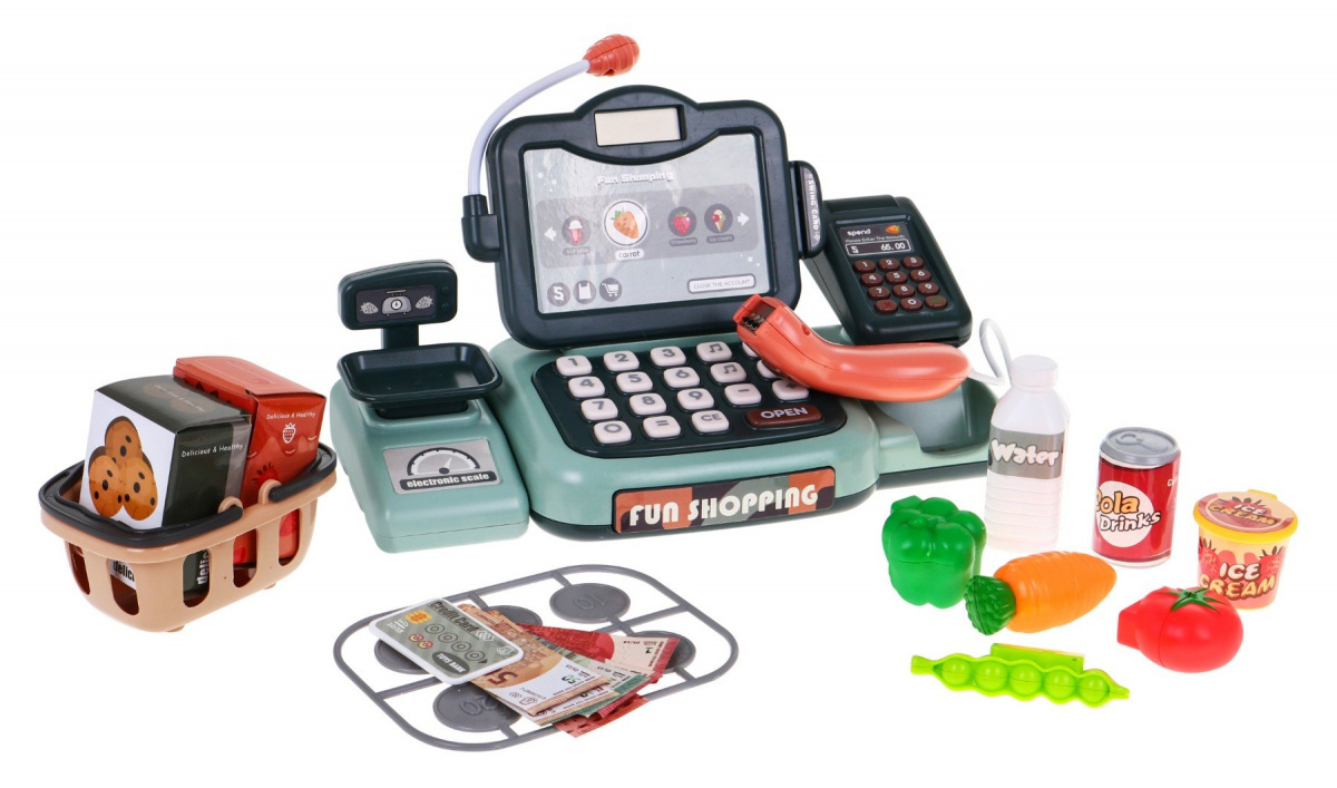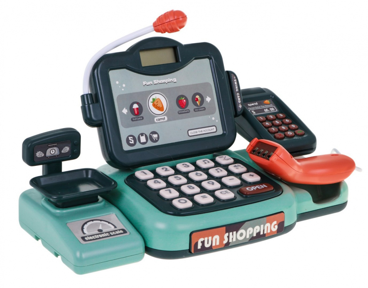 Pokladna se čtečkou čárových kódů a kreditních karet je ideální pro všechny děti, které si rády hrají na obchod. Hračka je vhodná pro děti od 3 let. Je napájen 3 bateriemi AA, které nejsou součástí dodávky. Pokladna má mikrofon, LCD displej, kalkulačku, otevírací zásuvku, posuvnou váhu, elektronickou čtečku čárových kódů a čtečku karet. Po naskenování výrobku se ozve zvuk skenování a na displeji LCD se zobrazí název výrobku a jeho cena. Batolata platí za své nákupy kartou nebo v hotovosti. Platbu kartou provede dítě vložením karty, která je součástí sady, do čtečky. Při zadávání kódu PIN vydává čtečka charakteristické zvuky. Mikrofon umístěný u pokladny je ozvučený.