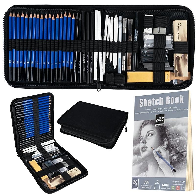 Profesionální sada na skicování a stínování zabalená v praktickém pouzdře. Počet prvků v sadě: 54 V sadě: 17 skicovacích tužek různé tvrdosti: 12B, 10B, 8B, 6B, 5B, 4B, 3B, 2B, B, 2x HB, H, F, 2H, 3H, 4H, 5H 4 uhelové tyčinky 3 uhelové tužky (měkká, střední, tvrdá) 2 bílé uhelové tužky 3 stínítka (5,7,9) 2 stínítka 2 grafitové tužky 6B pravítko brusný papír na pastelky syntetická guma chlebová guma prodlužovač tužky nožík bílý fix propiska ořezávátko plastové jednoduché ořezávátko ocelové dvojité 3 křídy (bílá, šedá, černá) 3 uhly (měkký, střední, tvrdý) 3 grafity (měkký, střední, tvrdý) skicák A5 (20 listů) pouzdro