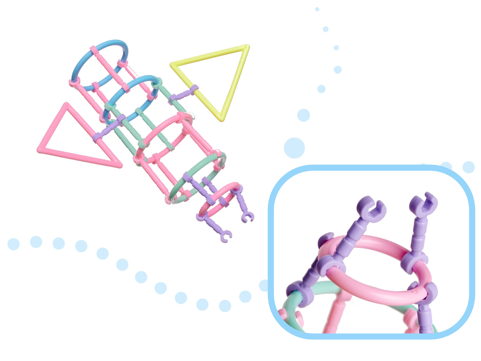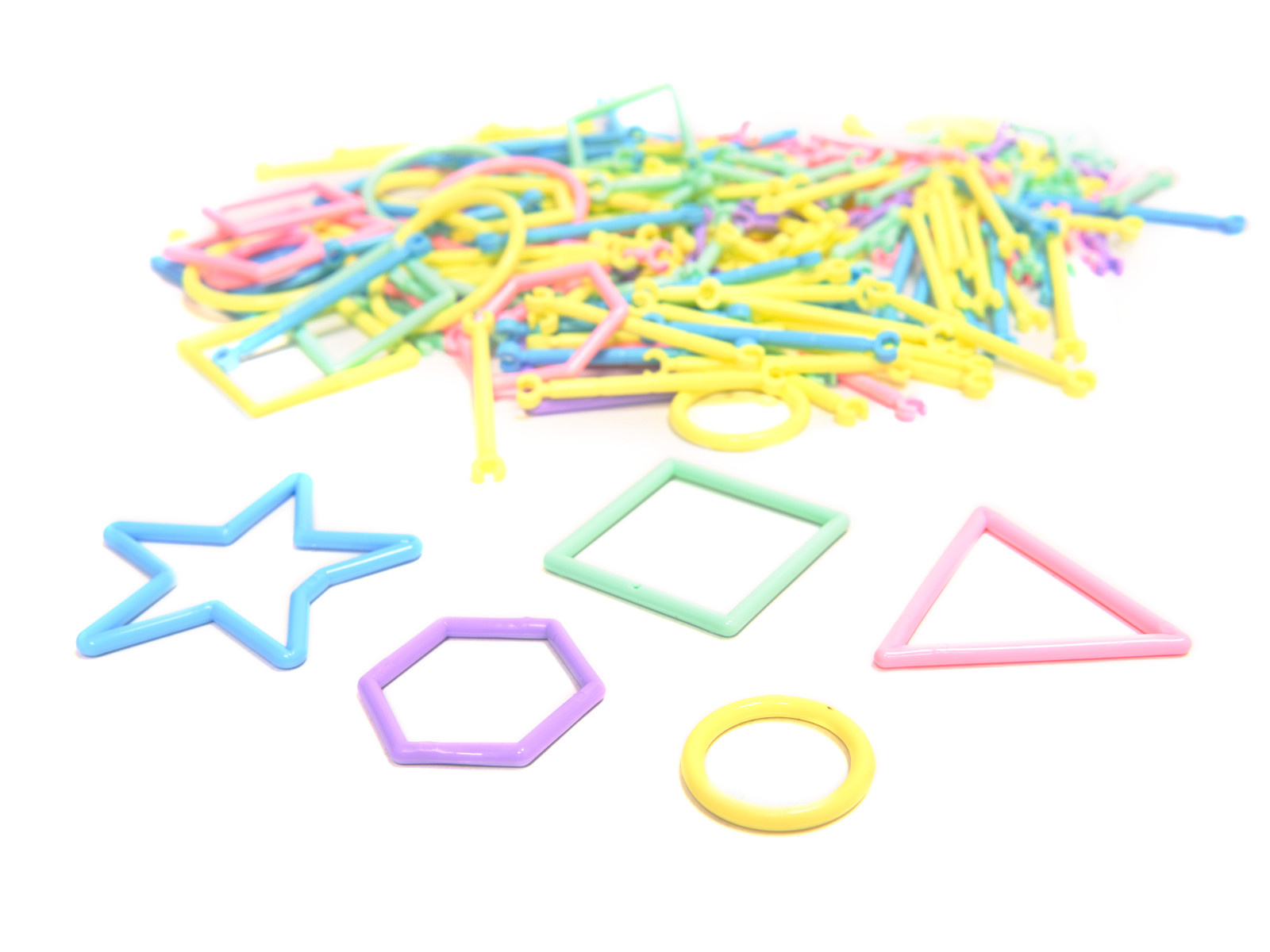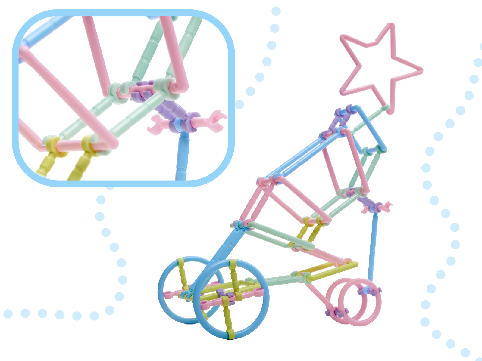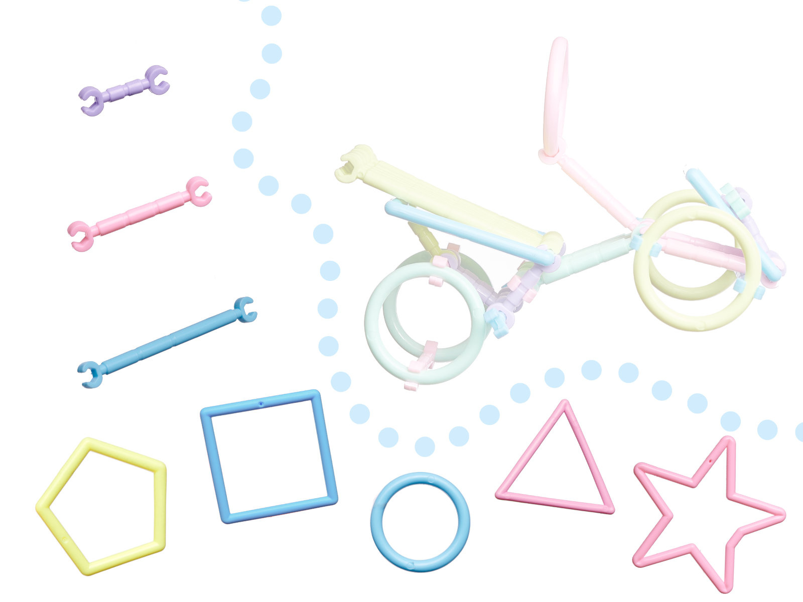 Plastová stavebnice - tyčinky a jiné obrazce pro stavění 3D modelů. Nejdříve si vytvoříme plochý tvar a pak přidáme spojky a stavbu rozšiřujeme do prostoru. Nabízí nespočet možností pro malé stavitele.