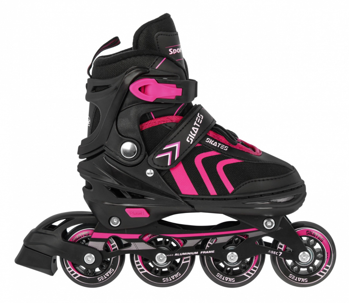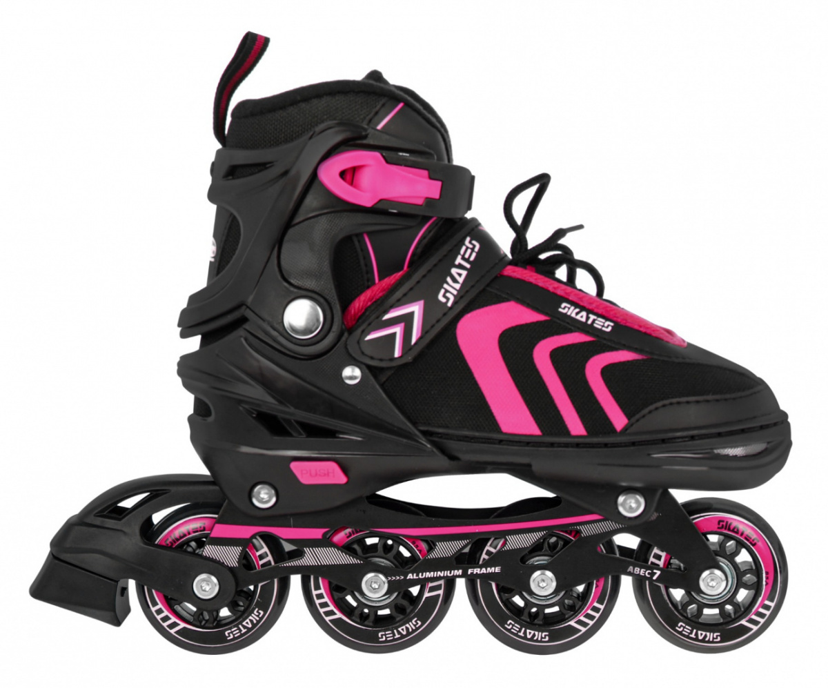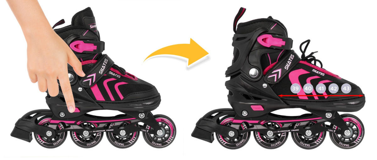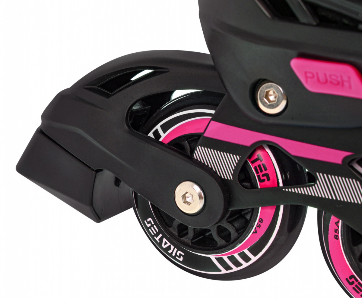 | Boty | - 5stupňový systém nastavení velikosti stisknutím tlačítka (39-43) - vnitřní délka boty od 24 cm do 27,5 cm, - polotvrdá konstrukce zajišťující pružnost boty a bezpečnost kotníku - třísekvenční zapínání: - tkaničky - pásek na suchý zip - přezka (nastavení + ochrana proti otevření) - brzda v pravé brusli - ventilační systém - polopropustná membrána - tvarovaná stélka - stélka brusle vyplněná měkkou pěnou EVA pokrytá vnější vrstvou látky Velvet |
