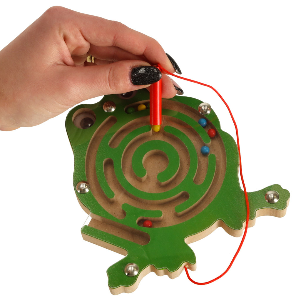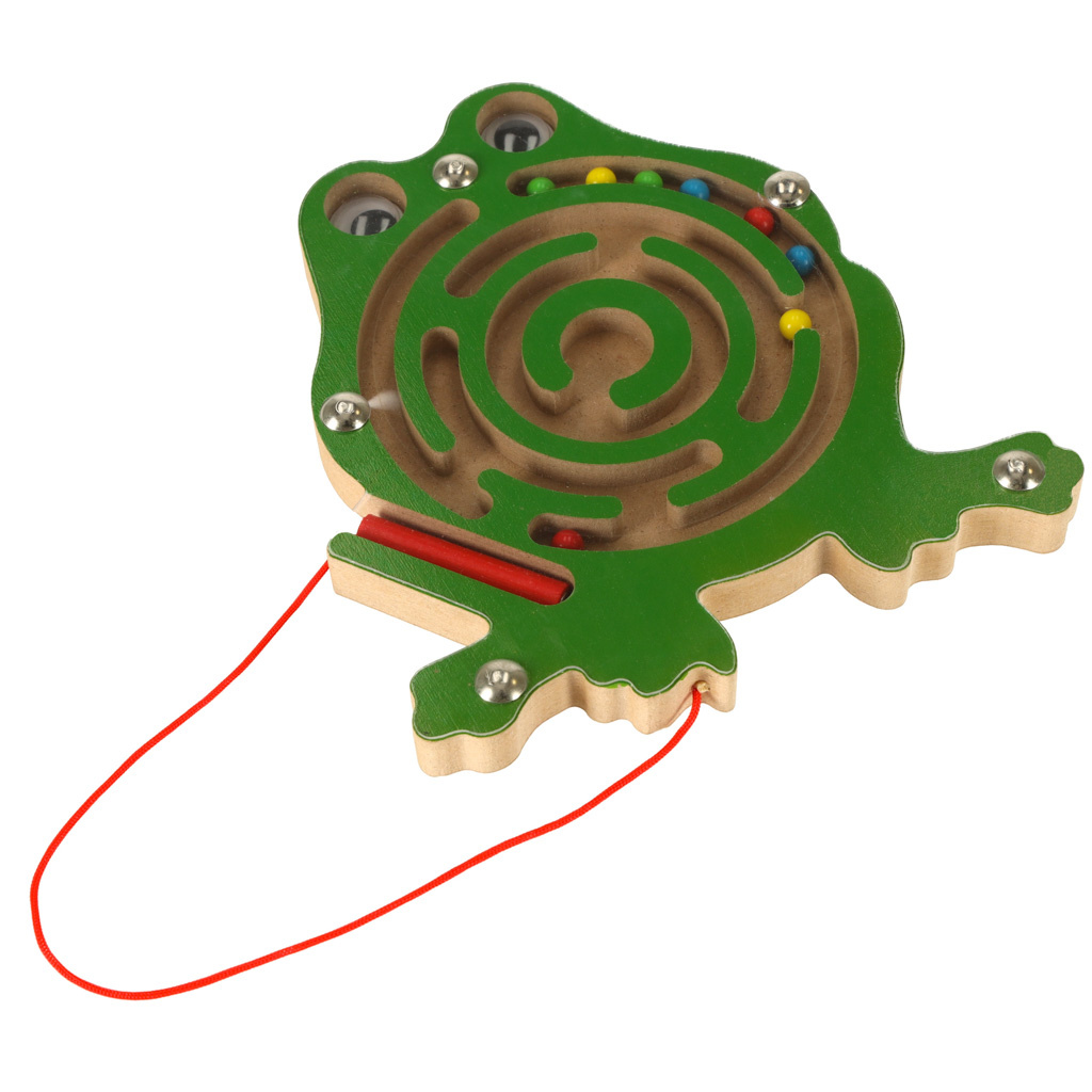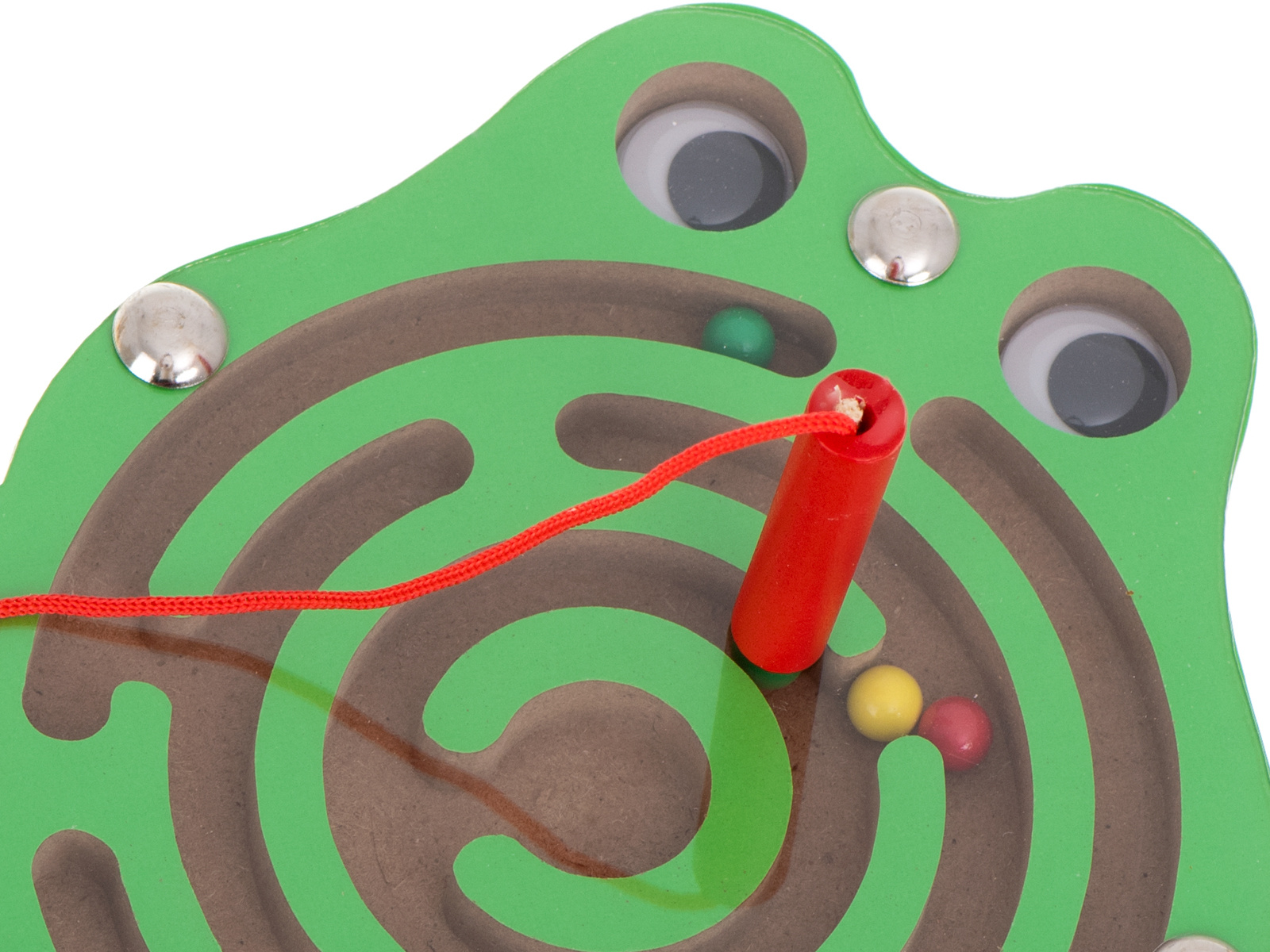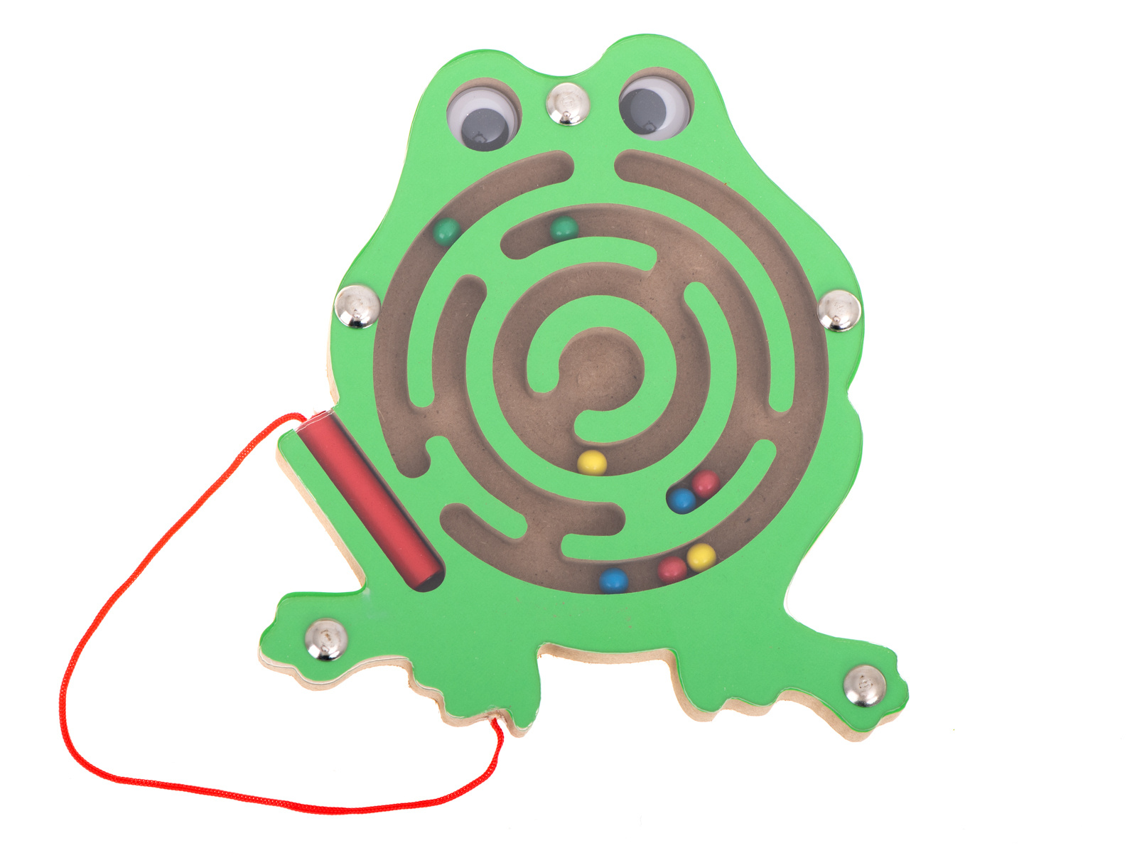 Přátelská žába byla uzavřena v bludišti z kovových kuliček. Hra spočívá v tom, že pomocí tyčinky s magnetem přesouváte barevné kuličky na centrální místo. Aby byl úkol obtížnější, lze navíc kuličky vést bludištěm otáčením hračky do různých směrů.