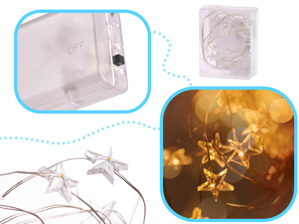 Sada světel ve tvaru hvězdy na tenkém ohebném drátu dlouhém 2 metry.