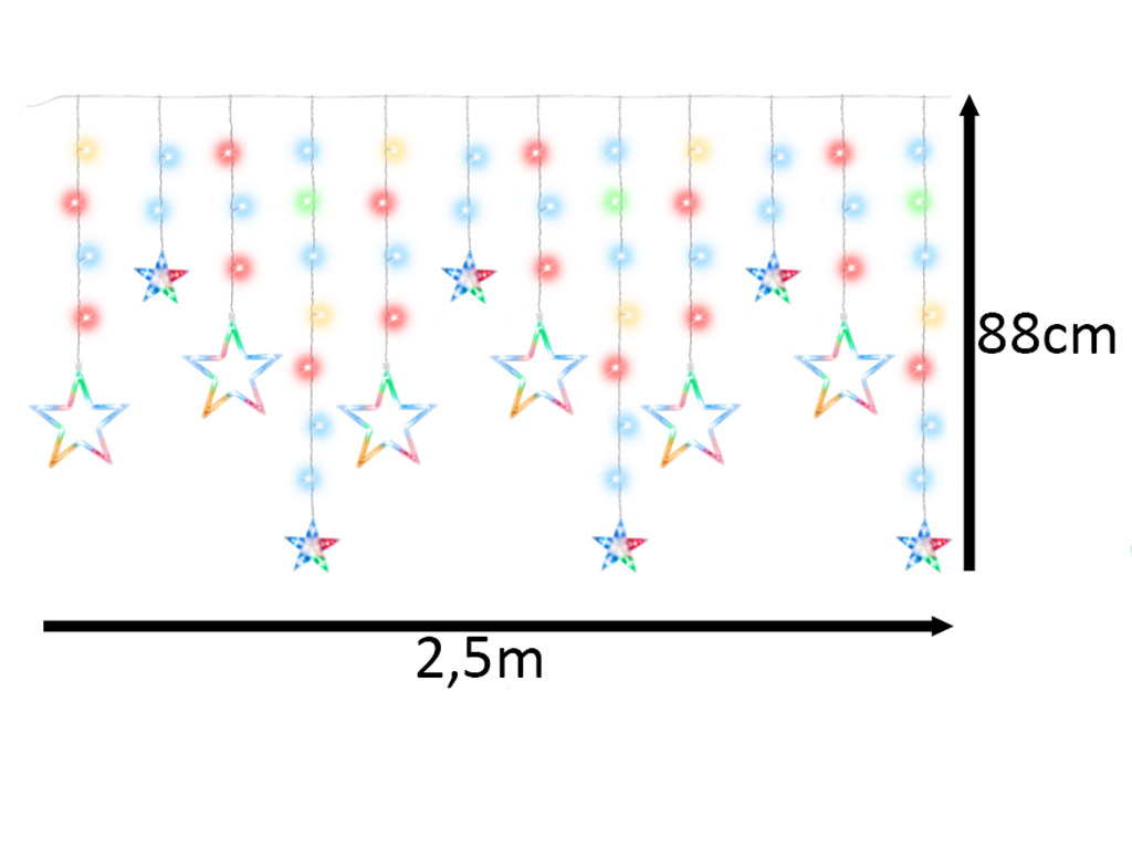 Vneste do svého prostoru kouzlo! Krásný světelný závěs s velkými hvězdami různých velikostí rozzáří každý interiér. Barevné světla, vnesou do vašeho pokoje vánoční kouzlo. Světelný závěs se skvěle hodí jako jedinečná vánoční dekorace, ale světýlka ve tvaru hvězdiček lze použít i v jiných ročních obdobích, zejména jako originální dekorace nebo jako osvětlení pro dětský pokoj ve večerních hodinách. Světla jsou namontována na robustní a silný kabel, který zaručuje dlouhou životnost. Závěs lze zavěsit na záclonovou tyč, takže se z obyčejných záclon stane slavnostní dekorace nebo dokonce nahradí záclony!Jediným kliknutím můžete výrazně změnit atmosféru v místnosti. Díky různým režimům osvětlení, můžete rychle přejít z útulného interiéru zaměřeného na odpočinek do veselého karnevalového večírku. Světla jsou napájena ze sítě a díky technologii LED nespotřebovávají světla mnoho energie. K osvětlení většího prostoru nepotřebujete více elektrických zásuvek .Dva závěsy můžete snadno spojit pomocí konektoru a můžete také propojit různé sady světel, pokud mají ploché zástrčky.