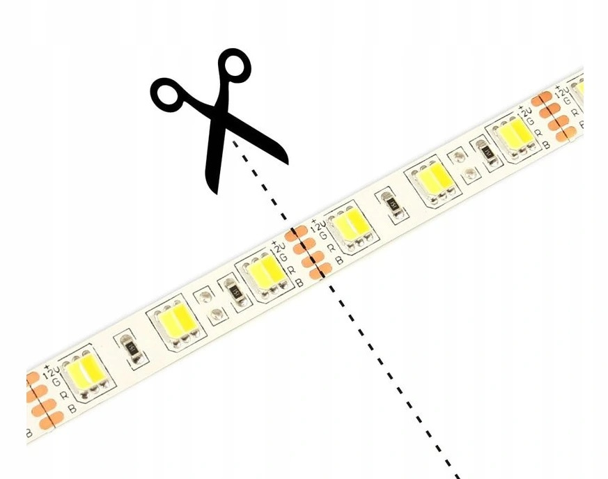 Důležité: během instalace pásky každých 7-8 metrů byste měli použít jiný zdroj napájení nebo uzavřít obvod zdroje napájení kvůli poklesu napětí, který je u tohoto typu osvětlovacích výrobků normální. Tovární svár cínu není závadou.