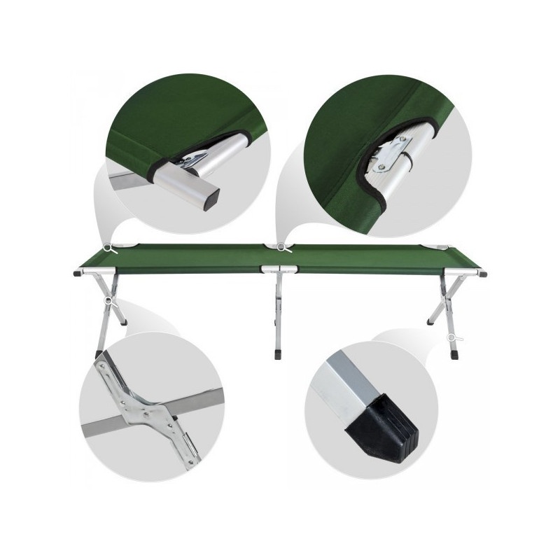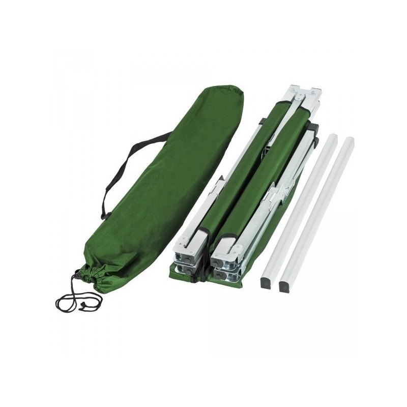 Kempingová skládací postel se dá velice snadno poskládat do malého obalu – tašky s popruhem přes rameno a takto přenést, naložit do auta nebo uskladnit.