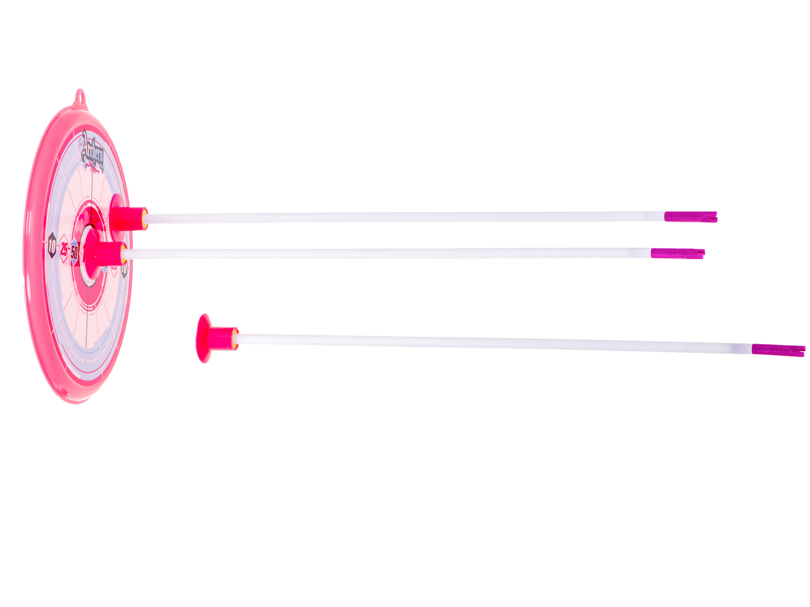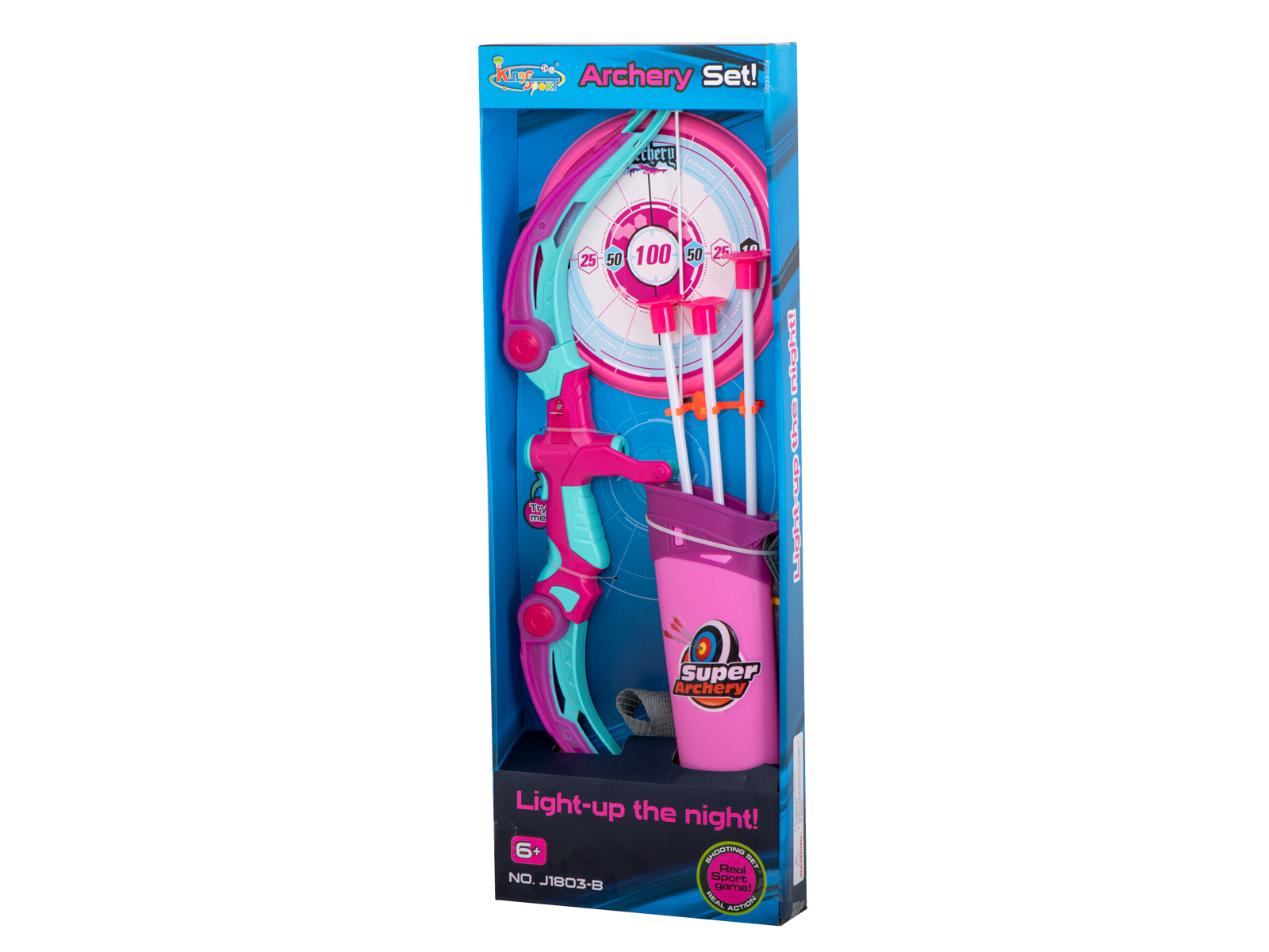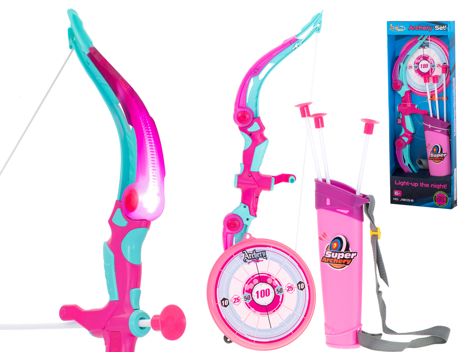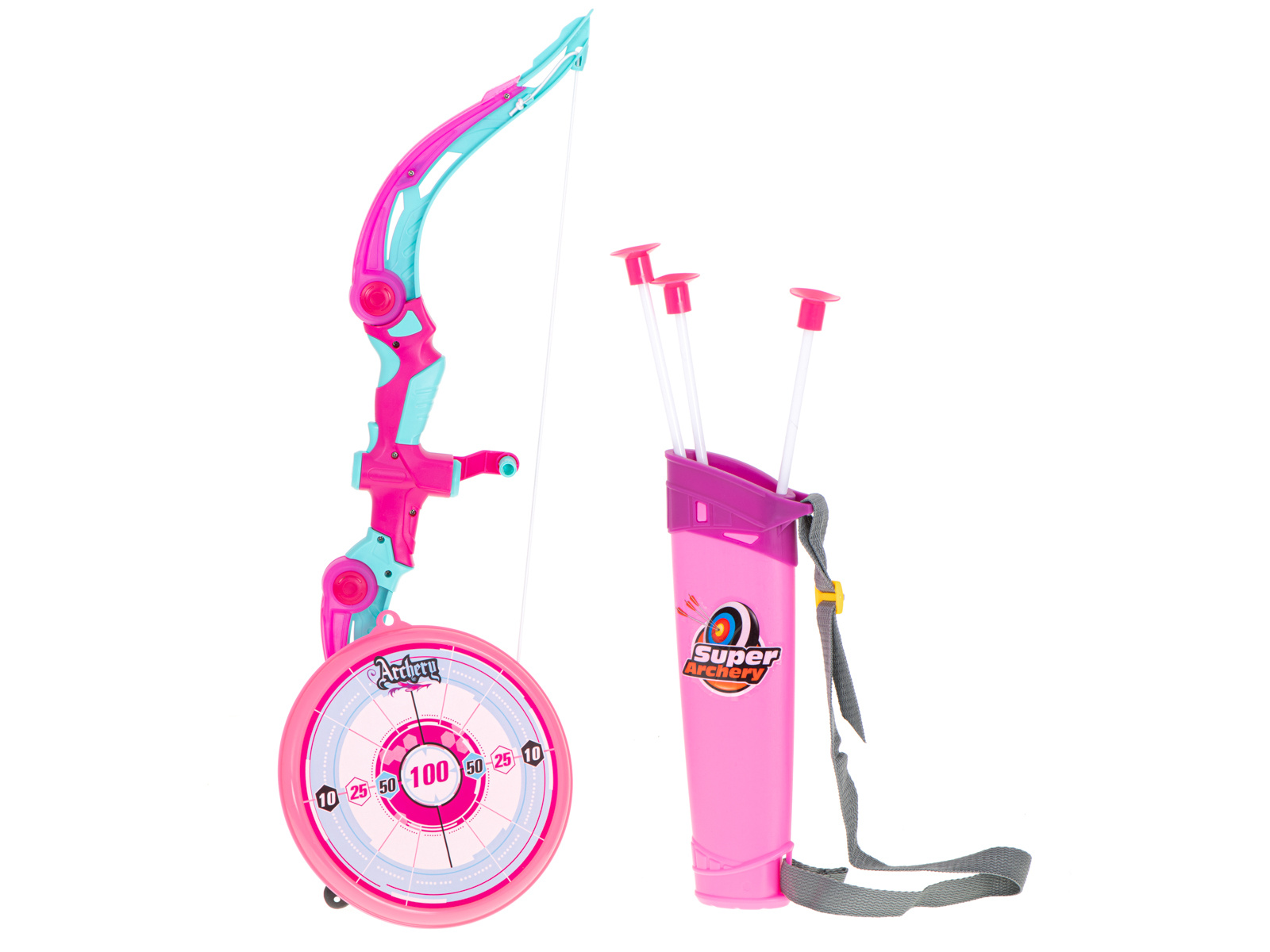 Střelecká sada - luk se šípy a terč. Ideální pro malé bojovníky a fanoušky indiánů. Obsahuje: terč, luk, toulec se šípy, 3 šípy s přísavkami. Barva: růžová. Napájení: 3x AG13 (součástí dodávky). St. kotouč: 20 cm. Dlouhá. luk: 53 cm.Celý popis