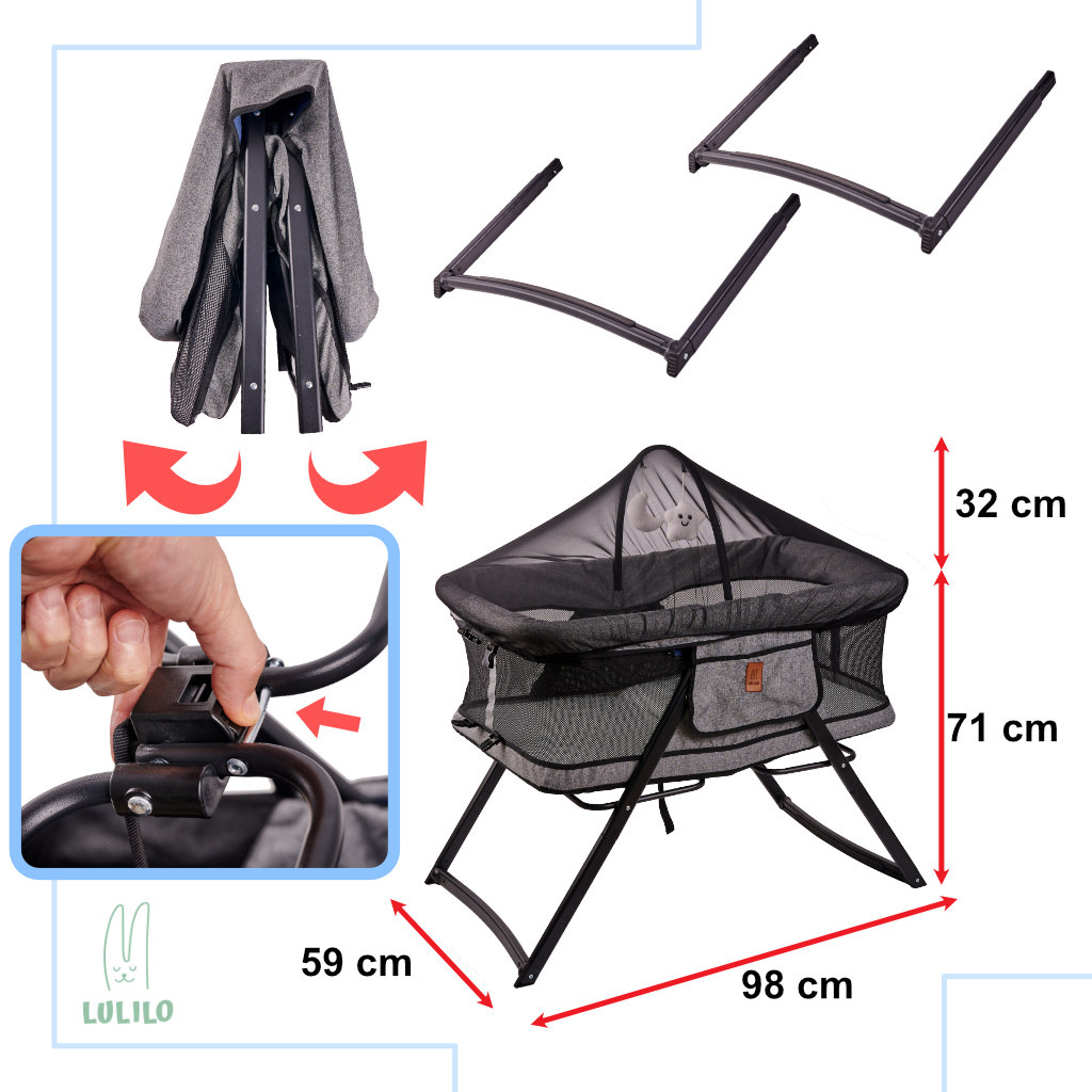 • Neutrální barvy postýlky se hodí do každé místnosti a možnost rychlého složení a rozložení umožňuje její umístění kamkoli. Po složení nezabere kolébka mnoho místa a lze ji s úspěchem vzít na dovolenou nebo s rodinou, aby miminko mohlo vždy spát v pohodlí vlastní postele.