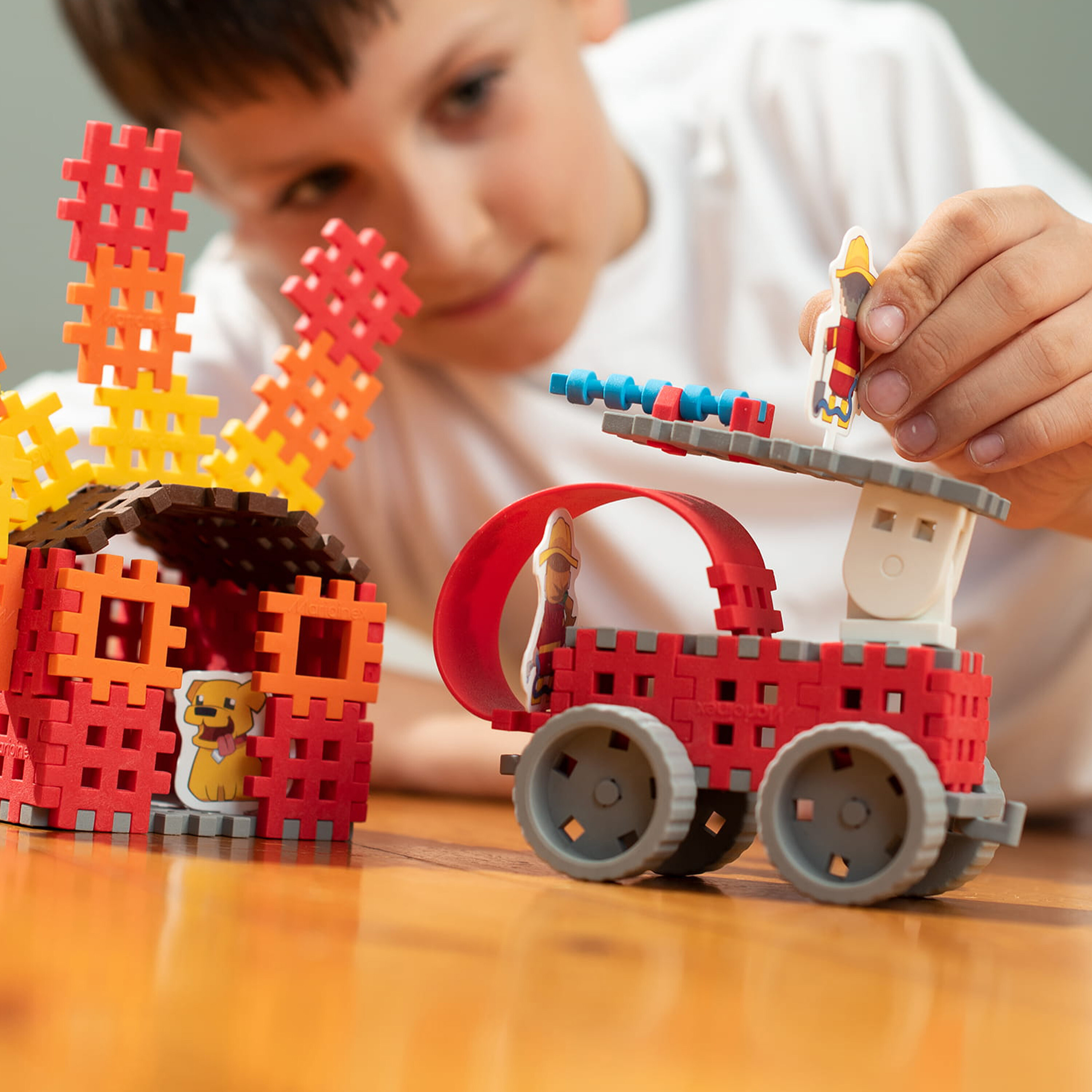 Při hře si vaše dítě postaví hořící budovu a hasičské auto.