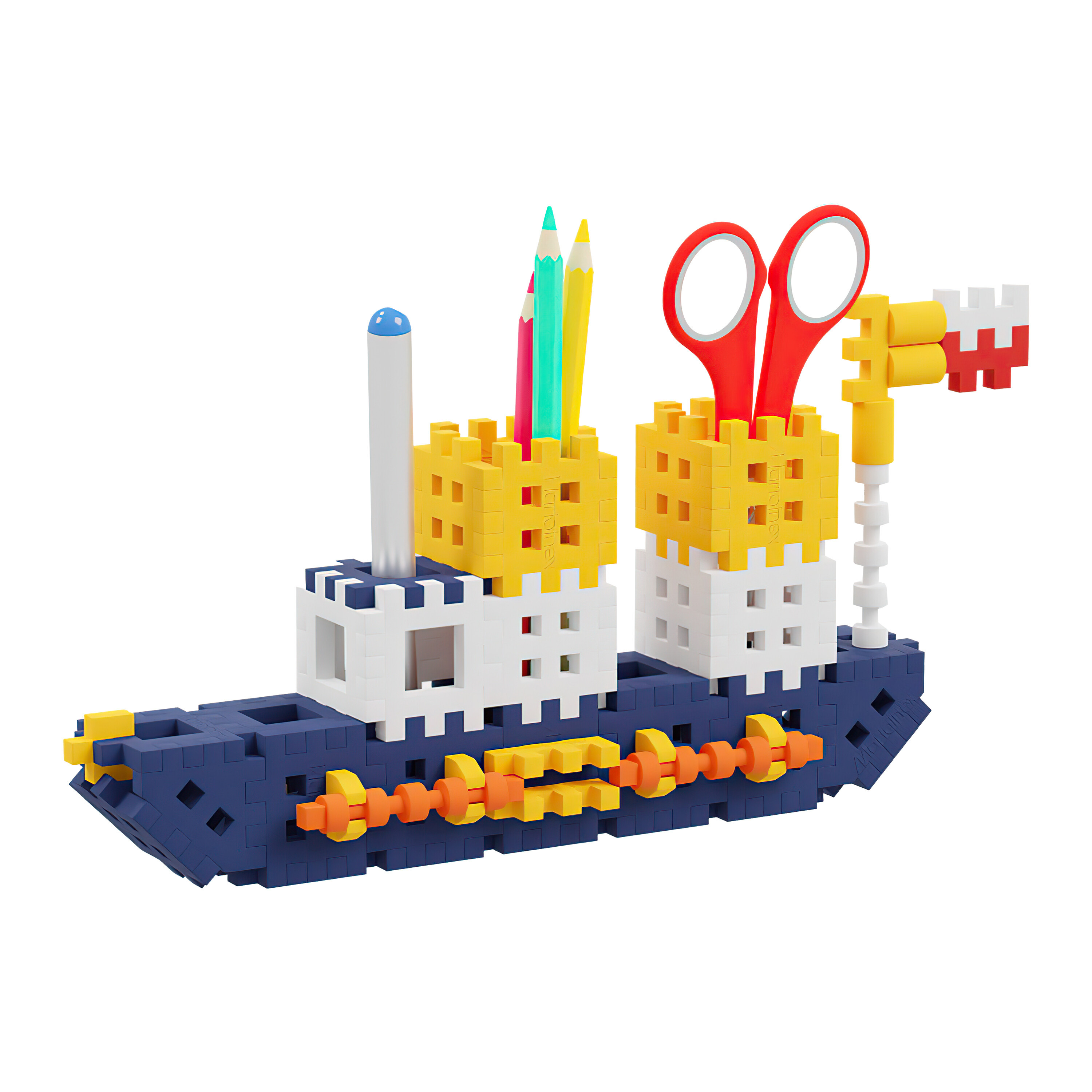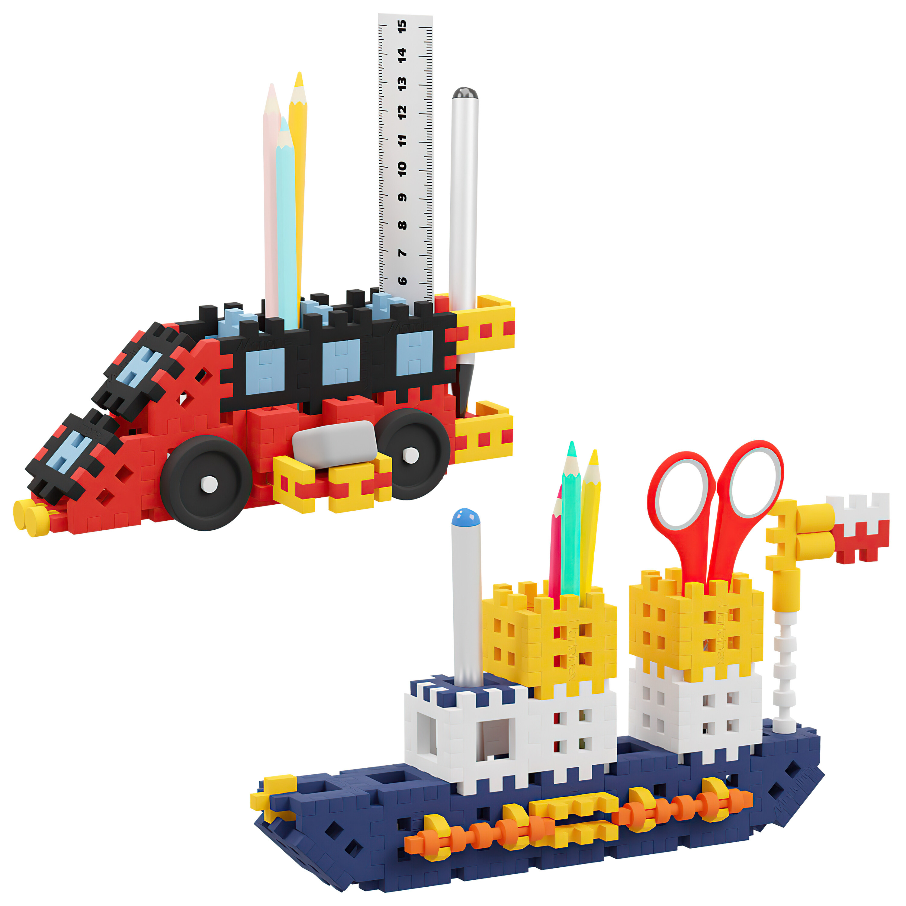 Sestavte si vlastní organizéry na psací a výtvarné potřeby. Získáte tak kreativní a velmi praktickou dekoraci pracovního stolu. Sada se skládá ze 140 prvků vytvoříte z nich organizér ve tvaru auta a lodi, které pojmou všechny potřebné školní potřeby.