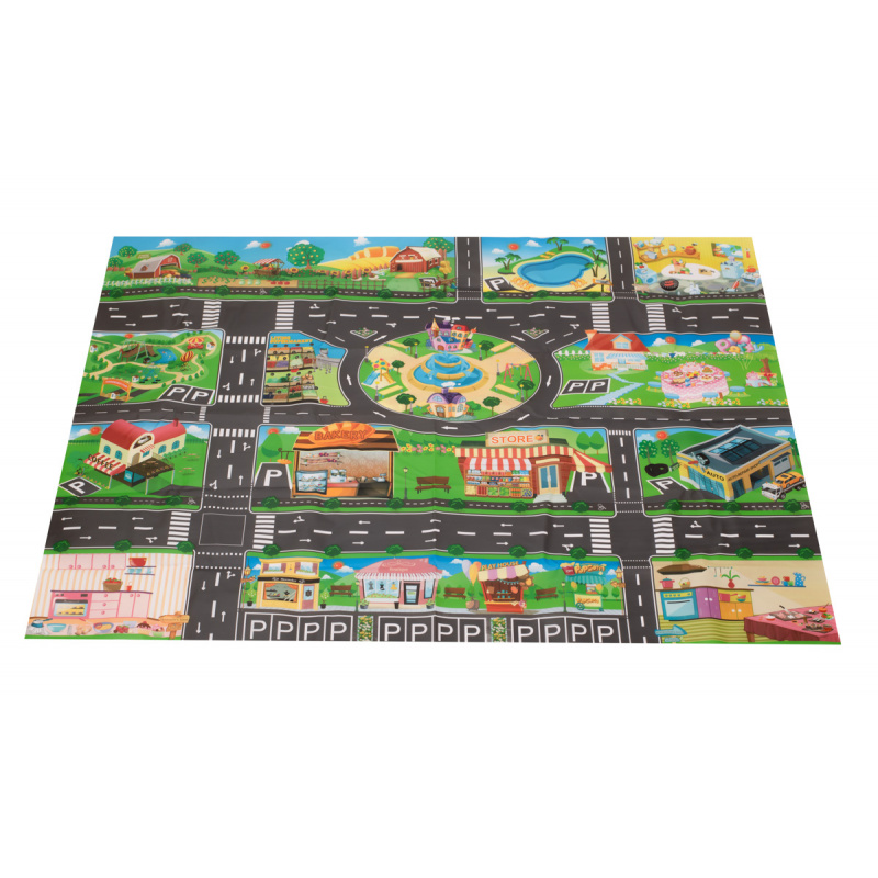 Velká voděodolná dětská podložka s městským designem a doplňky.Je vyroben z plastu podobného olejové tkanině, je velmi tenký a lehký. Sada obsahuje m.in. 18 různých dopravních značek a 18 samolepek. Rozměry: 130 x 100 cmCelý popis