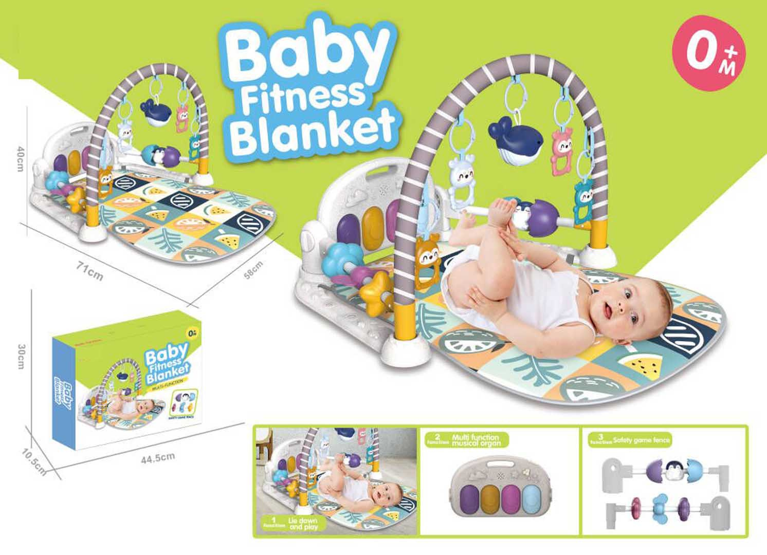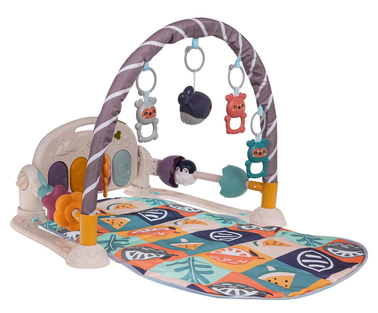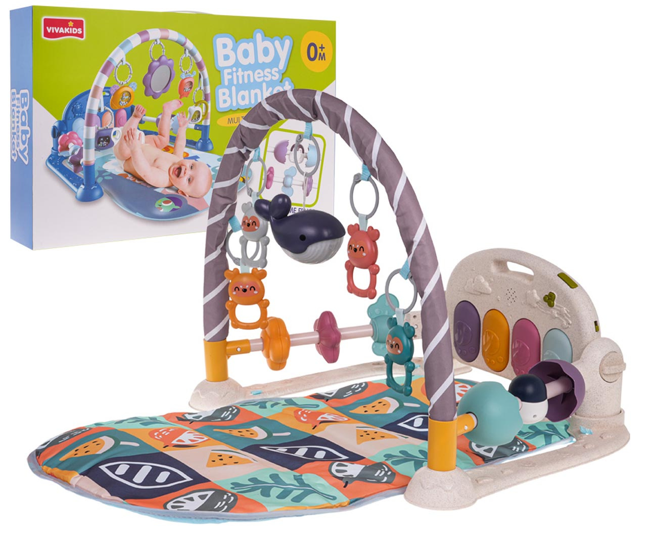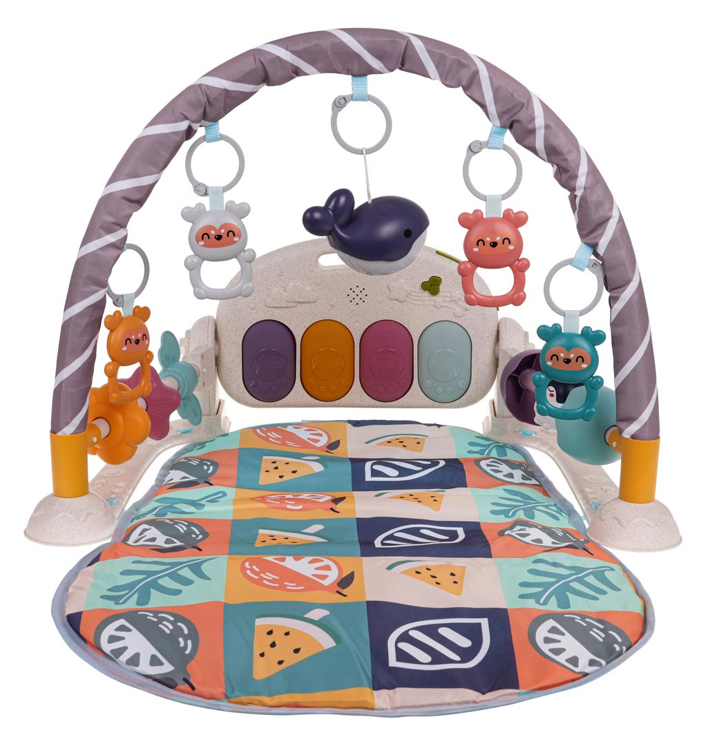 Interaktivní, multifunkční podložka pro nejmenší od prvních dnů života. Sada se skládá z pohodlné podložky pro miminko, oblouku se závěsy a piánka. Mata roste spolu s dítětem. V prvním období života, do šestého měsíce života, může miminko ležet na pohodlné podložce, kopat nožičkami do piánka a pohybovat ručičkami ve snaze dosáhnout na zavěšené hračky na oblouku. Mezi šestým a dvanáctým měsícem bude sada nesmírně užitečná při učení sezení. Starší dítě může hrát na piánko už samostatně. Pianinko lze velmi snadno přeměnit na hudební stolek pomocí regulačních knoflíků, které se nacházejí po stranách konstrukce. Můžeme naklánět piánko do několika poloh, nebo jej odpojit od sady a vzít na různá místa. Navíc má piánko pohodlnou rukojeť pro přenášení. Pianinko je vybaveno čtyřmi podsvícenými klávesami a tlačítkem s notou, které přehrává melodie. Je zde také vypínač a zapínač a regulace hlasitosti. Na oblouku se nacházejí 4 přívěsky s medvídky, které také jemně chrastí, a podsvícený delfínek. Po stranách základny se nacházejí překládky s korálky. Pianinko je napájeno bateriemi typu 3 x AA 1,5 V (nejsou součástí balení). Delfínek na baterie typu 2 x AAA 1,5 V (není součástí balení). Konstrukce sady a piánka je vyrobena z bioplastu, materiálu, který je zcela bezpečný pro nejmenší i pro životní prostředí.
