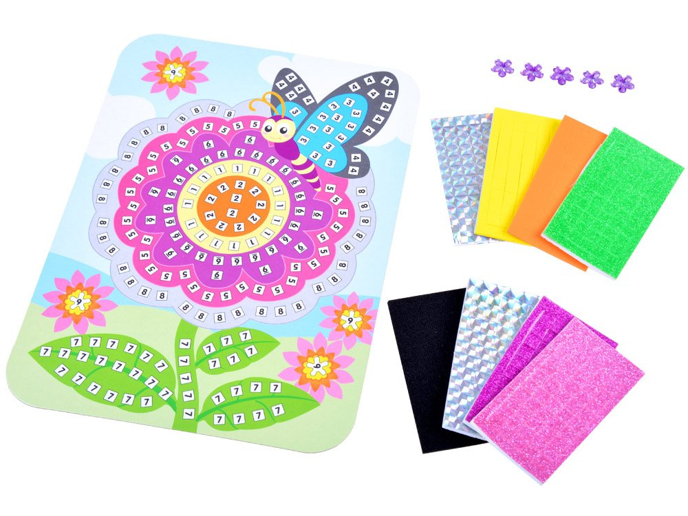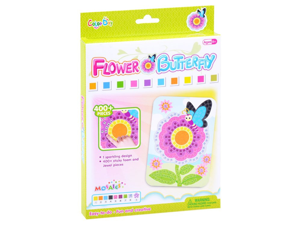 Mozaika motýlích květů je kreativní sada pro děti, které baví výtvarná tvorba. Sada se skládá z barevného obrázku, který se lepí pěnovými čtverci, samozřejmě s přizpůsobením barev a tvarů.