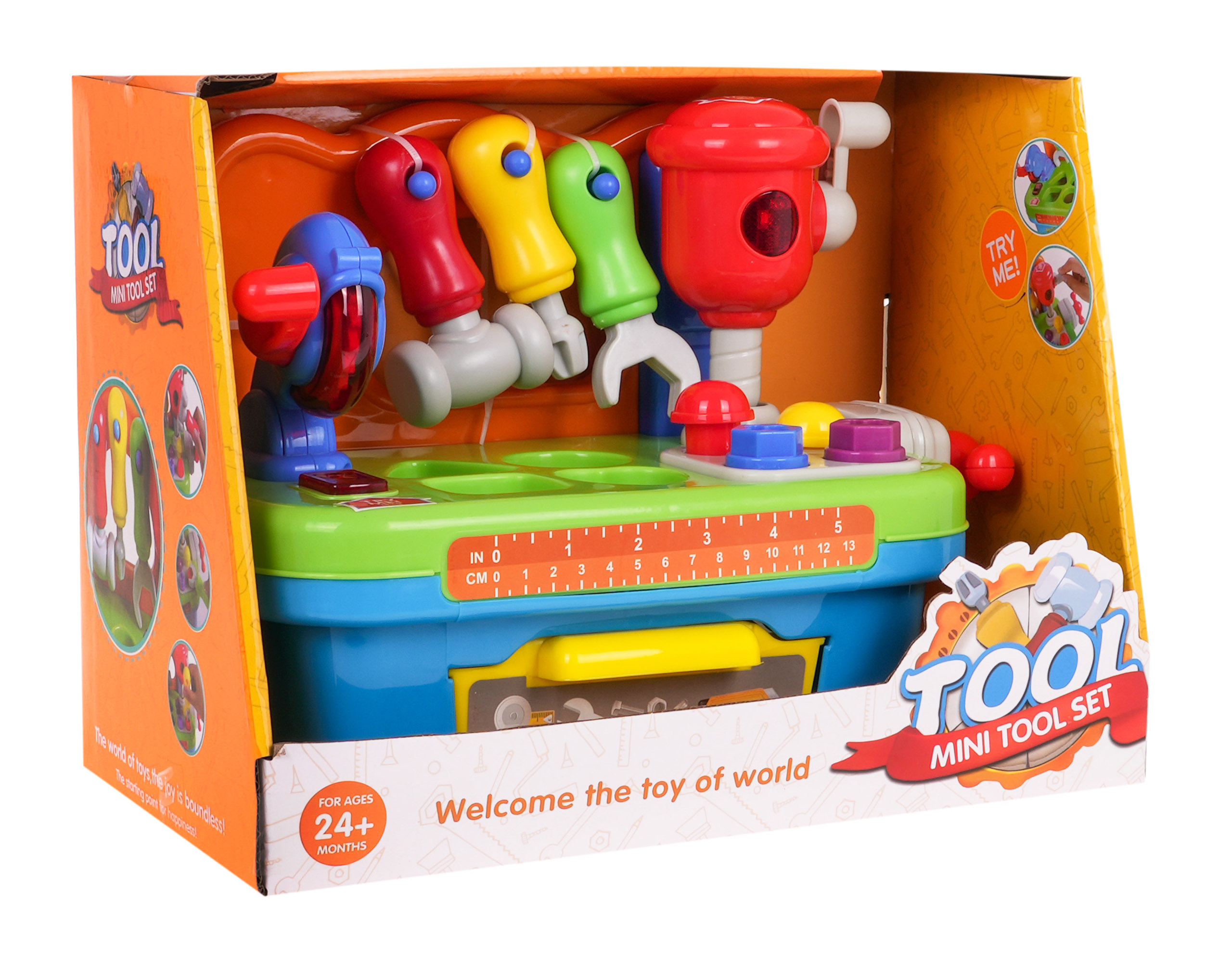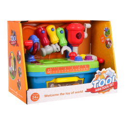 Multifunkční interaktivní hračka se zvukovou a světelnou funkcí je vhodná pro děti od 24 měsíců. Dílna pro kutily je vybavena řadou funkcí. K dispozici je rotační kotoučová pila a rázové kladivo. Každé nářadí je vybaveno praktickou rukojetí, s níž se spouští. Na desce pracovního stolu je připevněn svěrák, který umožní našemu malému dítěti naučit se reflexy při šroubování a odšroubování, doprovázené chrastivými zvuky. Součástí dílny budou hřebíky na zatloukání a šrouby na šroubování. K dalšímu vybavení patří nářadí: šroubovák, klíč a kladivo, vše v rozměrech dokonale vyhovujících malým dětským rukám. Dílna je také skvělým místem k procvičování rozpoznávání tvarů a přiřazování. Deska pracovního stolu je vybavena třídičem, který je vynikající pro rozvoj dětských dovedností. Všechny dílky, které zapadají do příslušných otvorů, najdete v praktické zásuvce ve spodní části hračky. Dílna je napájena 3 bateriemi AG13, které jsou součástí dodávky.