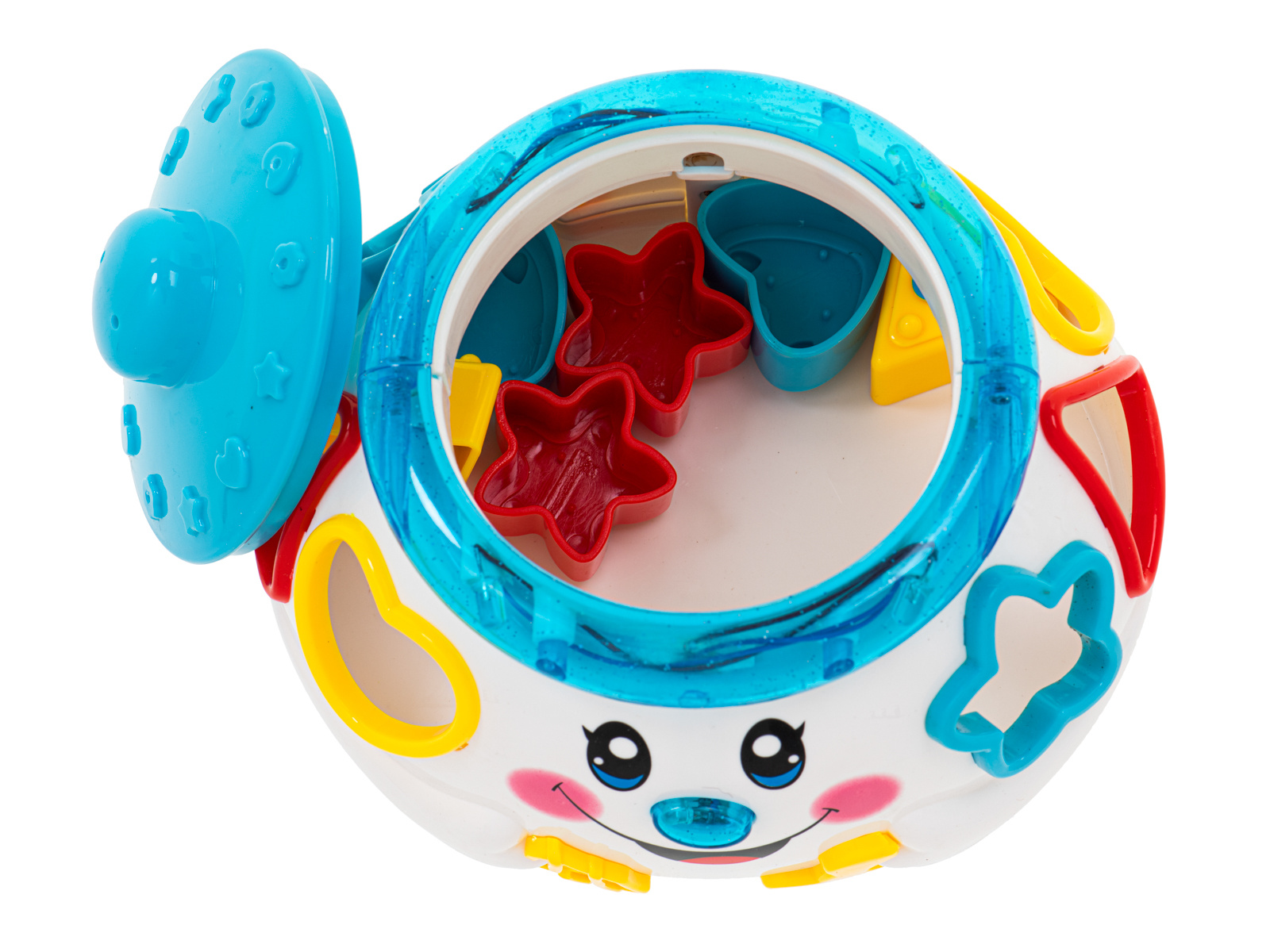 - Sada navíc obsahuje 6 kostek různých tvarů, které musí dítě vložit do příslušných otvorů.