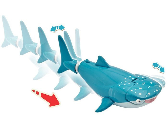 Je to celoplastová hračka, která při jízdě mává ploutvemi.