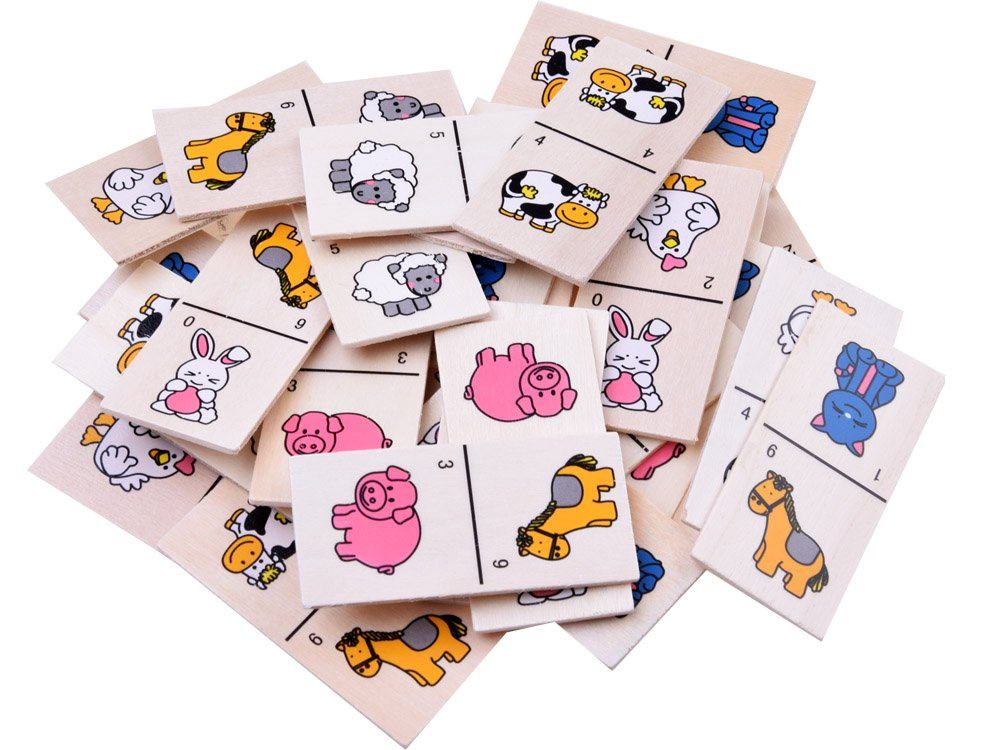 Sada je uzavřena v dřevěné krabičce a obsahuje 28 dlaždic s obrázky zvířat: prase, slepice, králík, kráva, kůň, kotě, ovce.
