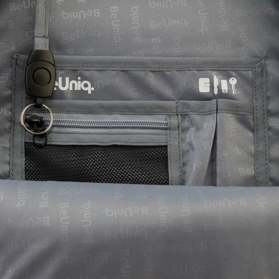 V hlavní přihrádce je přihrádka (na notebook), ve druhé přihrádce je organizér s kapsou na zip a držákem na klíče.