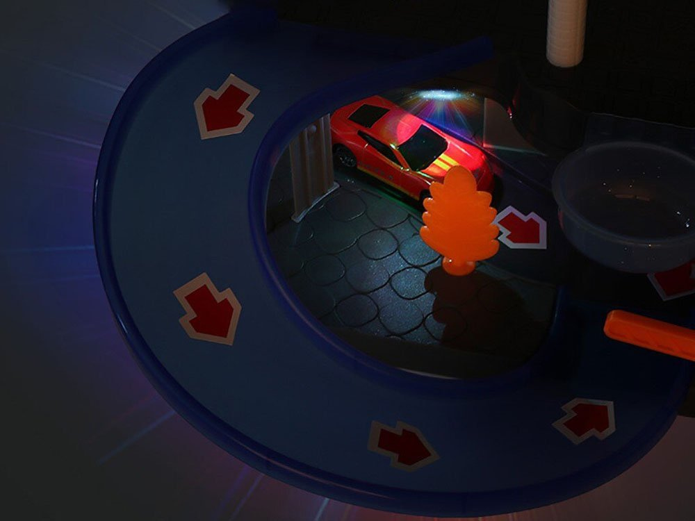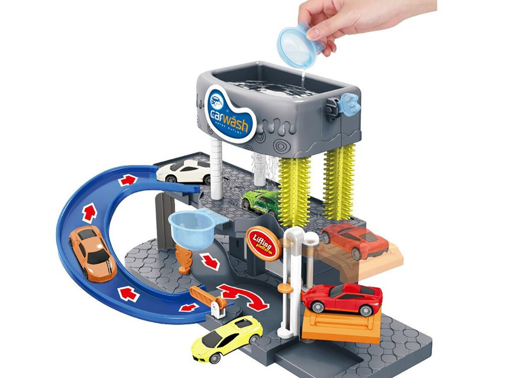 Celá souprava je vyrobena z plastu, v přízemí je výtah, kterým lze auto vyvézt nahoru a po umytí vozidla bezpečně sjet dolů.Chcete-li vozidlo umýt, umístěte do horní části hračky trochu vody a pak pomocí modré tlapky vodu, která padá na auto, rozlijte. Po umytí prachu z vozu se vozidlo sjede dolů, kde se vysuší ručníkem. Je doplněna samolepkami, světelnými a zvukovými efekty, které zábavu ještě umocní.