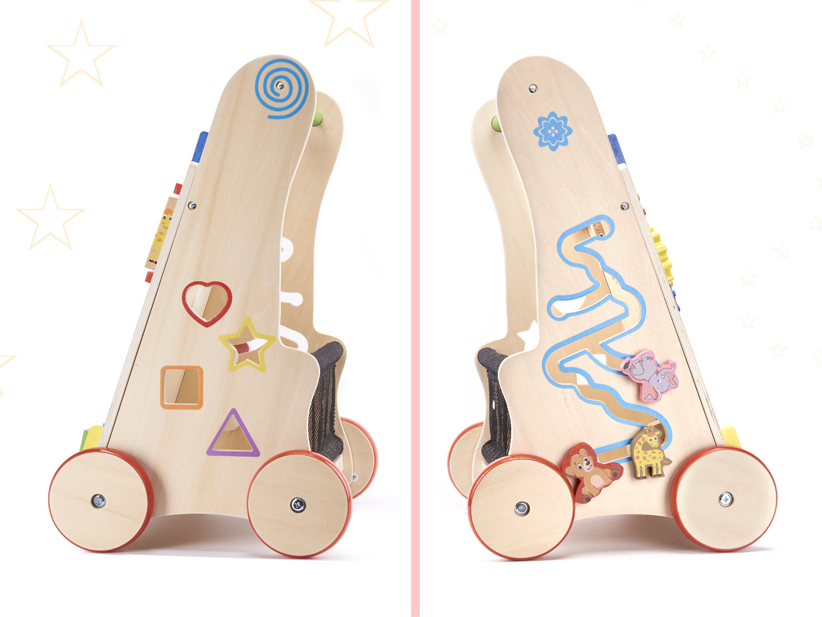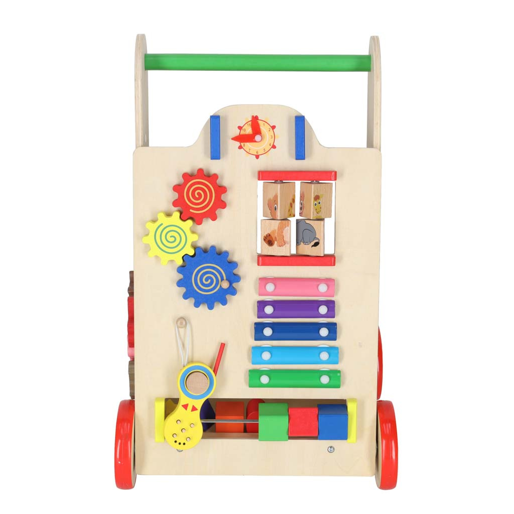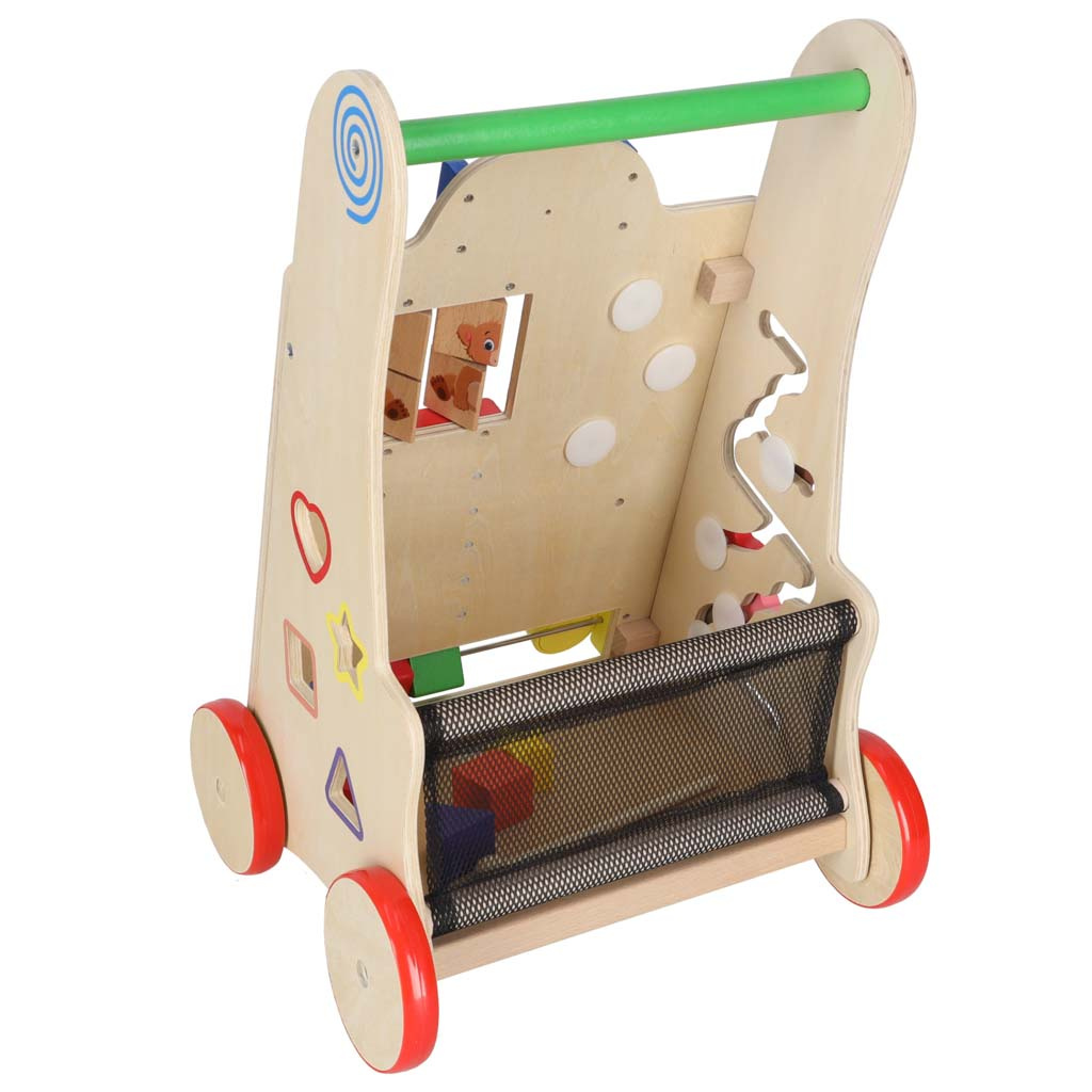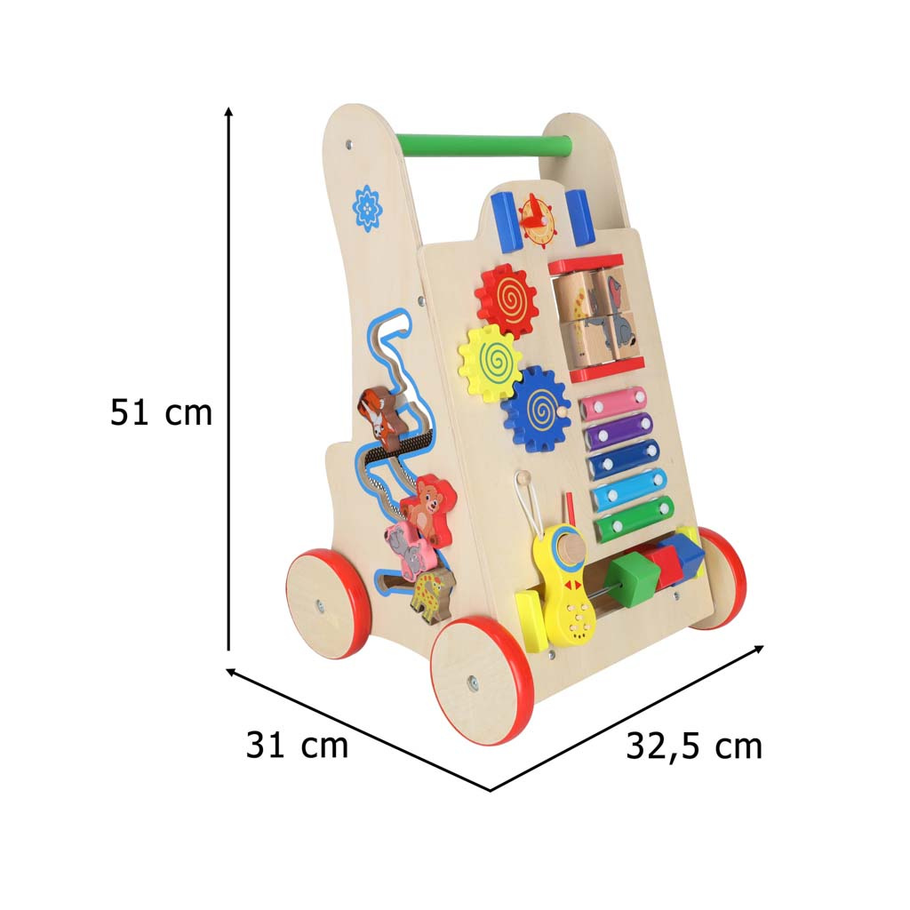 Chodítko, které vašemu děťátku usnadní první krůčky. V pozdějším věku se bude dobře hodit i jako vozík na oblíbené hračky a první počítadlo. Chůze s odrážedlem pomáhá batoleti udržet rovnováhu při učení chůze. Podporuje rozvoj manuálních dovedností a rozvíjí motoriku celého těla. Chodítko povzbudí vaše batole k fyzické aktivitě. Naše chodítko je stabilní oporou pro batole, které se učí chodit. Dítěti se ji nepodaří převrhnout. Dřevěná kolečka jsou chráněna protiskluzovou gumovou vrstvou. Estetický design, výrazné barvy, důraz na detail - příjemný a bezpečný společník pro vaše dítě. Toto odrážedlo se bude líbit rodičům, kteří hledají ekologické doplňky pro své dítě. Dřevěné hračky jsou skvělou volbou! Není to jen chodítko! Vývojáři se postarali o to, aby hra poskytovala batolatům zábavu mnoha způsoby. Na přední straně je umístěna manipulační deska plná prvků potěší děti: