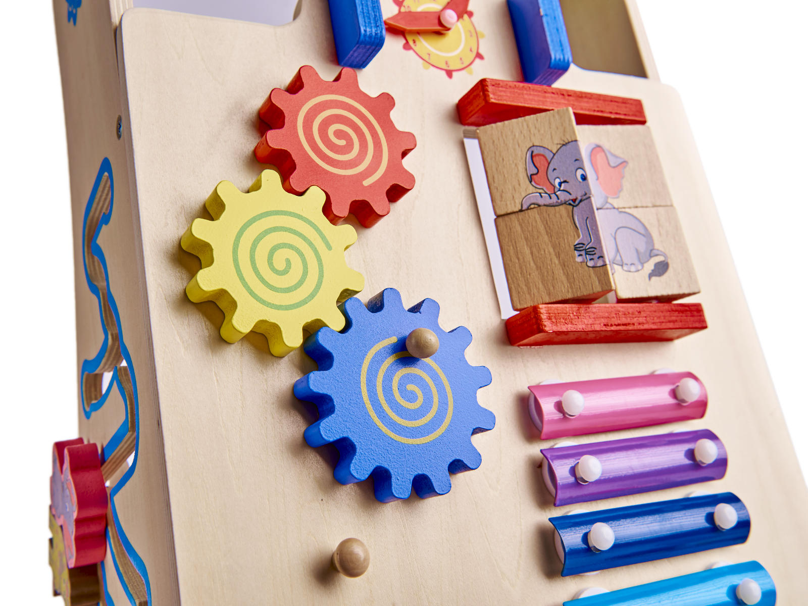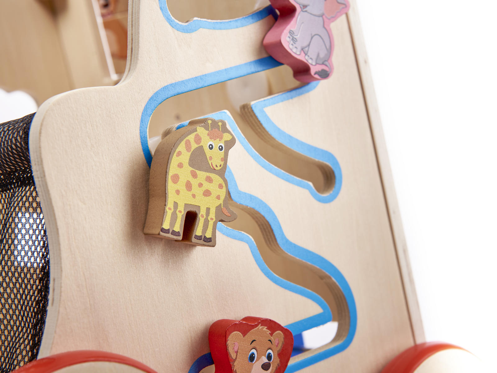 Barevné prvky přitahují oko i malé ručičky svými barvami. Díky neutrální dřevěné základně zároveň hračka nepůsobí na dítě nadměrnými podněty.