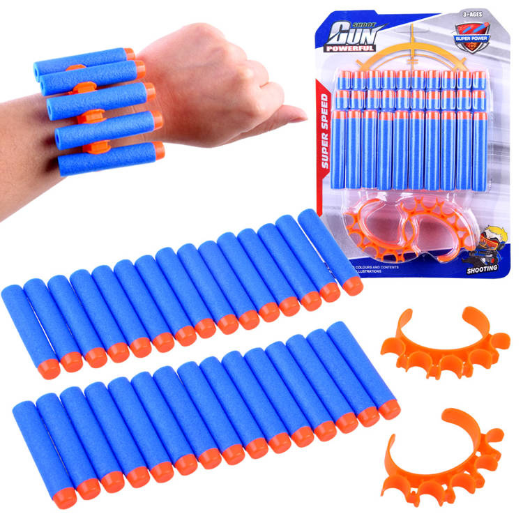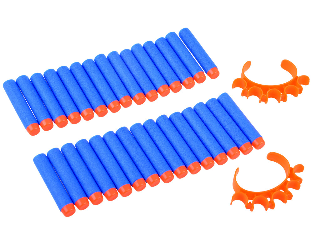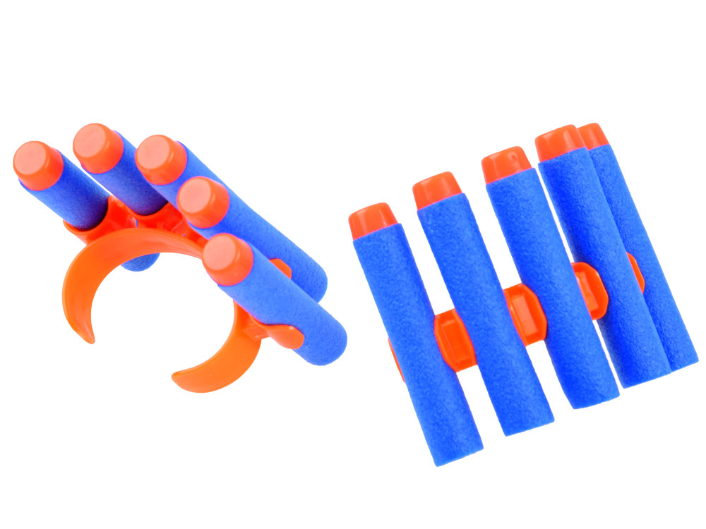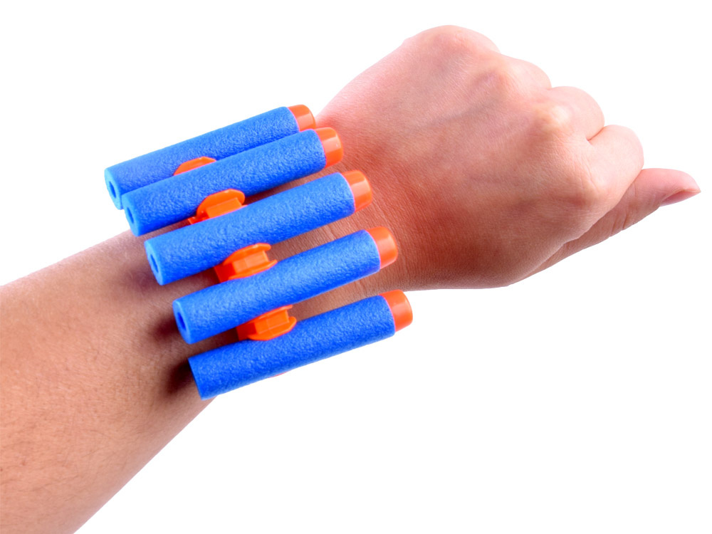 Sada pěnových nábojů do pistole nebo pušky vám umožní snadno doplnit chybějící munici. Můžeme si tak být jisti, že zábava nebude přerušena nedostatkem mušlí. Kazety jsou vyrobeny z pružné pěny, kterou lze snadno ohýbat, a jsou zakončeny bezpečnou gumovou špičkou. Abyste měli zásobu nábojů neustále po ruce, jsou součástí balení dvě rukojeti, které se nasazují na zápěstí. Do každé z nich se vejde pět kazet.