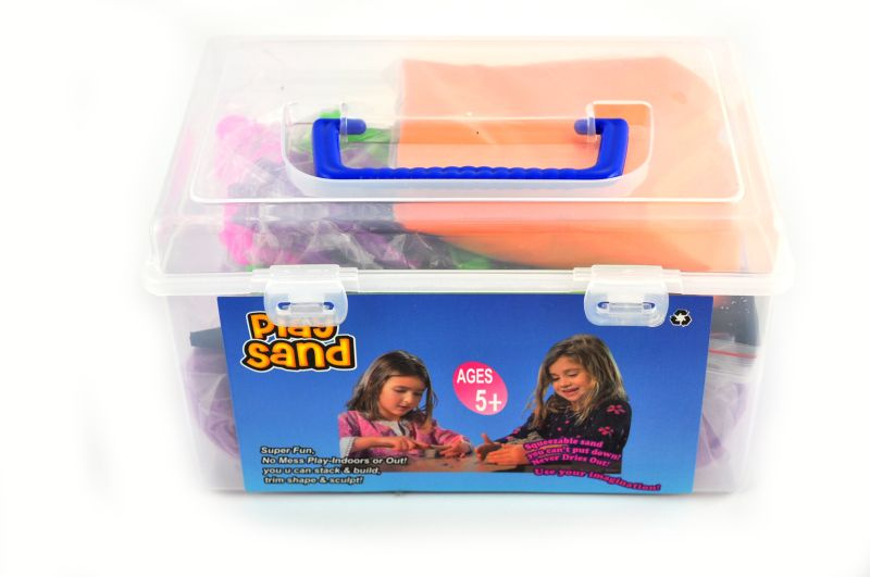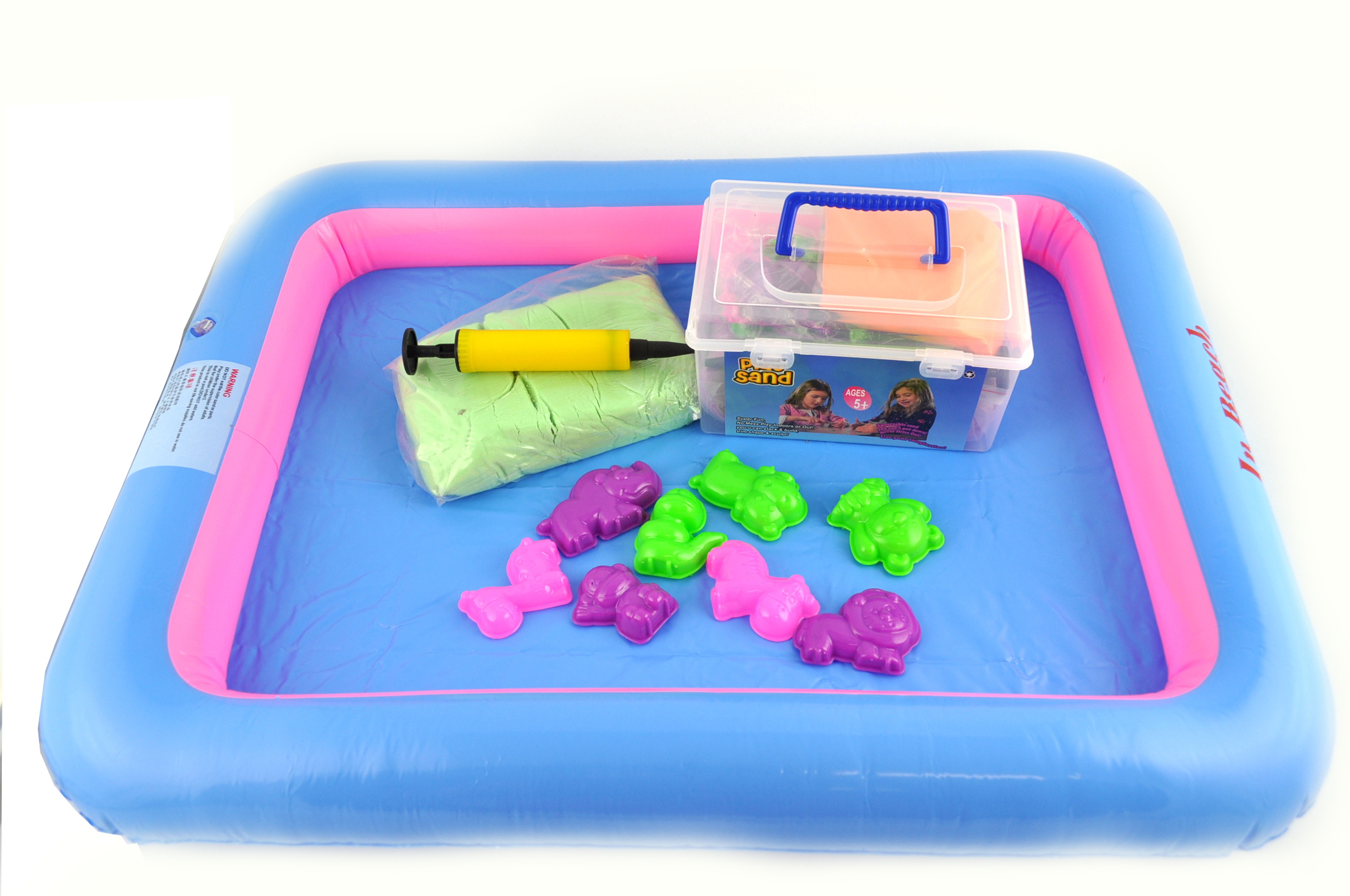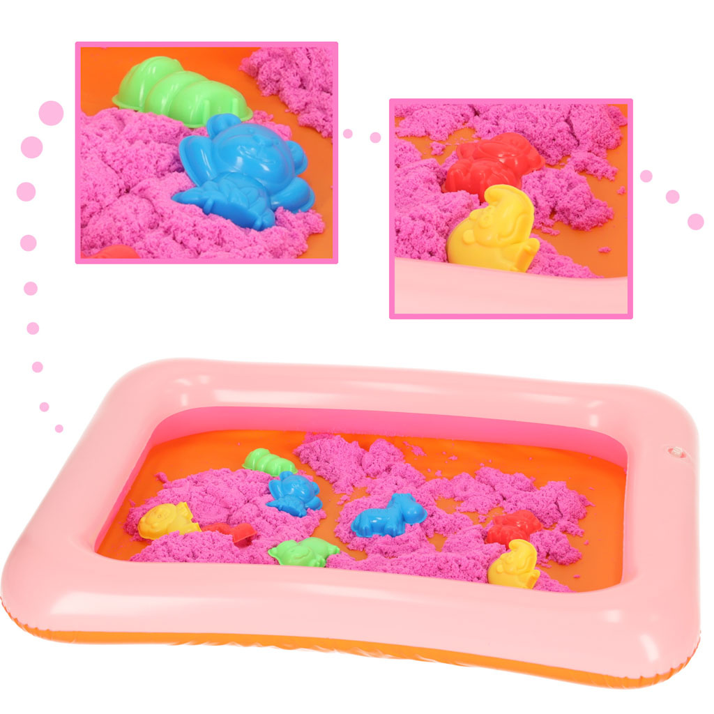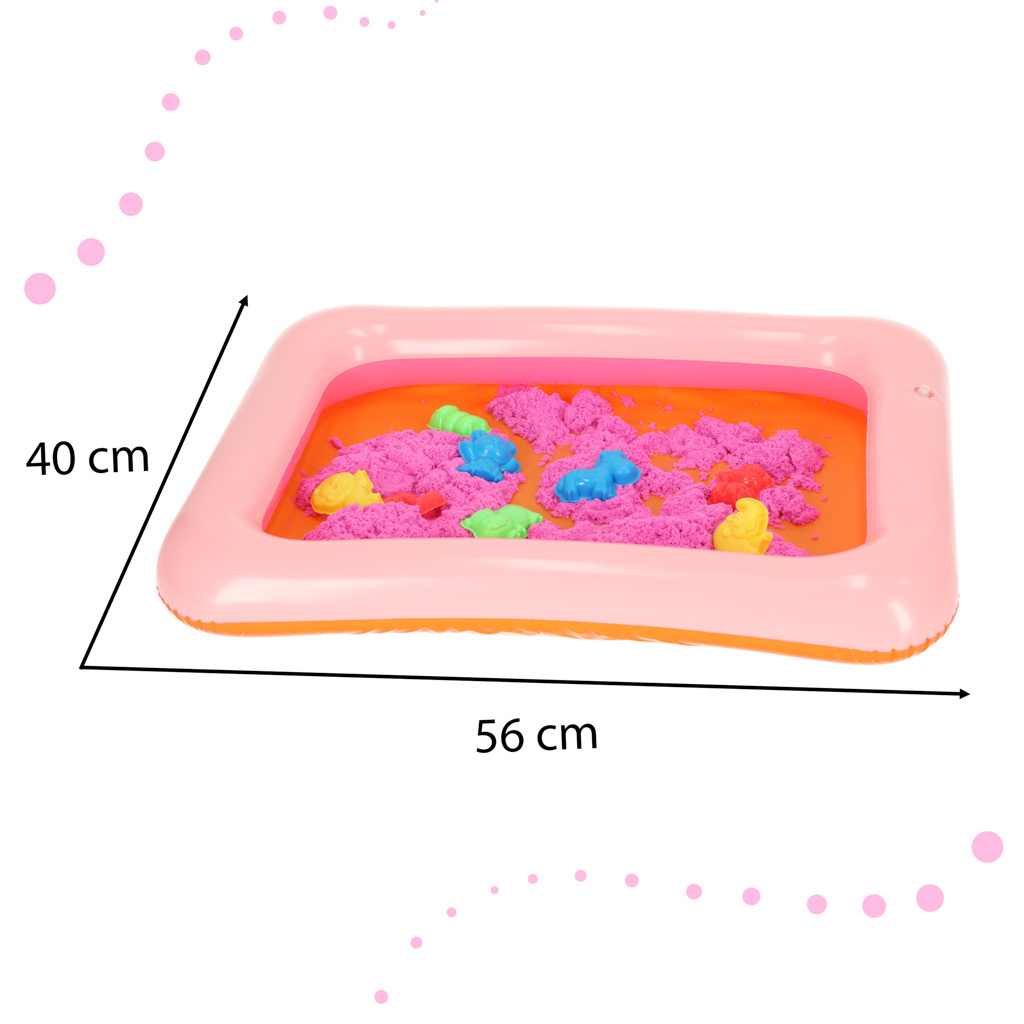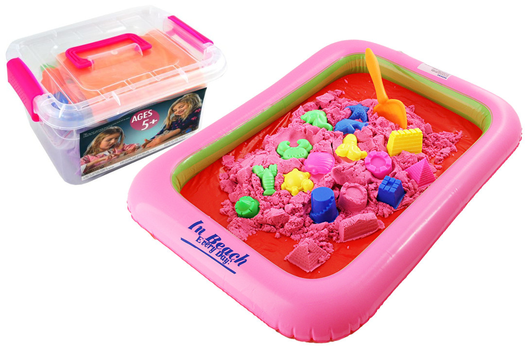 XL sada obsahuje kinetický písek, 8 druhů báboviček, nafukovací pískoviště o rozměru 60 x 44 x 7,5 cm .