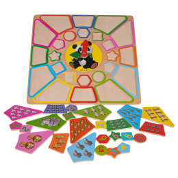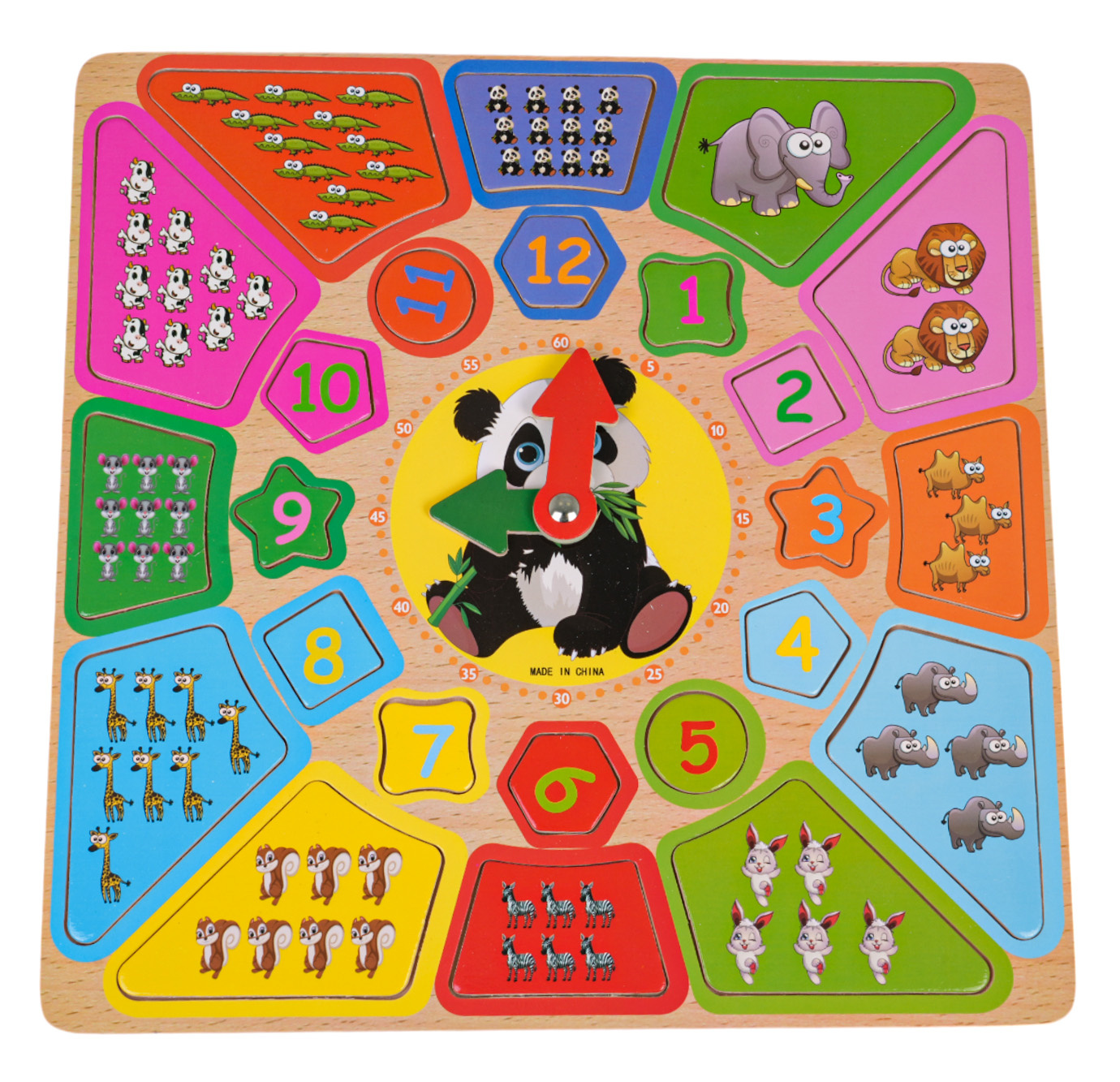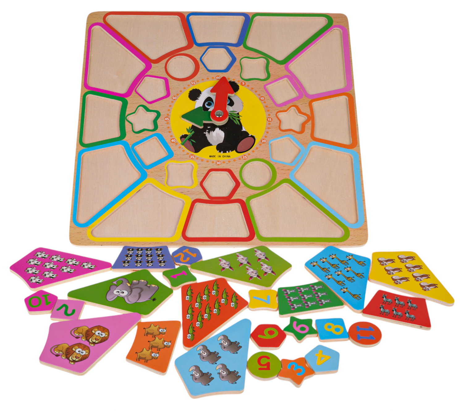 Vzdělávací sada pro učení času, počítání a přiřazování tvarů. Sada se skládá z barevné desky, na které se v centrální části nachází hodiny s pohyblivými ručičkami. Dále máme třídič tvarů s arabskými číslicemi od 1 do 12 a třídič tvarů s obrázky zvířátek. Dítě nastavuje konkrétní čas na hodinách, přiřazuje konkrétní arabskou číslici k tomuto času a konkrétní počet zvířátek. Celá sada byla vyrobena ze dřeva, natřena netoxickými barvami v živých barvách.