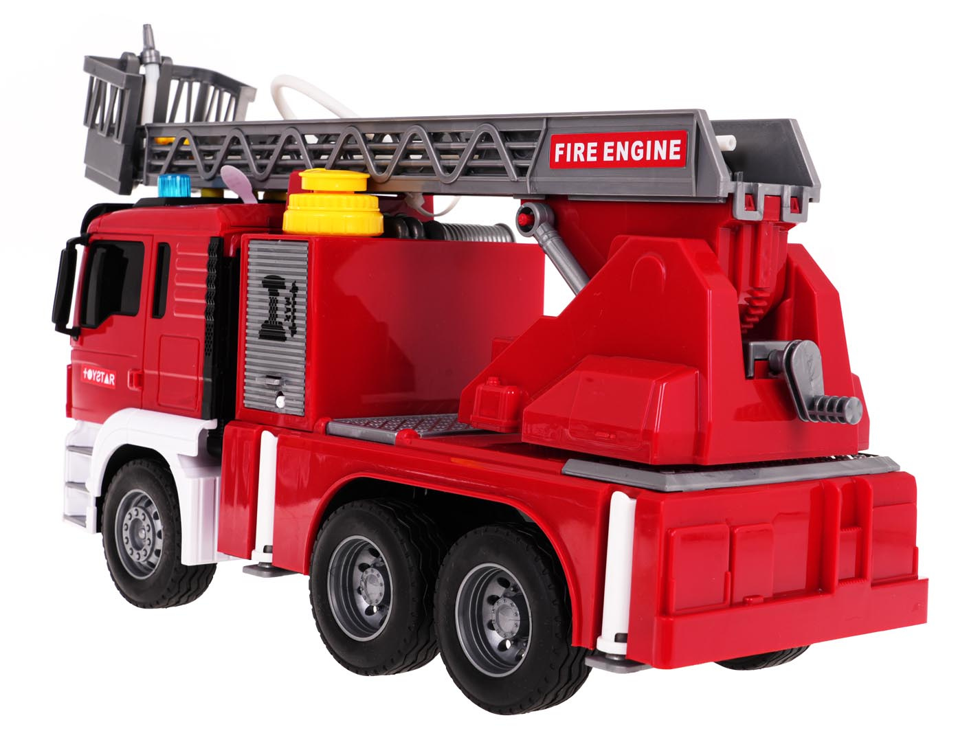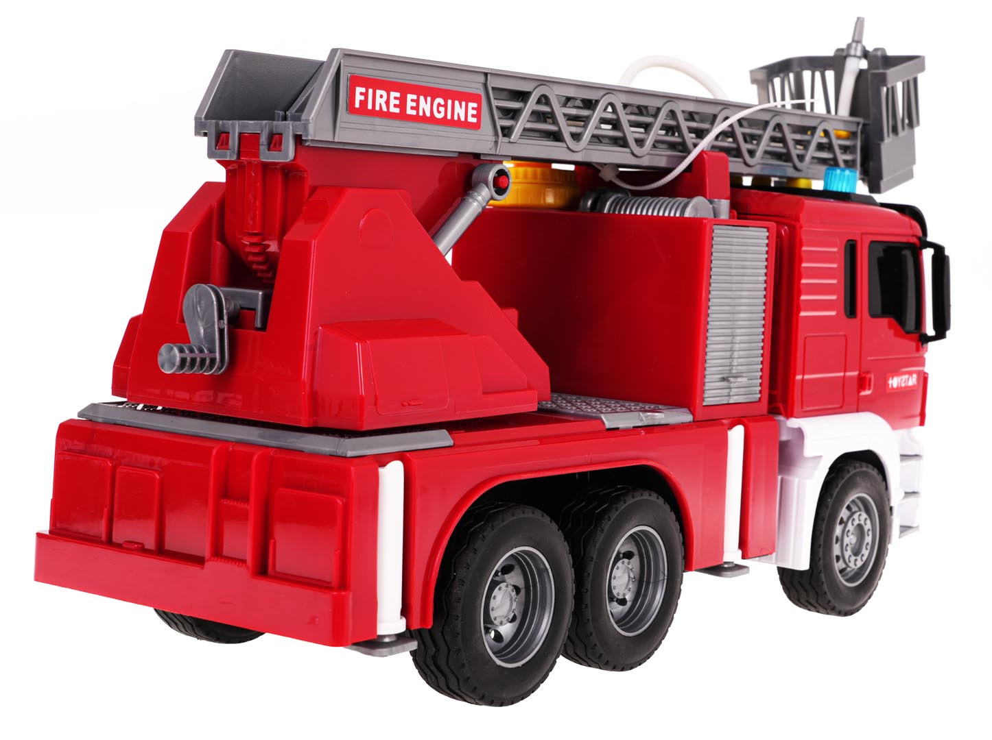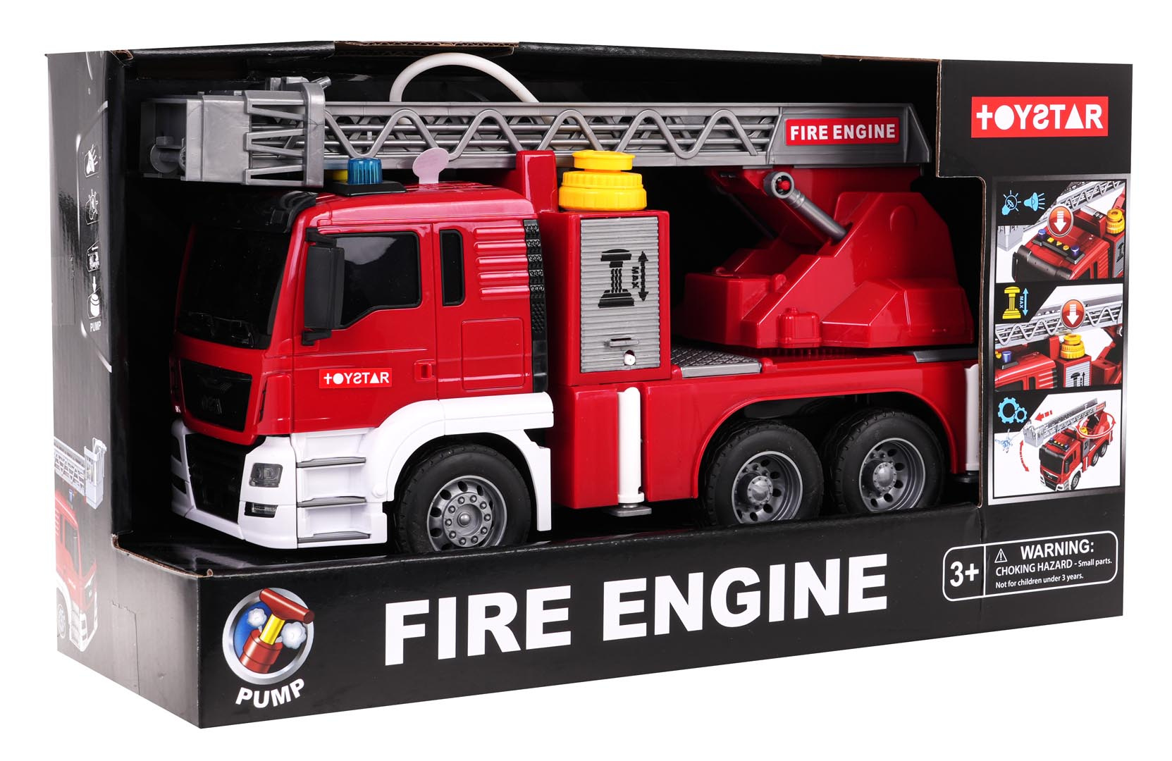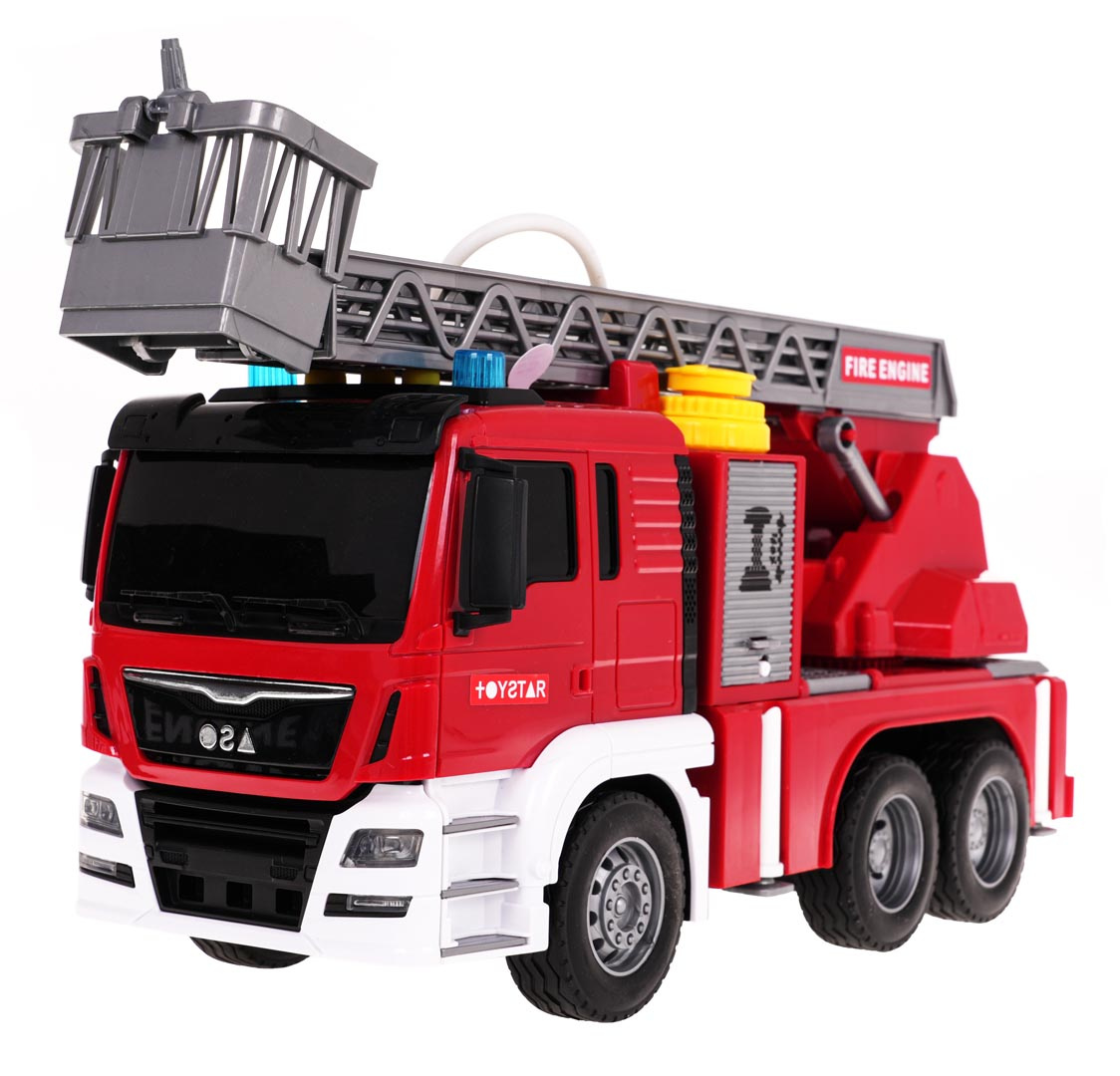 Interaktivní hasičský vůz s funkcí vody pro děti od 3 let. Chránič byl vyroben z plastu nejvyšší kvality v živých barvách. Má gumové pneumatiky, které dobře drží na povrchu, a pohon Friction. Na vrchu hasičského auta se nacházejí tlačítka zodpovědná za generování zvuků sirén, zvuků startování vozidla a chodu motoru. Po stranách zvukových tlačítek jsou také svítící světélka. Žebřík hasičského vozu můžeme zvedat a spouštět a vysouvat dopředu (manuálně). Po naplnění nádržky umístěné u kabiny vozidla vodou a stisknutí pumpičky bude z hadice vytékat voda. Hračka je napájena bateriemi typu 3 x AG13 (v balení).