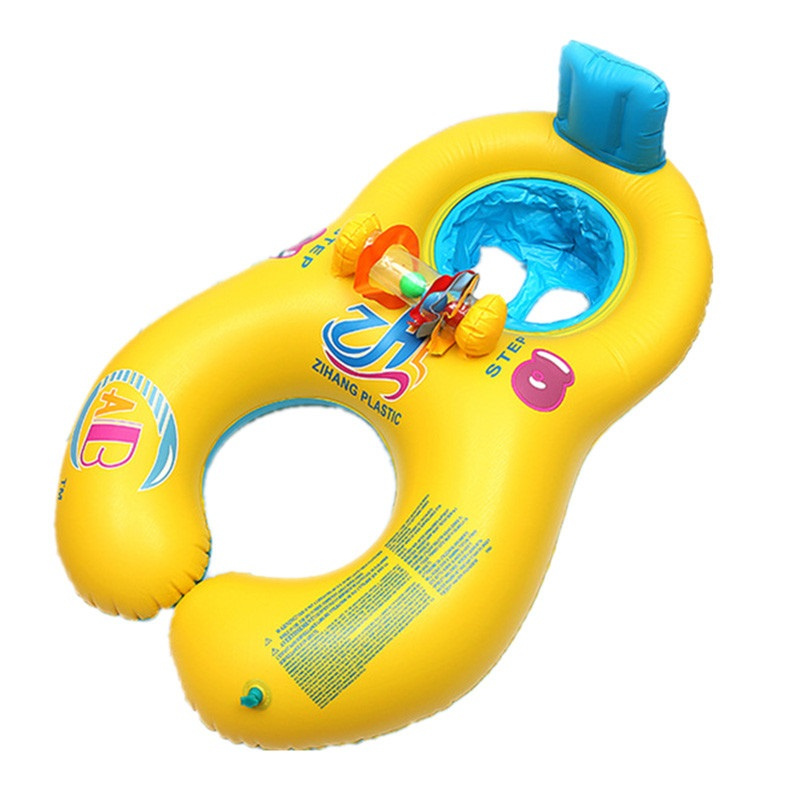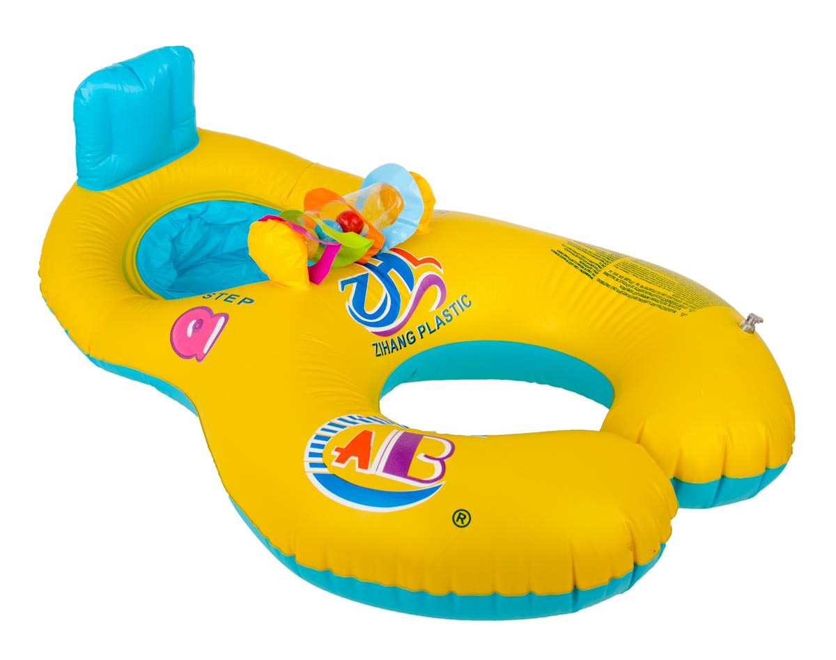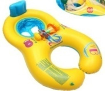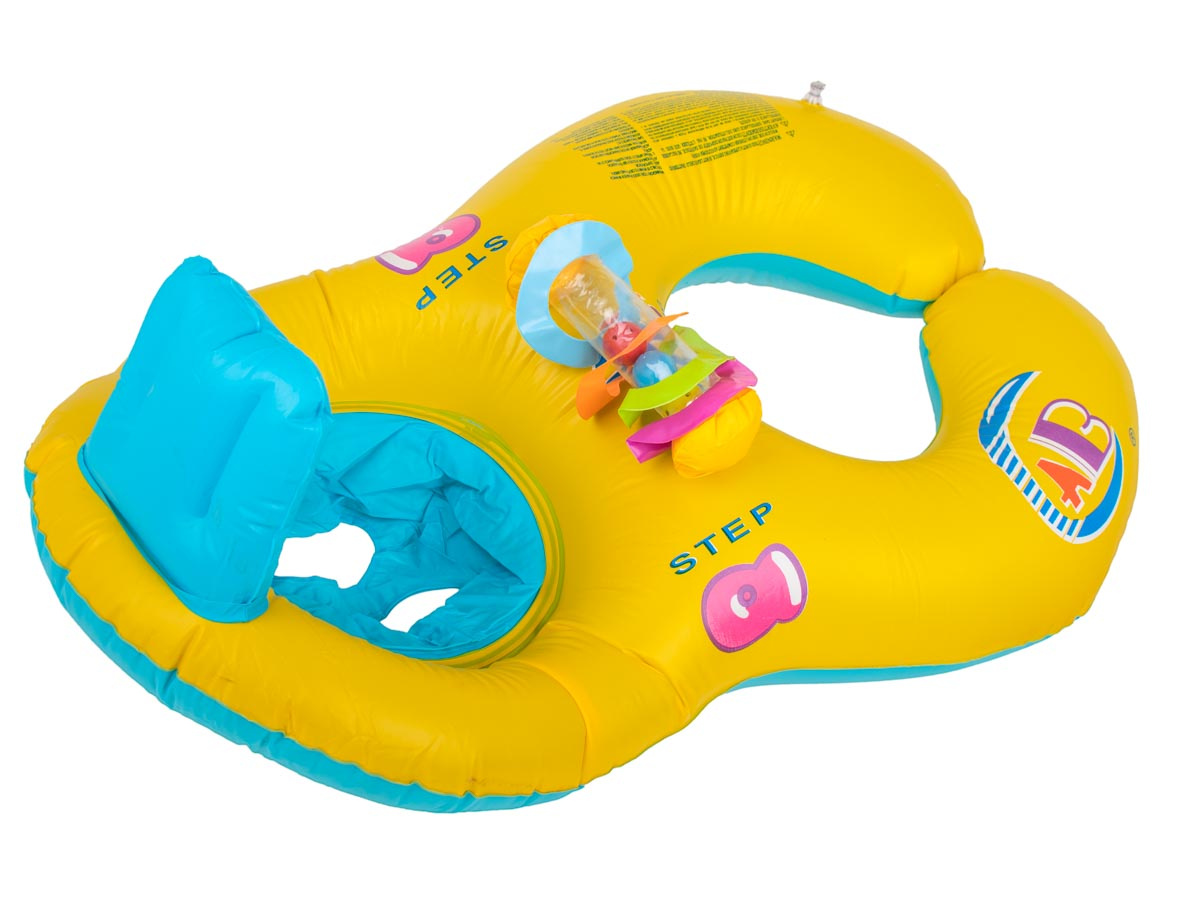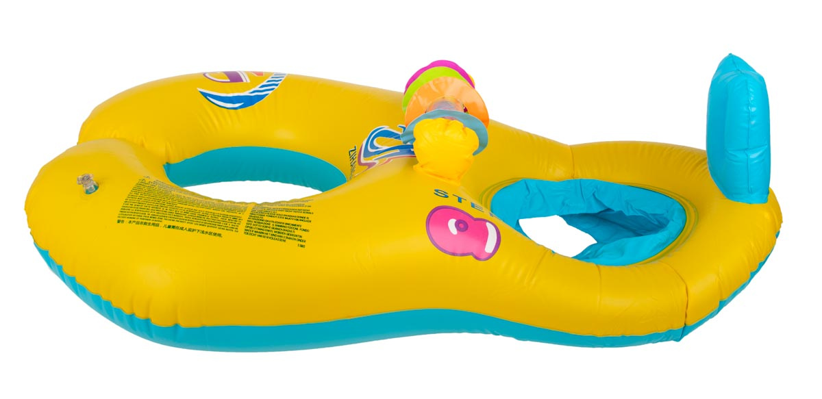 Nafukovací člun vybavený bezpečnou opěrkou zad a dvěma přihrádkami pro nohy dítěte. Barevná hračka upoutá pozornost batolete. Ponton má další sedadlo pro rodiče. Vyrobeno z plastu PVC. K dispozici ve žluté barvě. Rozměry: 83x60 cm.Celý popis