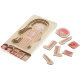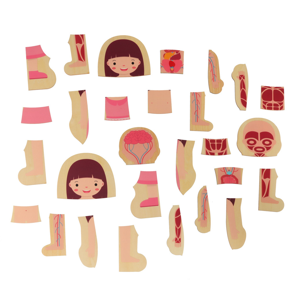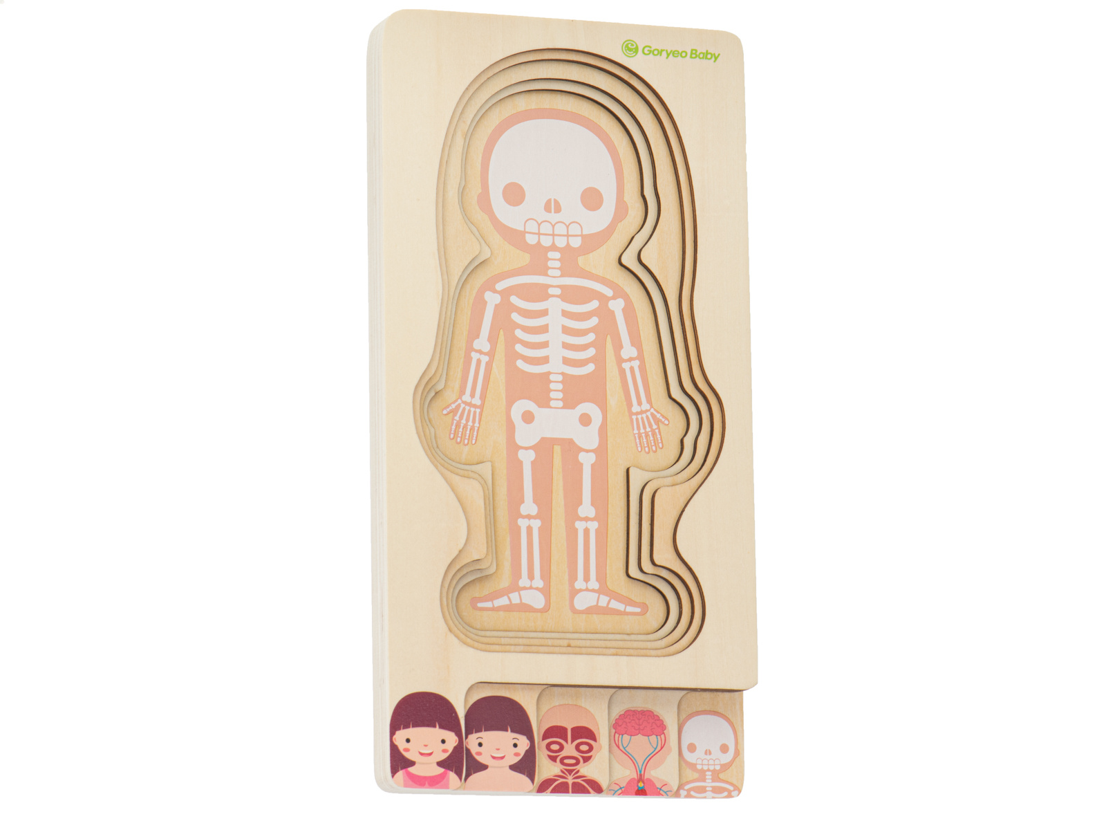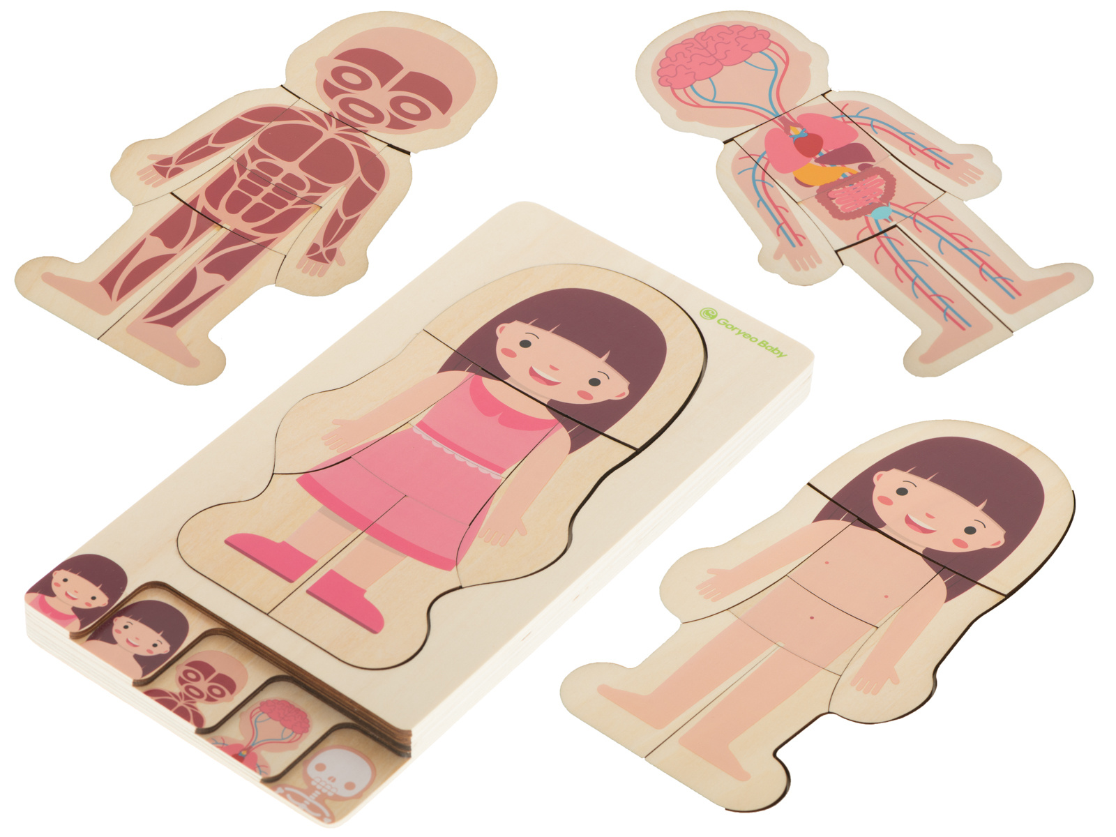 Kousky skládačky se překrývají ve vrstvách. Úkolem batole je uspořádat lidskou kostru, vnitřní orgány, svaly, tělo a nakonec oblečení do pořadí.