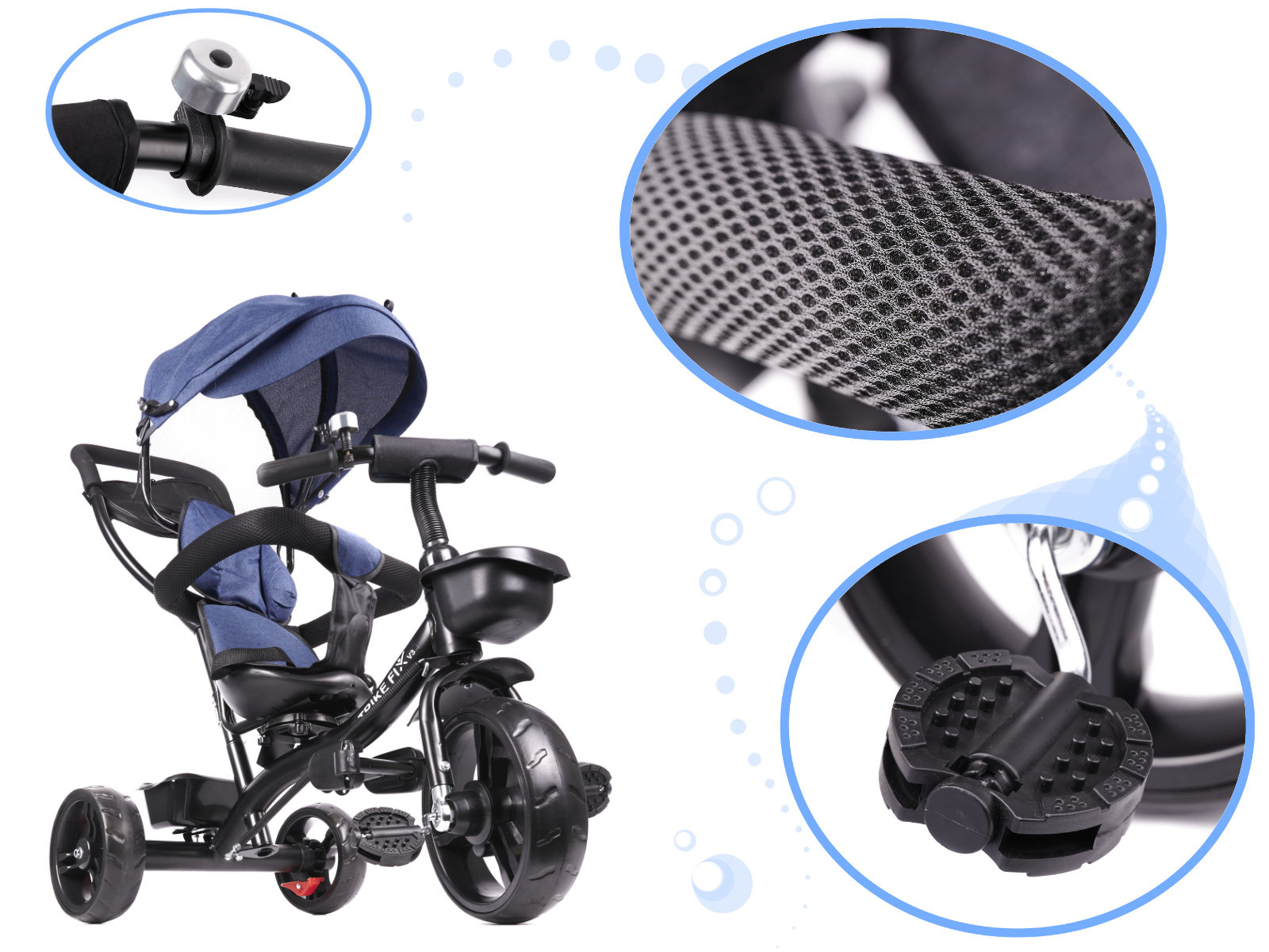 Určitě oceníte otočné sedadlo o 360 stupňů, které rodiče rádi používají na začátku používání tříkolky, aby se mohli na své dítě dívat nebo mu naopak při procházkách ukazovat svět. Výsuvná tyč umožňuje ovládání tříkolky. Jakmile vaše dítě plně zvládne jízdu na tříkolce a tyč již není potřeba, můžete jej snadno odstranit. Tříkolka je také vybavena zvonkem.