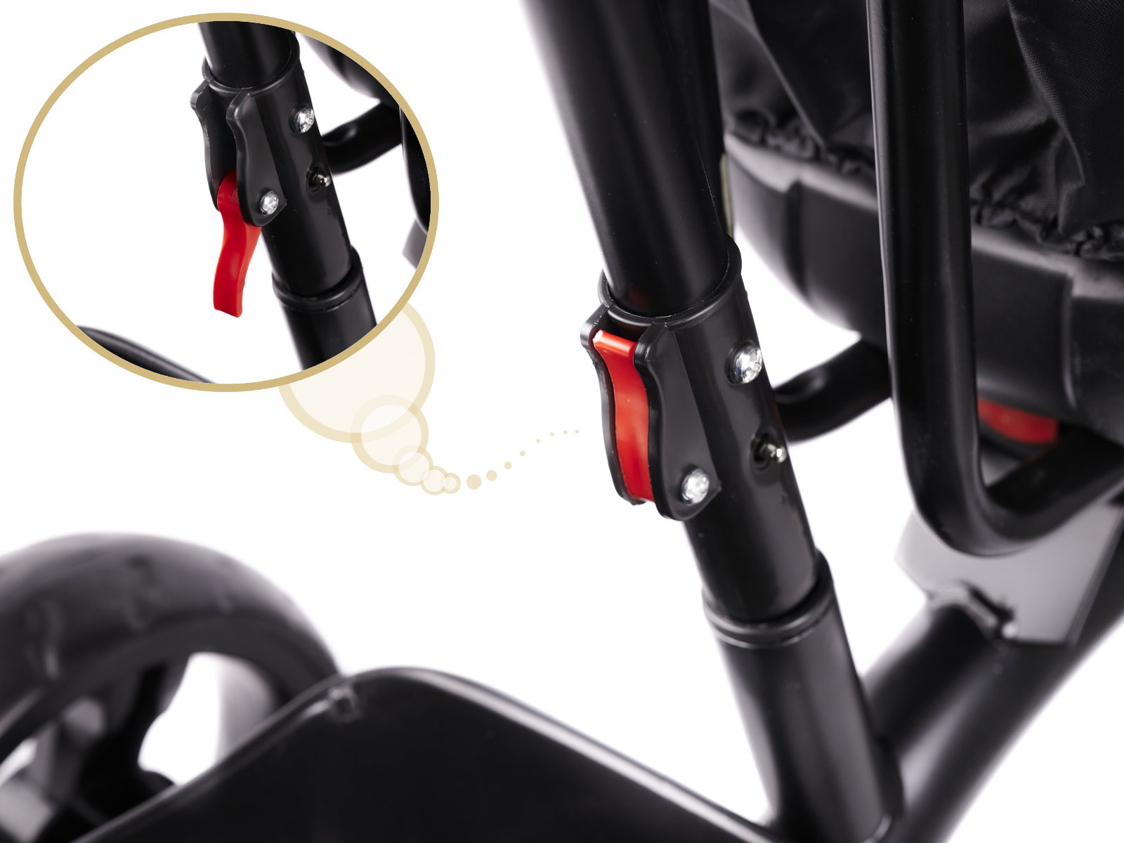 Tříkolka je vybavena sklopnou třístupňovou stříškou se sítí chránící před sluncem a deštěm (lze jí sundat). Skládající stříška lze snadno zajistit sponou. Vodící tyč je pokryta pěnovou ochranou pro plné pohodlí rodičů. Podobný materiál, dodatečně pokrytý sítí, byl použit k zajištění bezpečnostní zábrany.