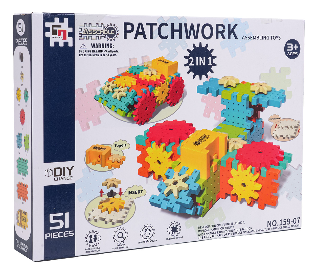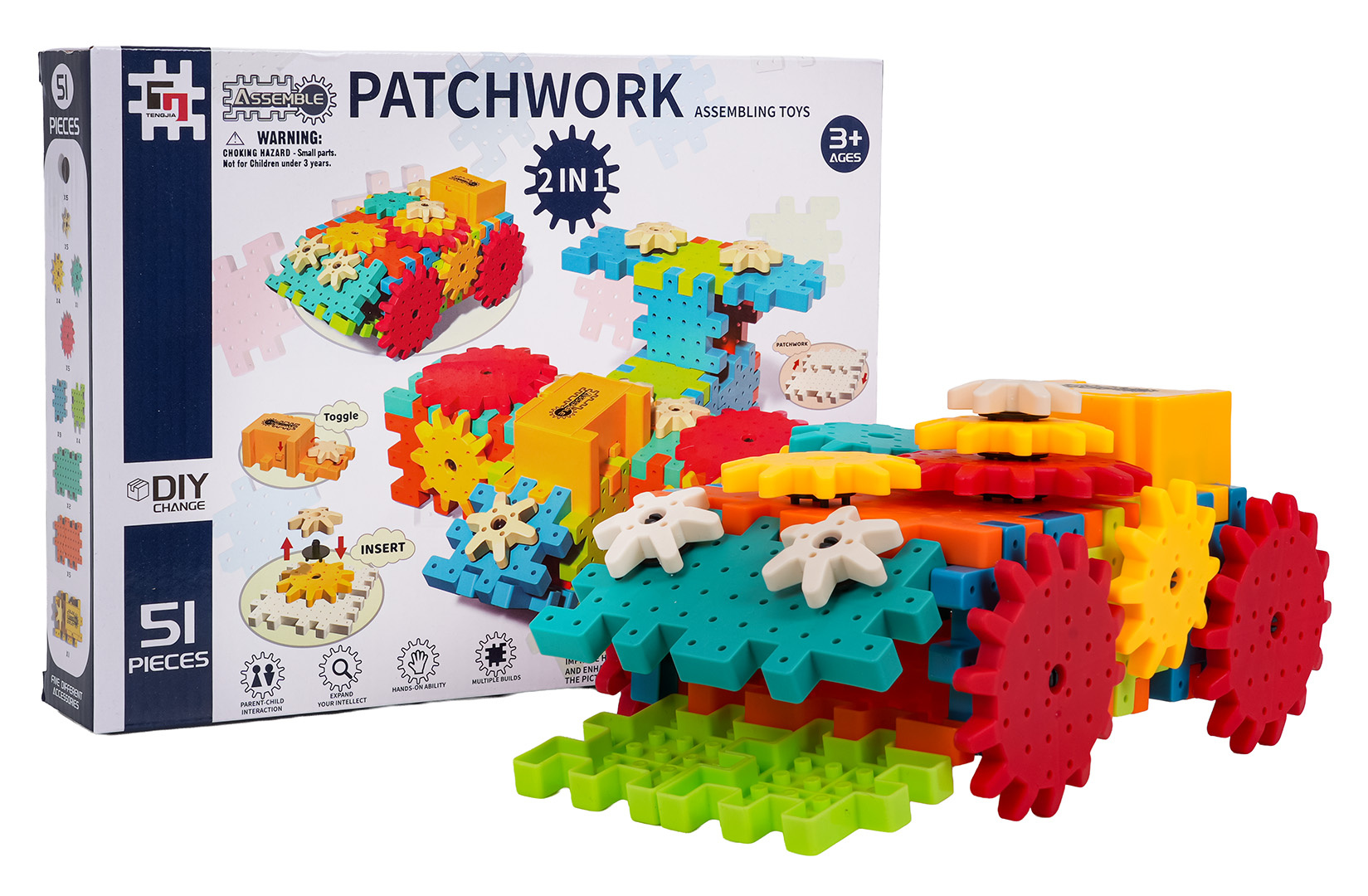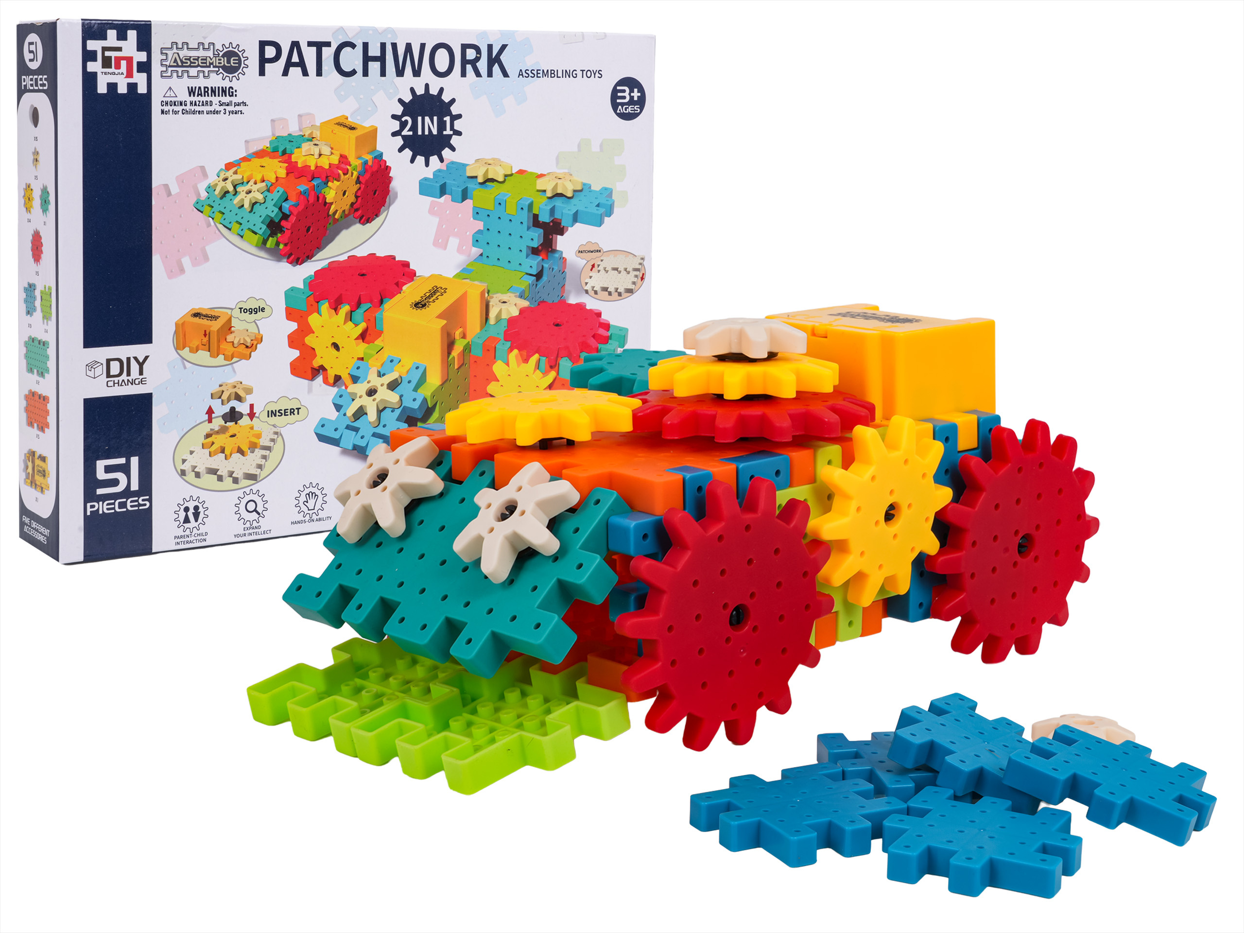 Sada kreativně-vzdělávacích kostek pro děti od tří let. Sada se skládá z 51 prvků, ze kterých může dítě postavit různé konstrukce. Skládání kostek STEAM rozvíjí kreativitu, kauzální myšlení a schopnosti řešení problémů. Dítě se naučí, jak jednotlivé prvky ovlivňují celkovou konstrukci. Otáčení jedním ozubeným kolem uvádí do pohybu ostatní kola, což v dítěti vzbuzuje zvědavost a zájem. Dítě si rozvine schopnost plánování a prostorové vizualizace. Sada obsahuje motorek napájený bateriemi 2 x AA 1,5V (baterie nejsou součástí balení).
