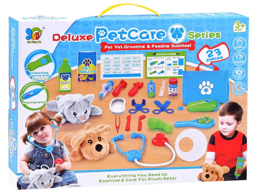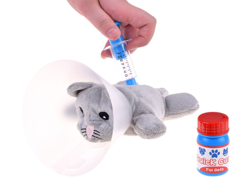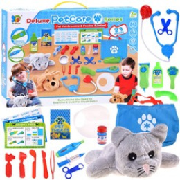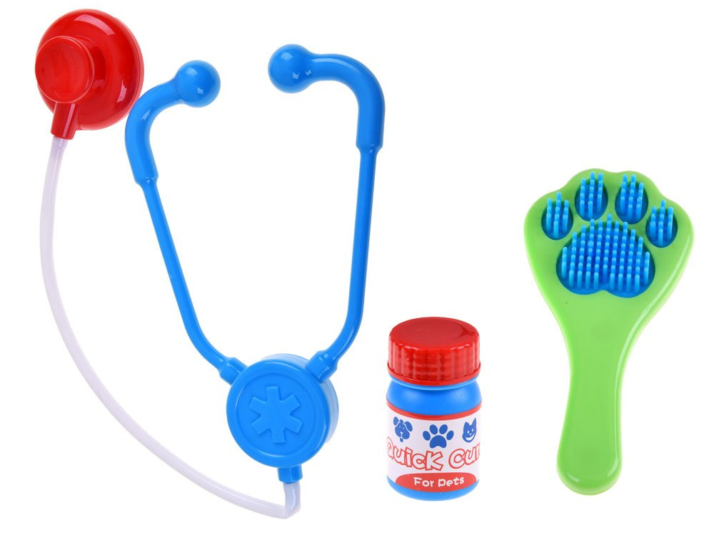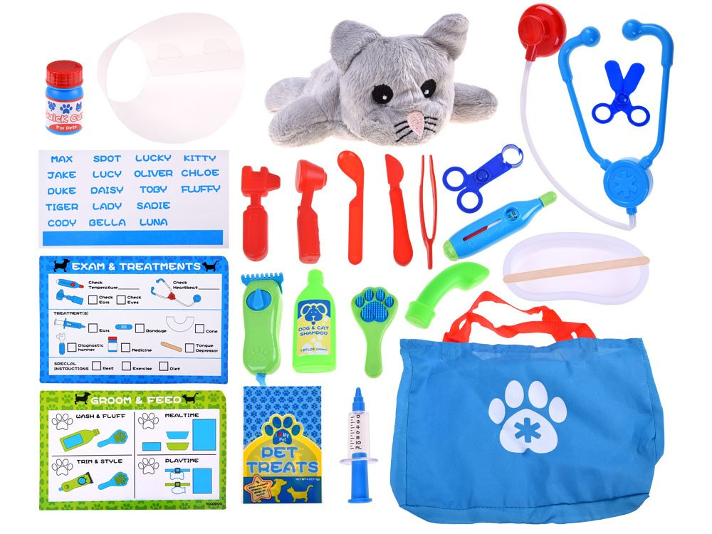 Tato výuková sada pro mladého veterináře bude užitečná při pomoci plyšovým maskotům, koťatům, psům a medvídkům.