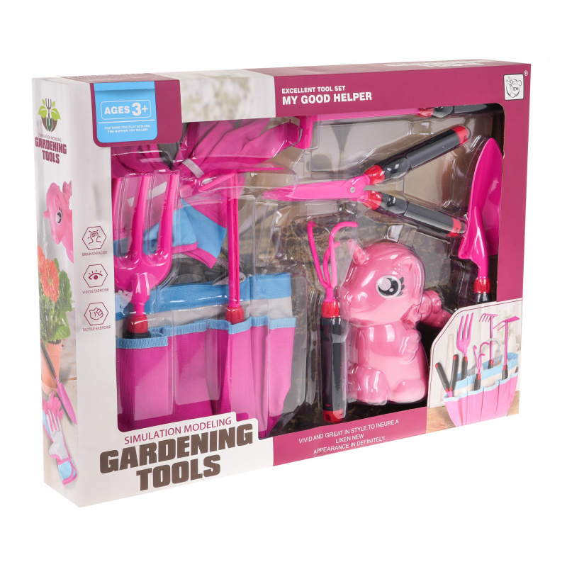 | - brašna na nářadí, - rukavice, - konev ve tvaru jednorožce, - nůžky, - vidlice - stěrka, - ruční kultivátor, - hrábě, - motyka |